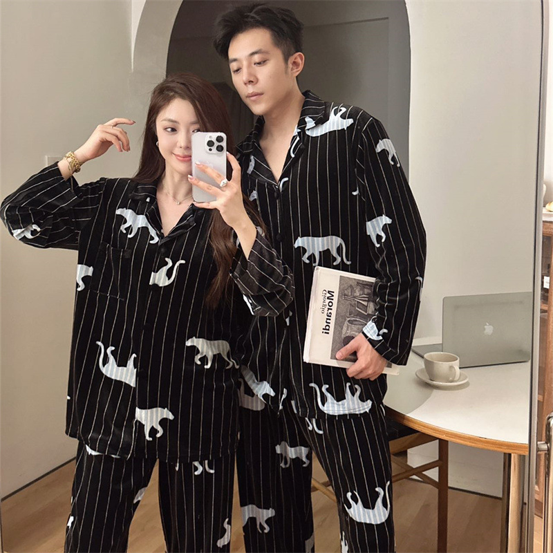 가을 겨울 스트라이프 섬섬유 커플 잠옷 여성용 고급 따뜻한 산호섬유 남성용 인터넷 인기 스타일 홈웨어 세트스토어 가기