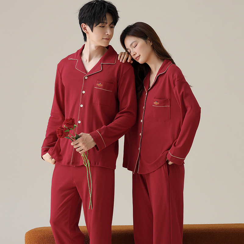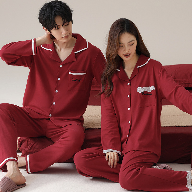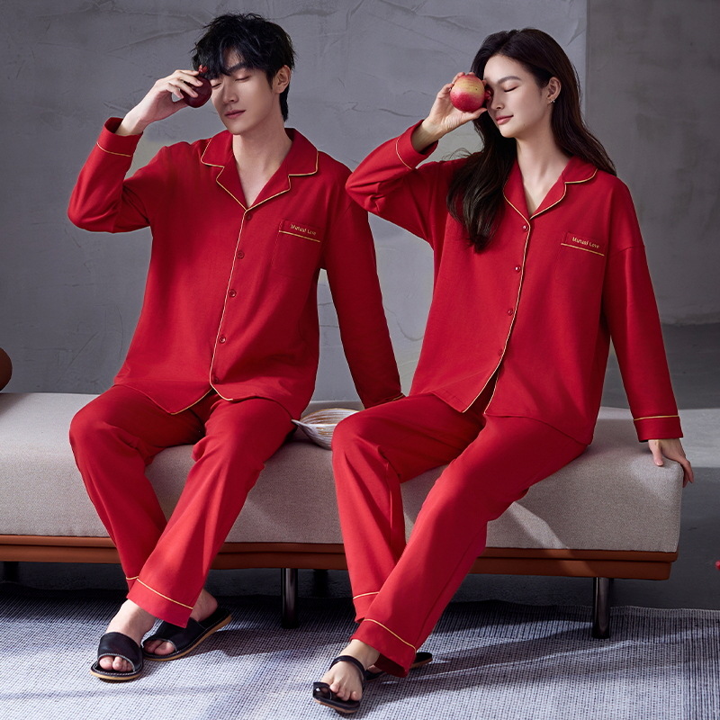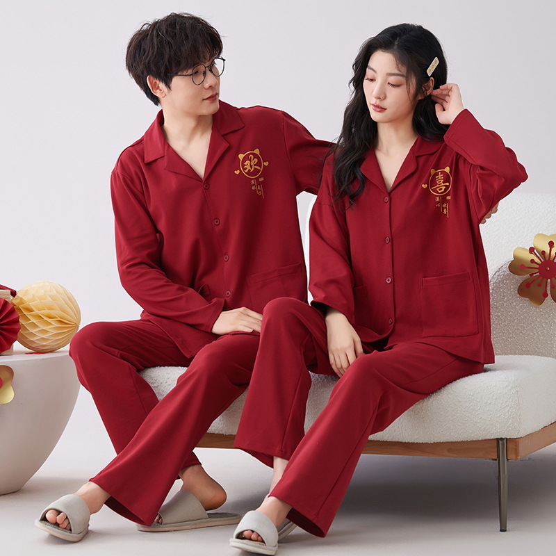 사슴 가슴 패드 레드 파자마 여성의 봄과 가을 결혼식 신혼 부부의 순면 홈 옷 남자 생활 년 세트스토어 가기