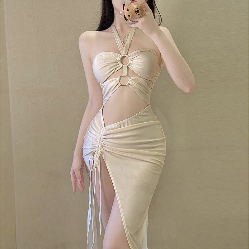 2024 새로운 스플릿 스커트 트라이앵글 수영복 여성 슬림하고 섹시한 꽉 끼는 등이없는 해변 리조트 온천 수영복스토어 가기