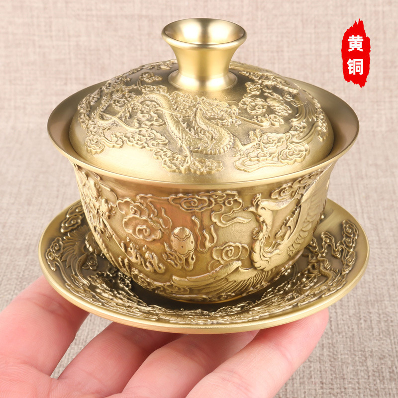 황동 드래곤과 피닉스 청샹 티 보울 3 피스 세트 장식품 창조적 인 차 세트 홈 티 컵 핸드 헬드 보울 티 컵 골동품 청동스토어 가기