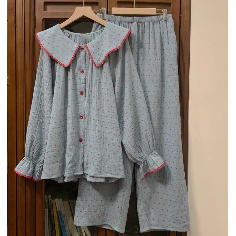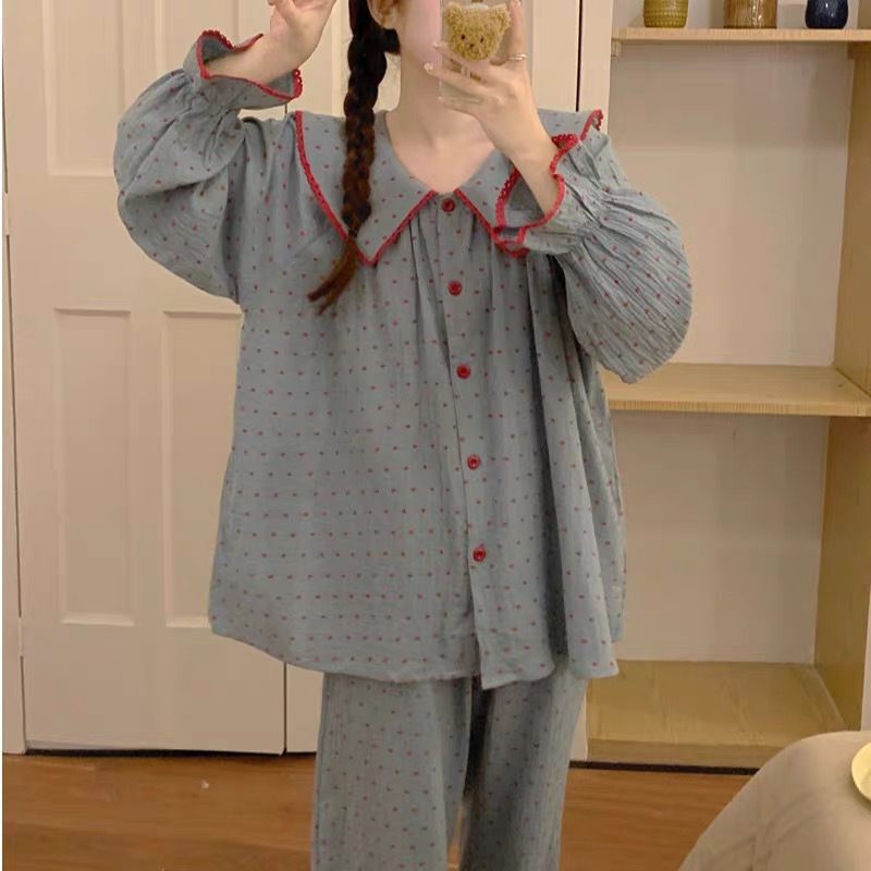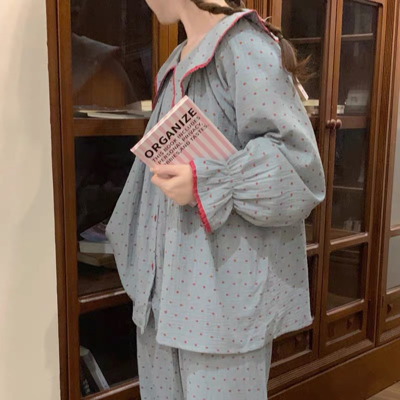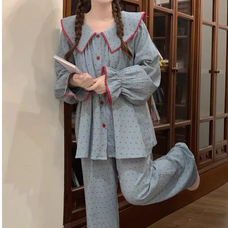 초가을 2024 한국 스타일 Ins 소녀 나이 감소 레트로 블루 루즈 레이스 달콤한 귀여운 홈 의류 파자마 세트