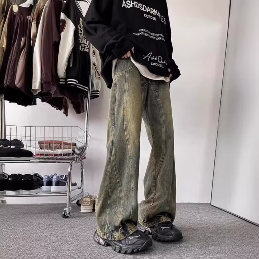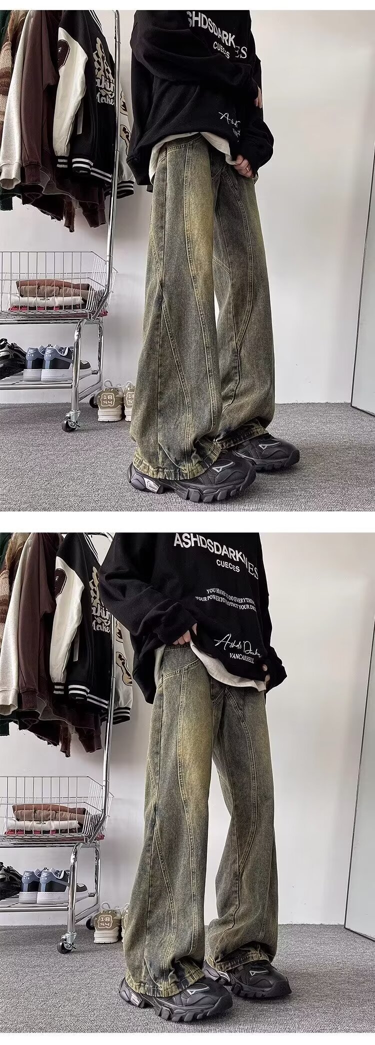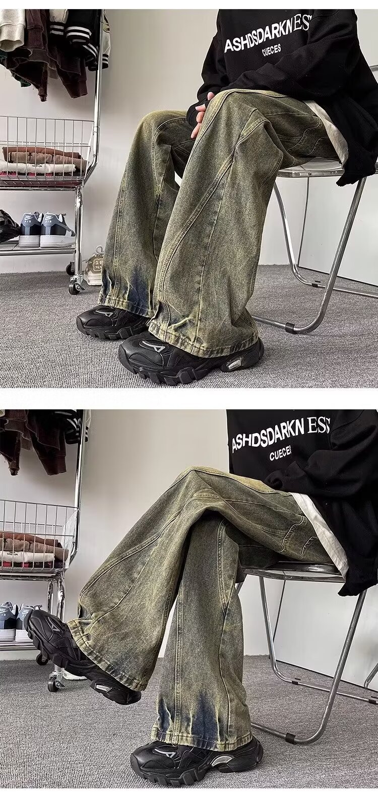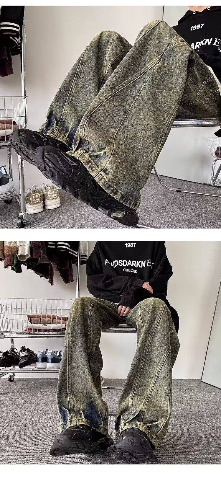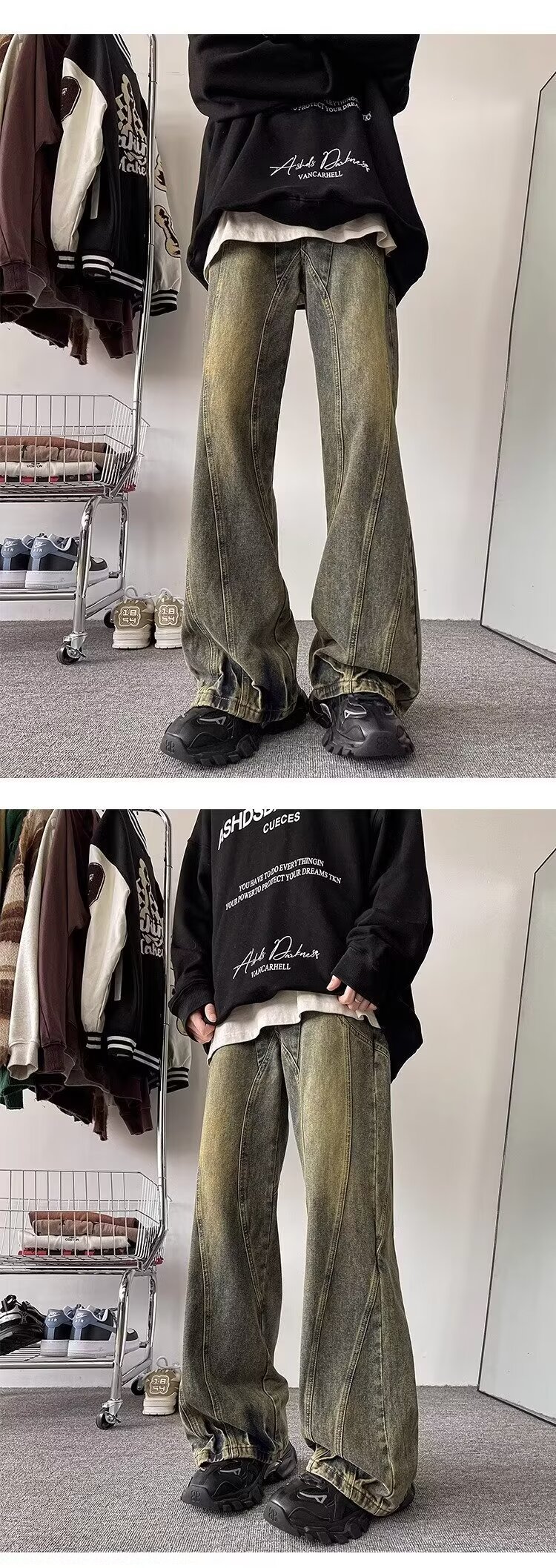 미국 스타일의 복고풍 하이 스트리트 분위기 디자인 감각 구조 고민 노란색 진흙 염색 청바지 남성용 트렌디 한 넓은 다리 마이크로 팬츠
