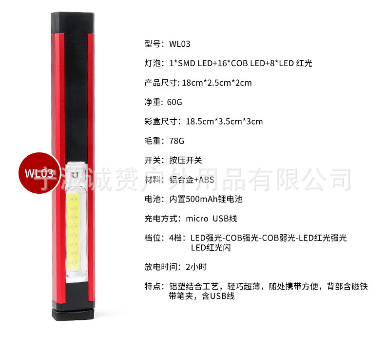 档位:4档:LED强光-COB强光-COB弱光-LED红光强光-LED红光闪