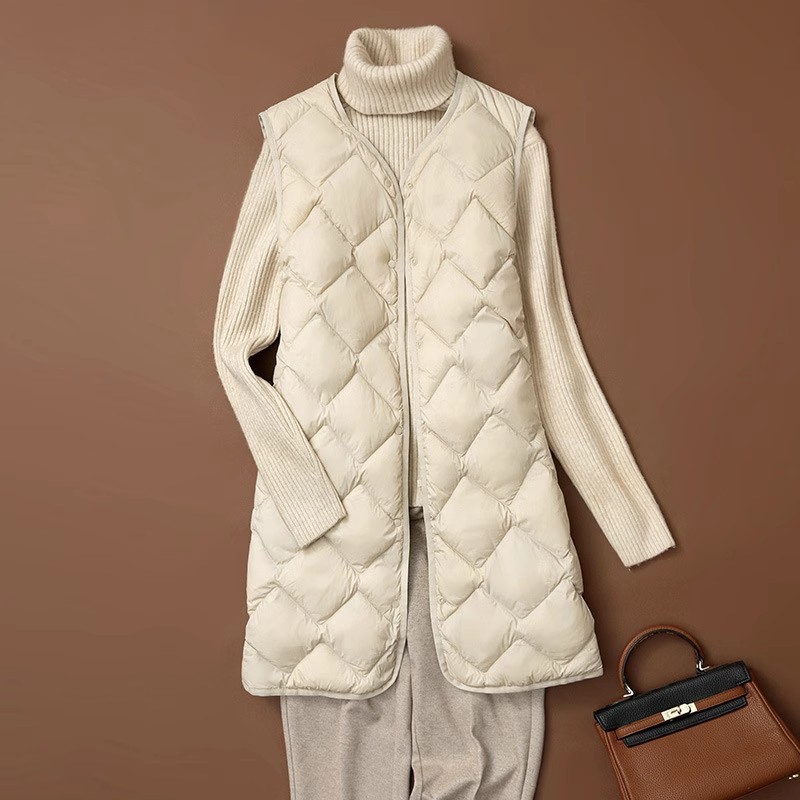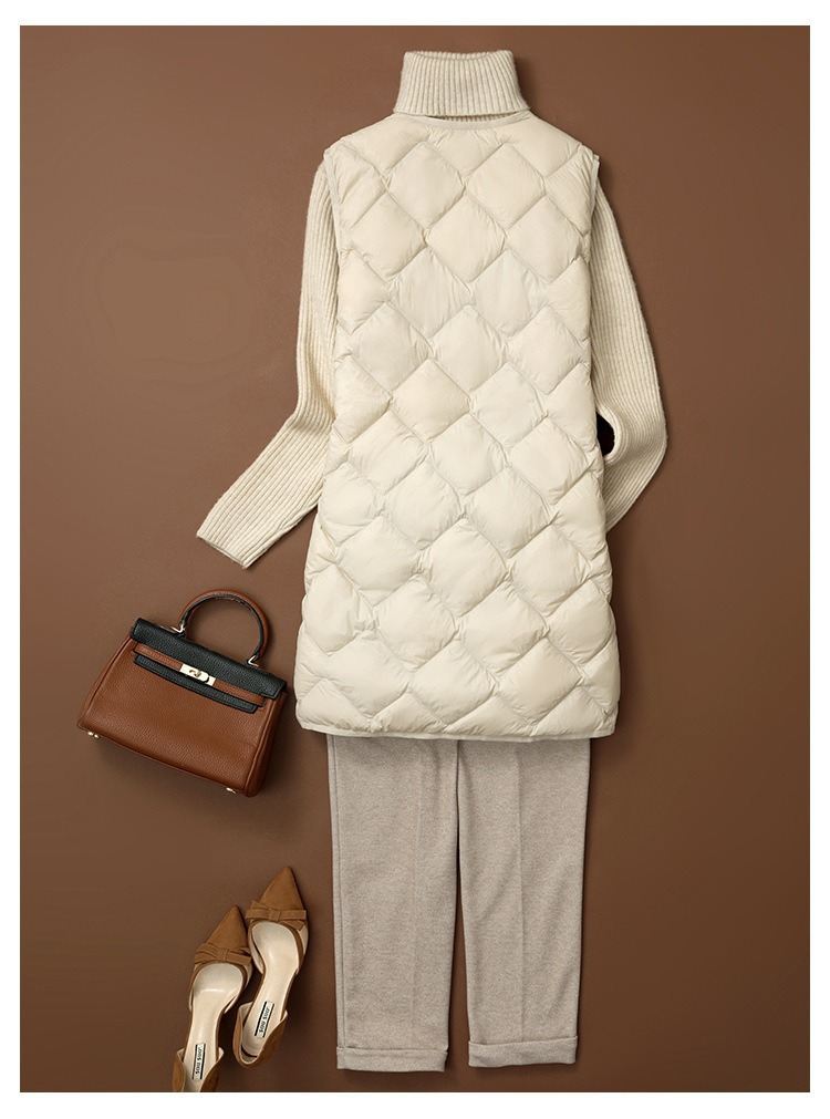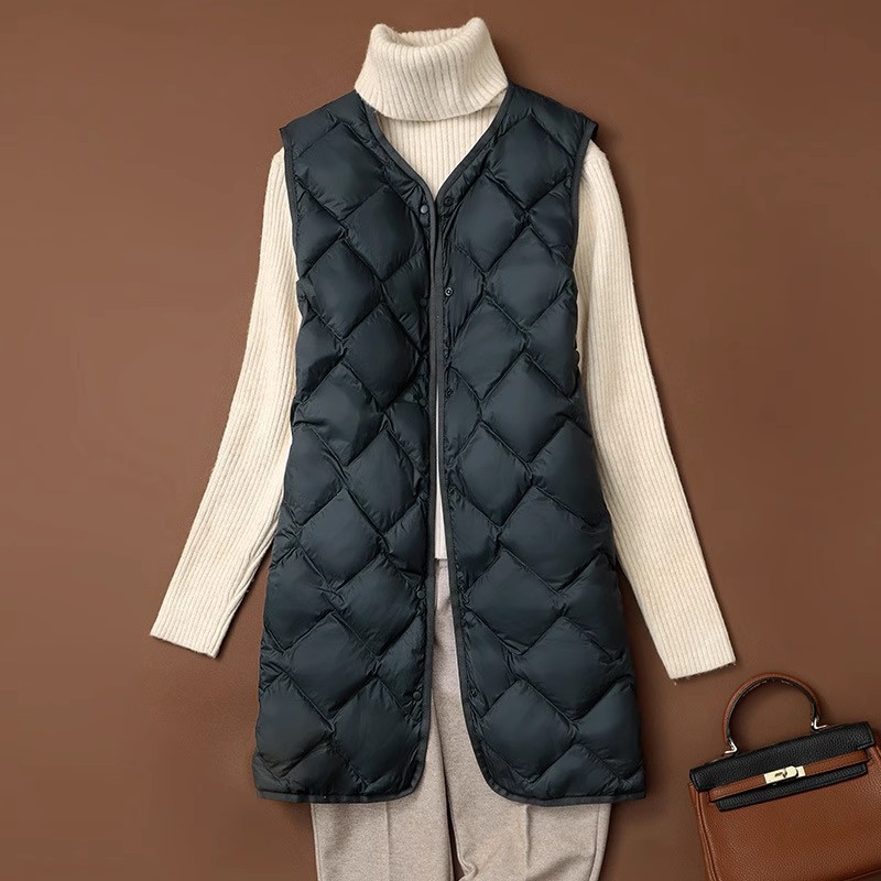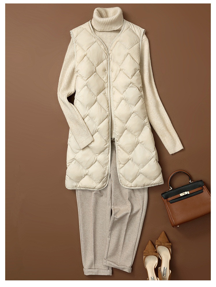 가을과 겨울 중간 길이의 라이트 다운 조끼 여성의 V 넥 라이너 마름모티브 라이트 조끼 느슨한 캐주얼 따뜻한