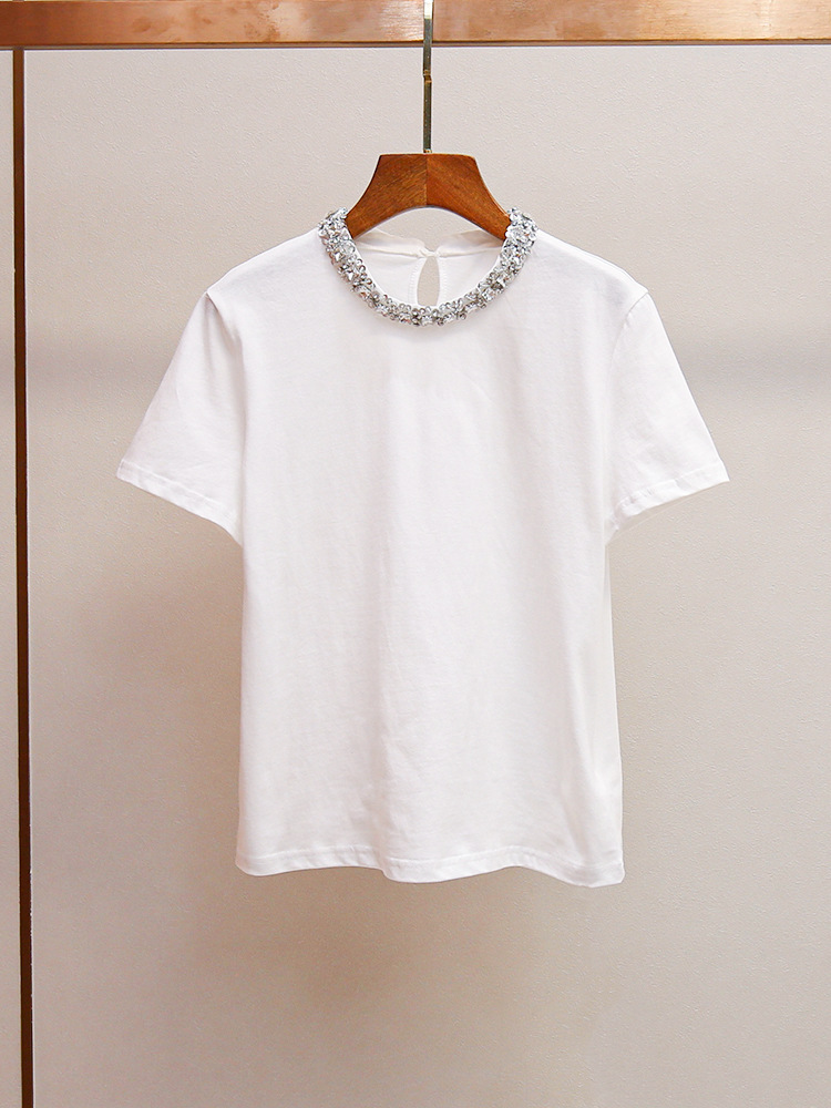 M 가족 가을 새로운 프랑스 기질 하이 엔드 중공업 다이아몬드 스터드 조커 코튼 숄더 짧은 소매 티셔츠 최고 여성