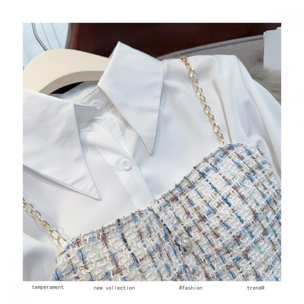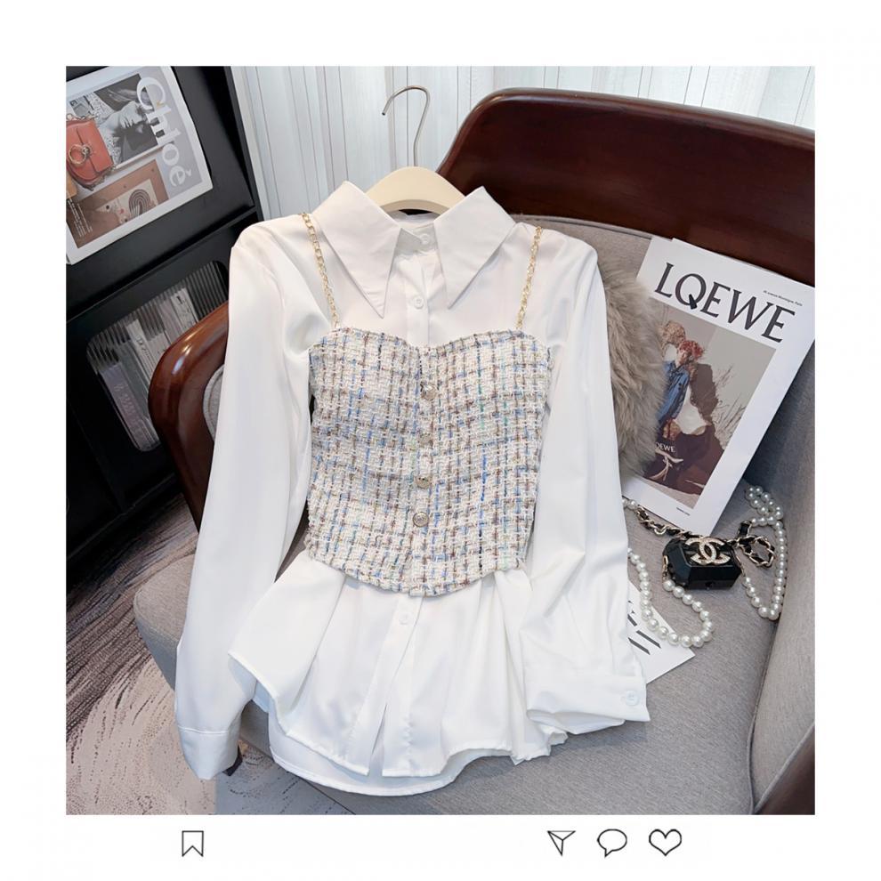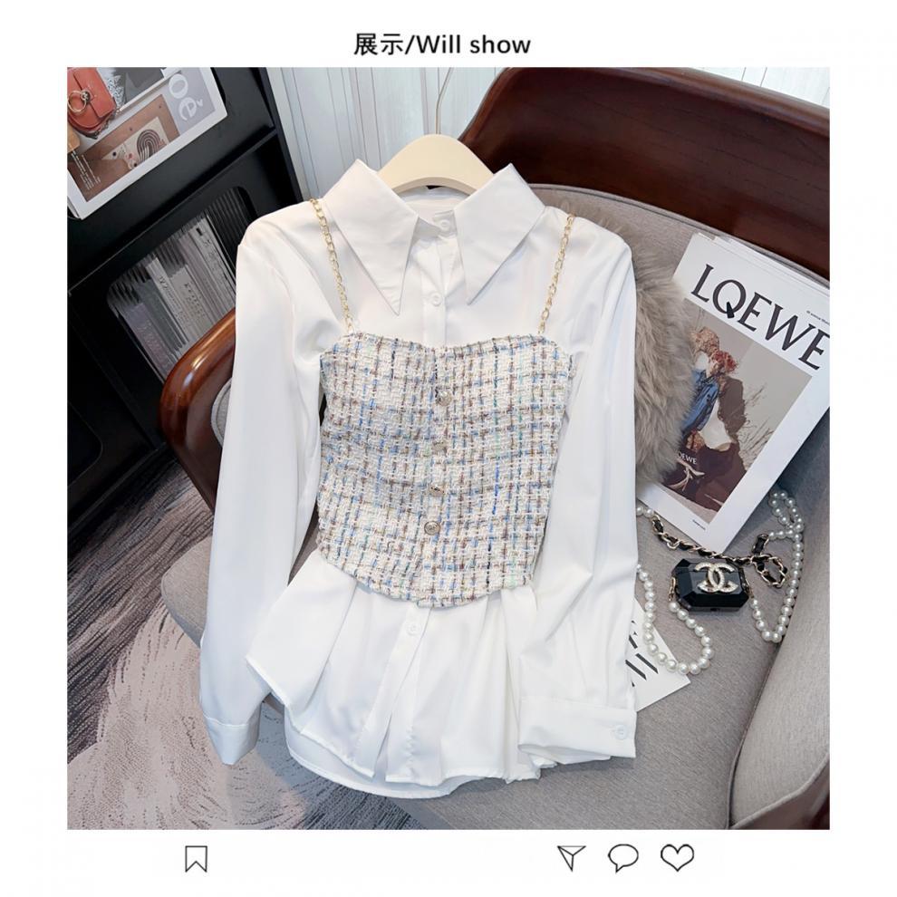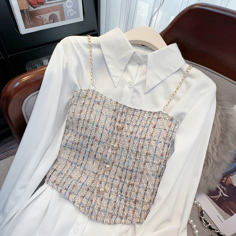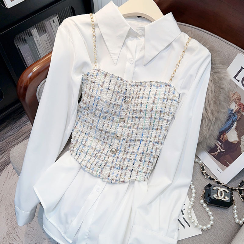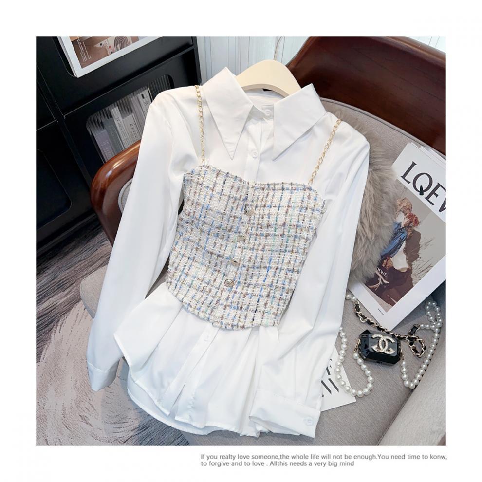 샤넬 스타일 격자 무늬 카미솔 여성의 봄과 여름 새로운 의상 디자인 틈새 화이트 셔츠 탑 투피스 세트