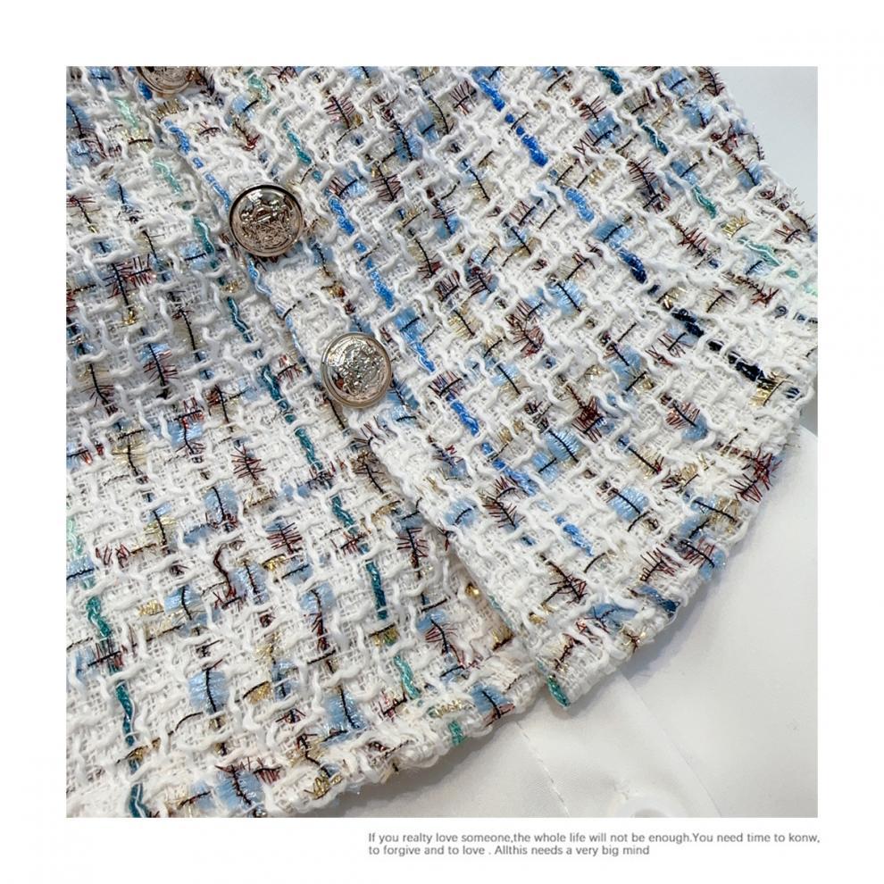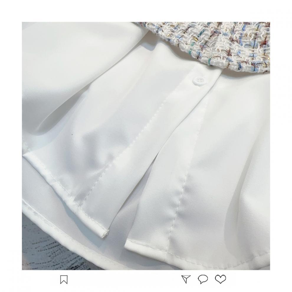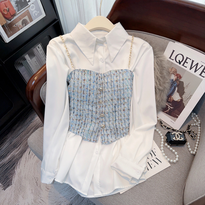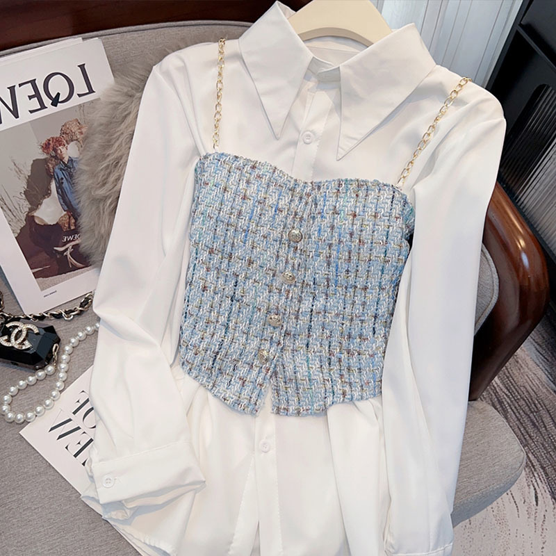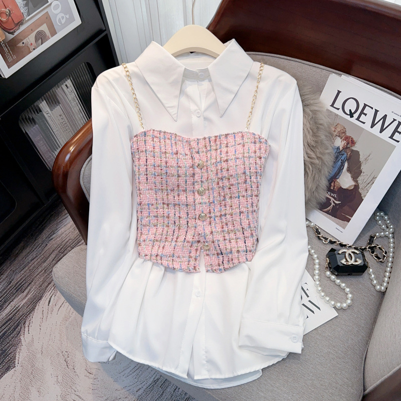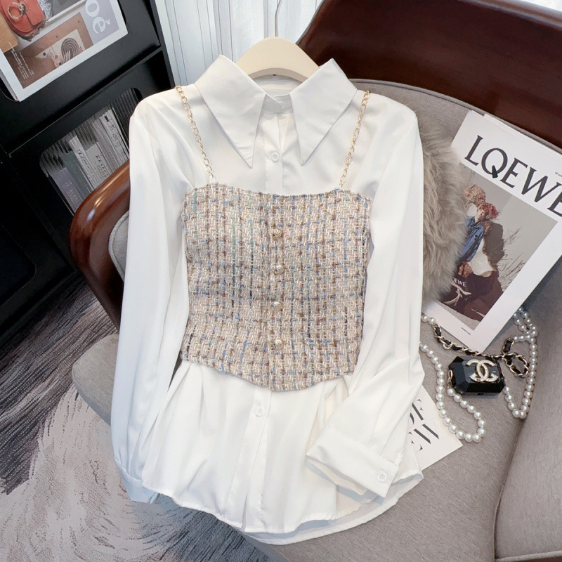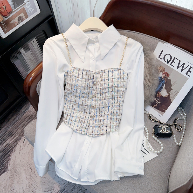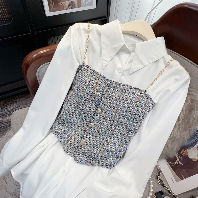 샤넬 스타일 격자 무늬 카미솔 여성의 봄과 여름 새로운 의상 디자인 틈새 화이트 셔츠 탑 투피스 세트