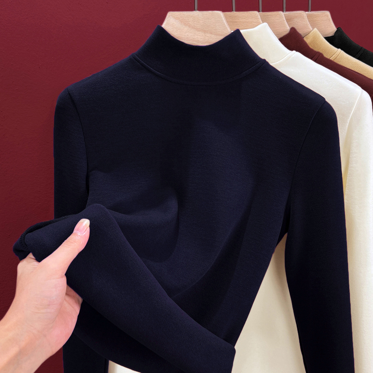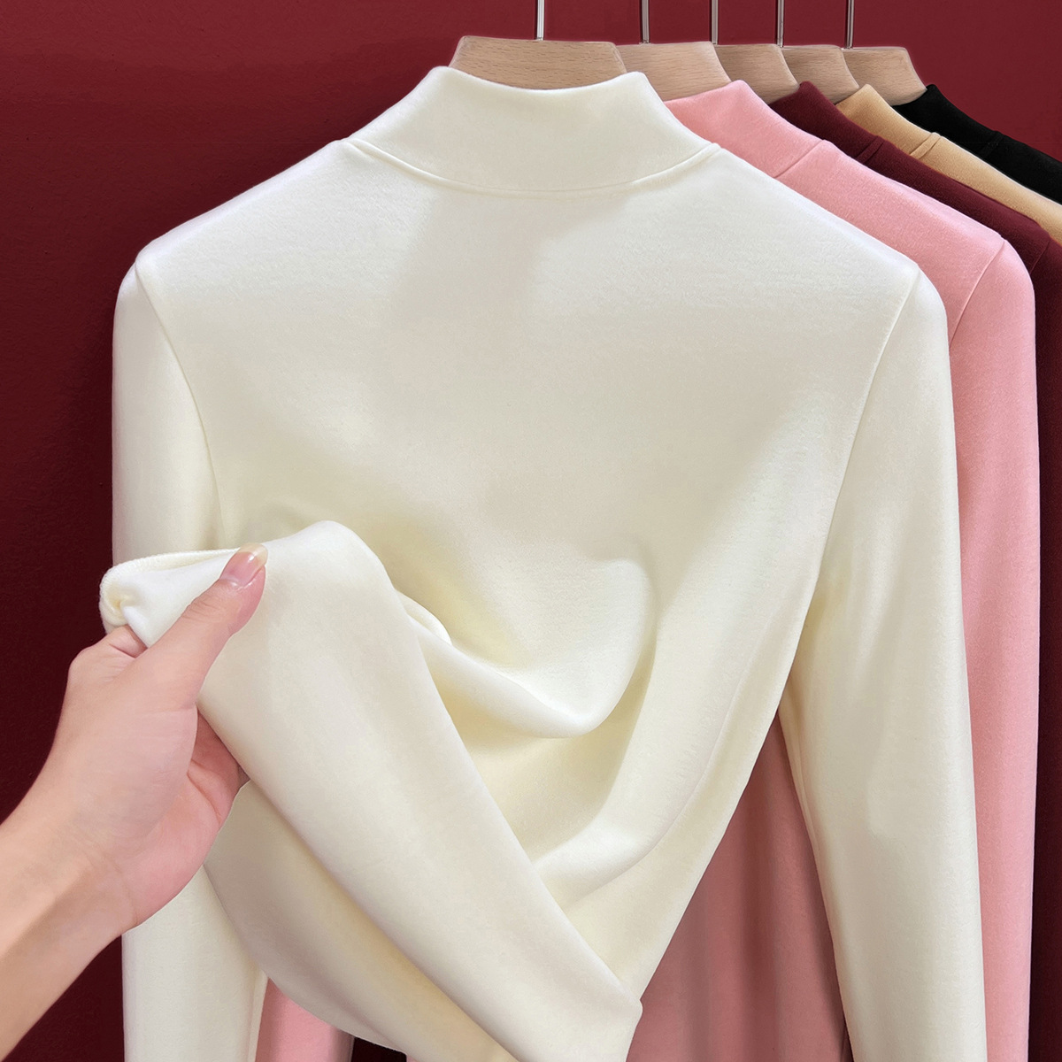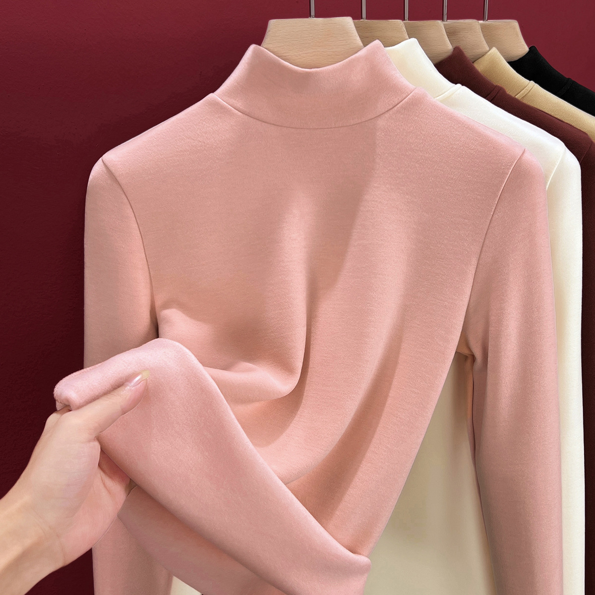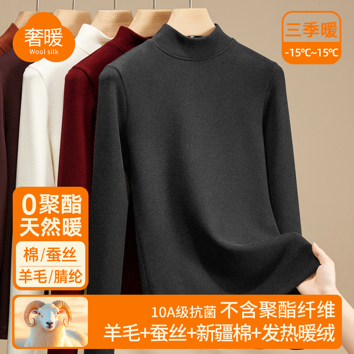 반하이넥 실크 보온 내의 여성용 상의, 양털 안감으로 두꺼워진 이너웨어, 울 혼방 기모 내의, 발열 기능성 가을/겨울 옷