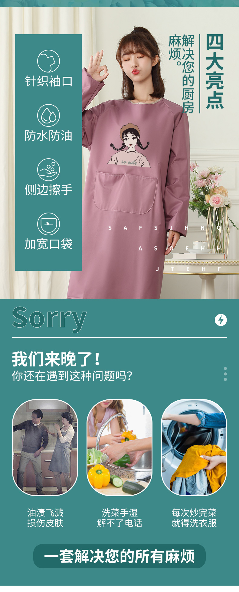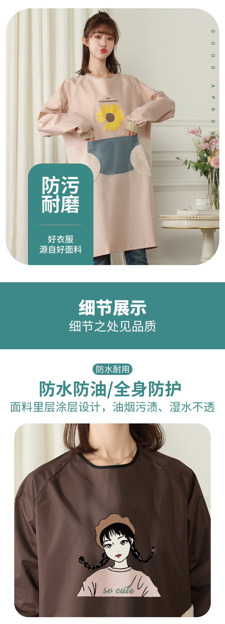 앞치마 여성용 가정용 주방 2024 새로운 방수 및 내유성 긴 소매 요리 허리 귀여운 일본식 작업복 근로자
