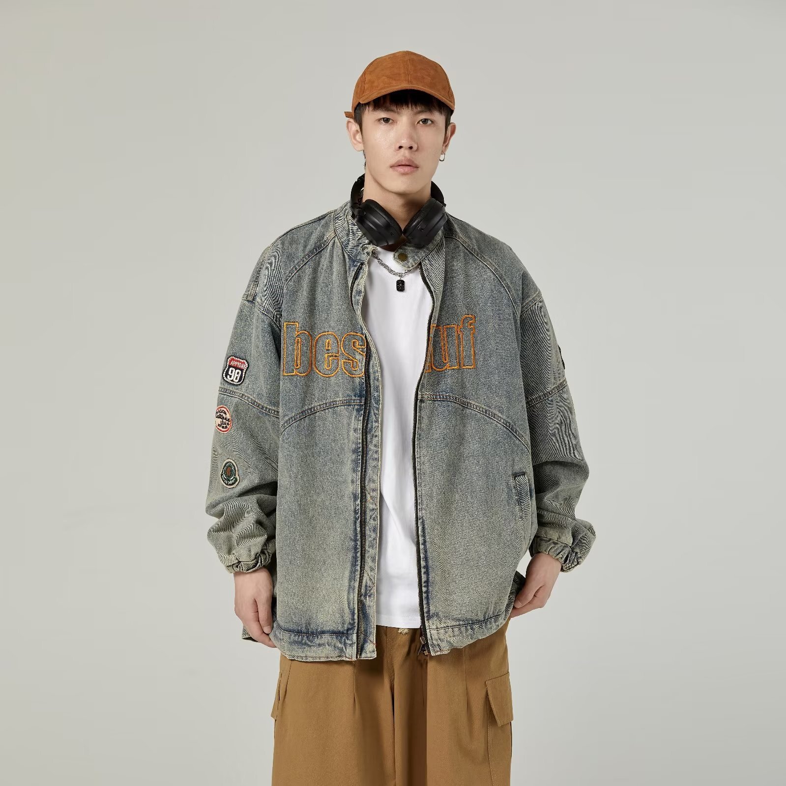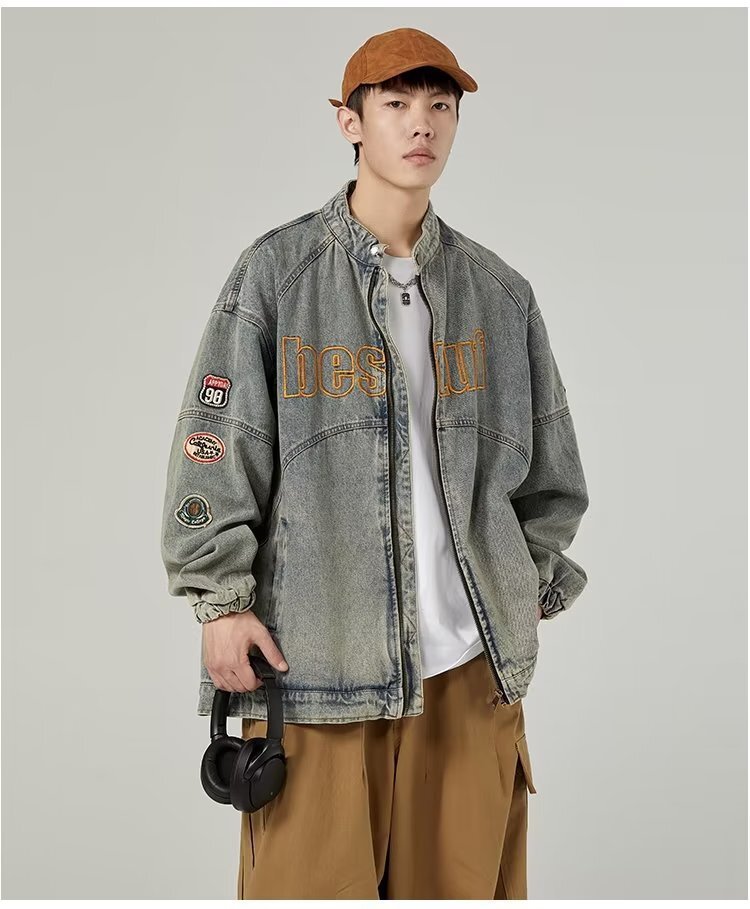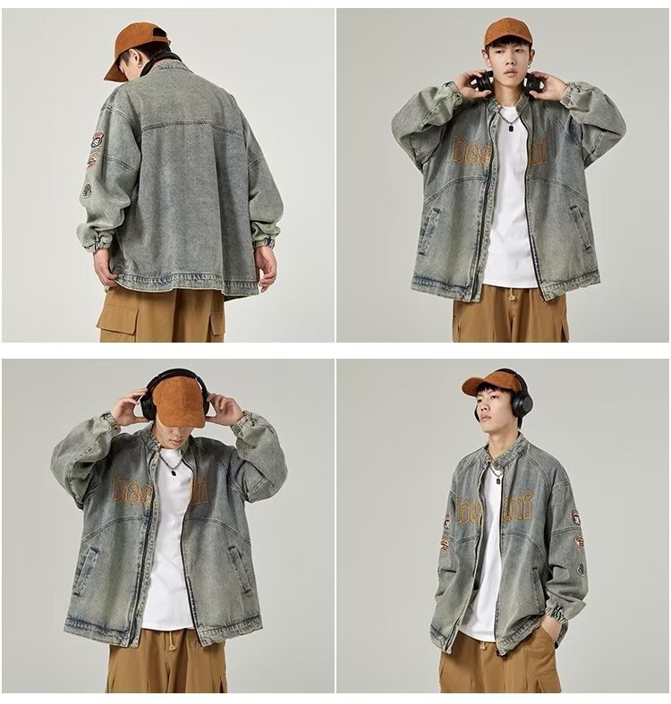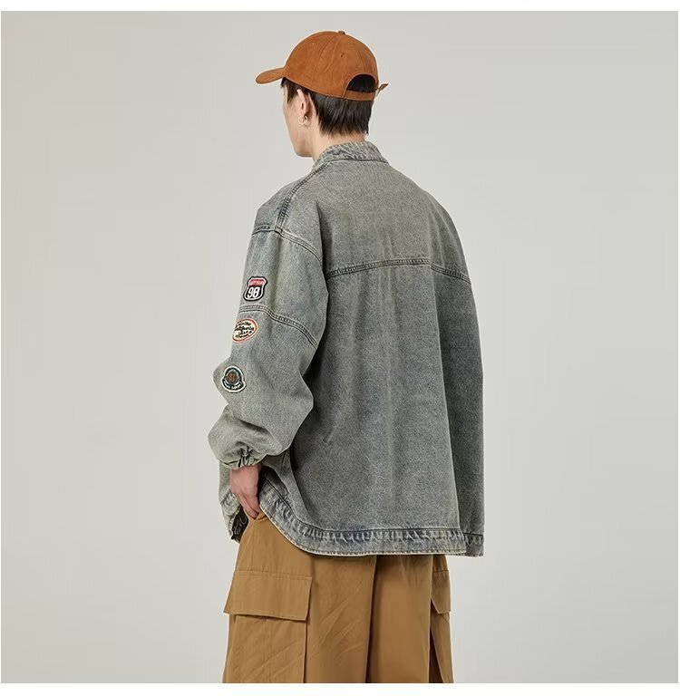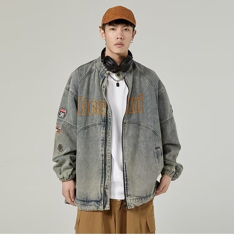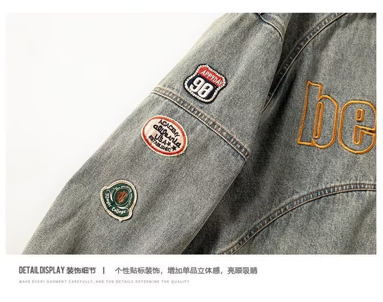 봄과 가을 빈티지 오래 된 배지 데님 재킷 남성 유행 브랜드 루즈 스트리트 오토바이 스타일 툴링 재킷 트렌디스토어 가기