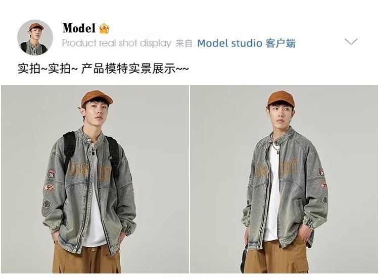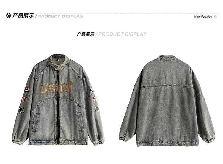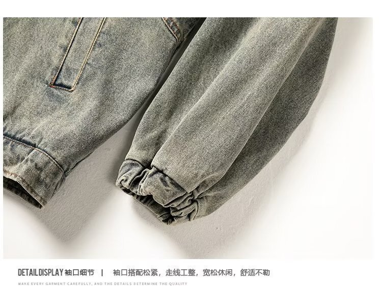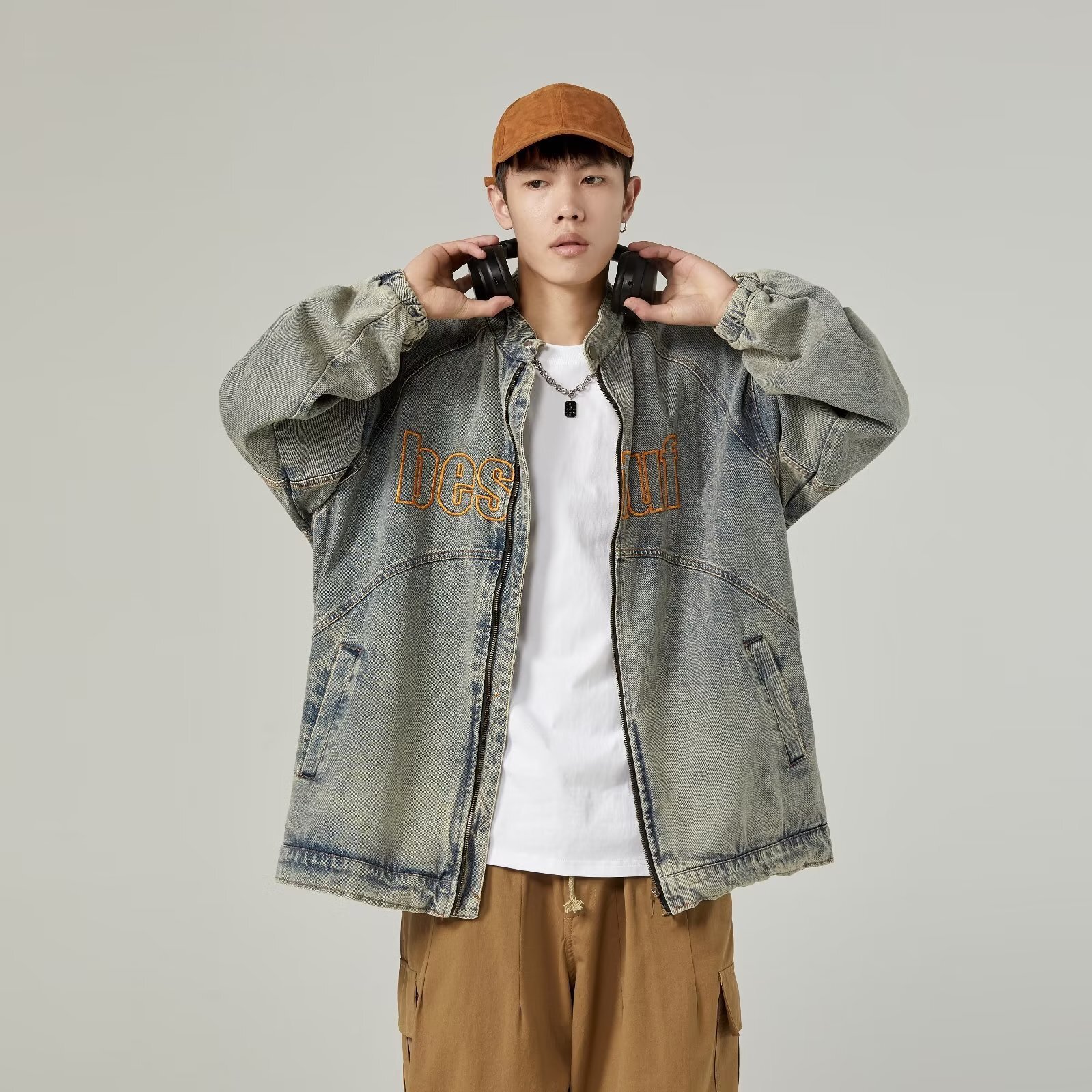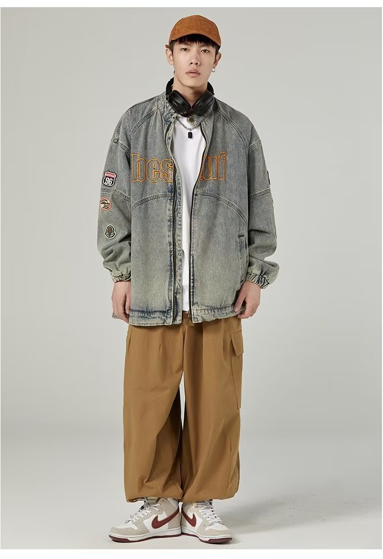봄과 가을 빈티지 오래 된 배지 데님 재킷 남성 유행 브랜드 루즈 스트리트 오토바이 스타일 툴링 재킷 트렌디스토어 가기