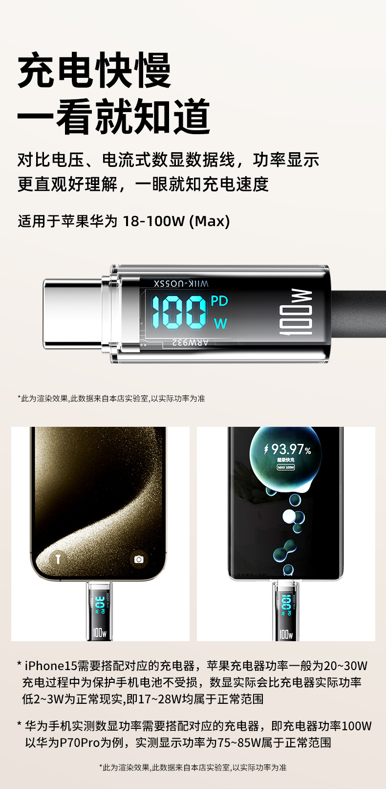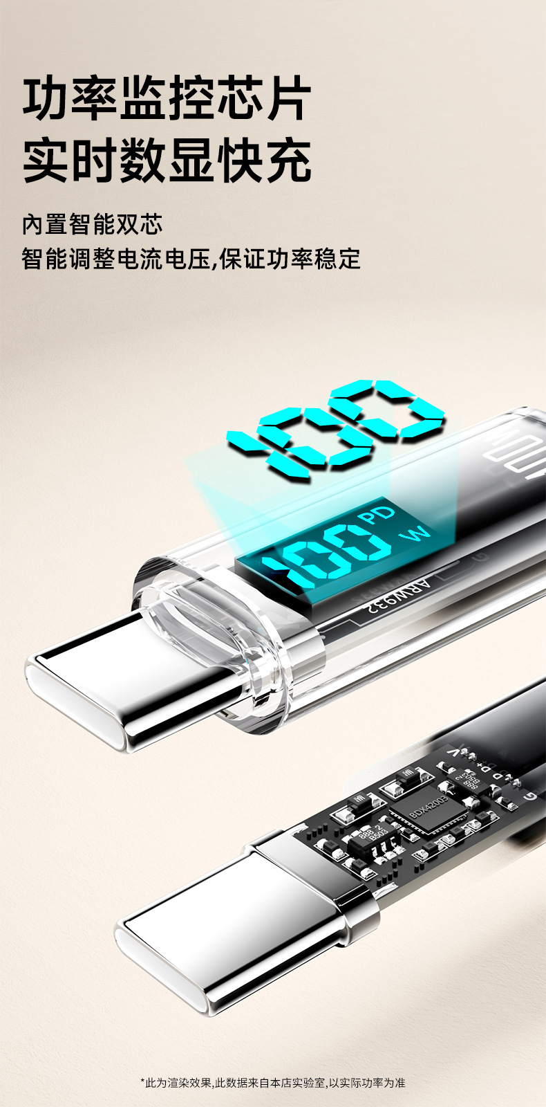 • [C] 1.5m 진정한 100W 스마트 디지털 디스플레이 고속 충전 케이블 [E-마커 칩 포함] Huawei Honor Apple 15-16 네이키드
