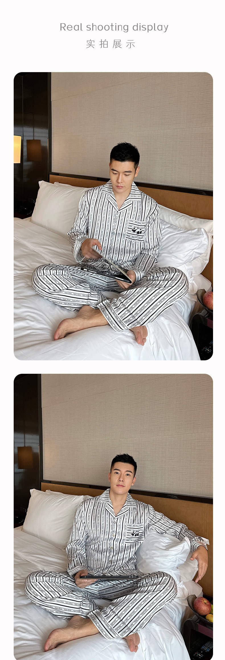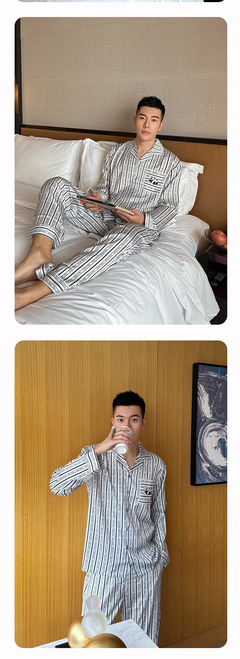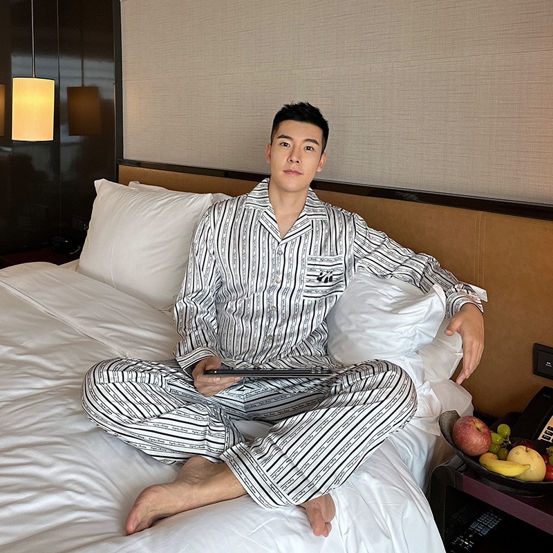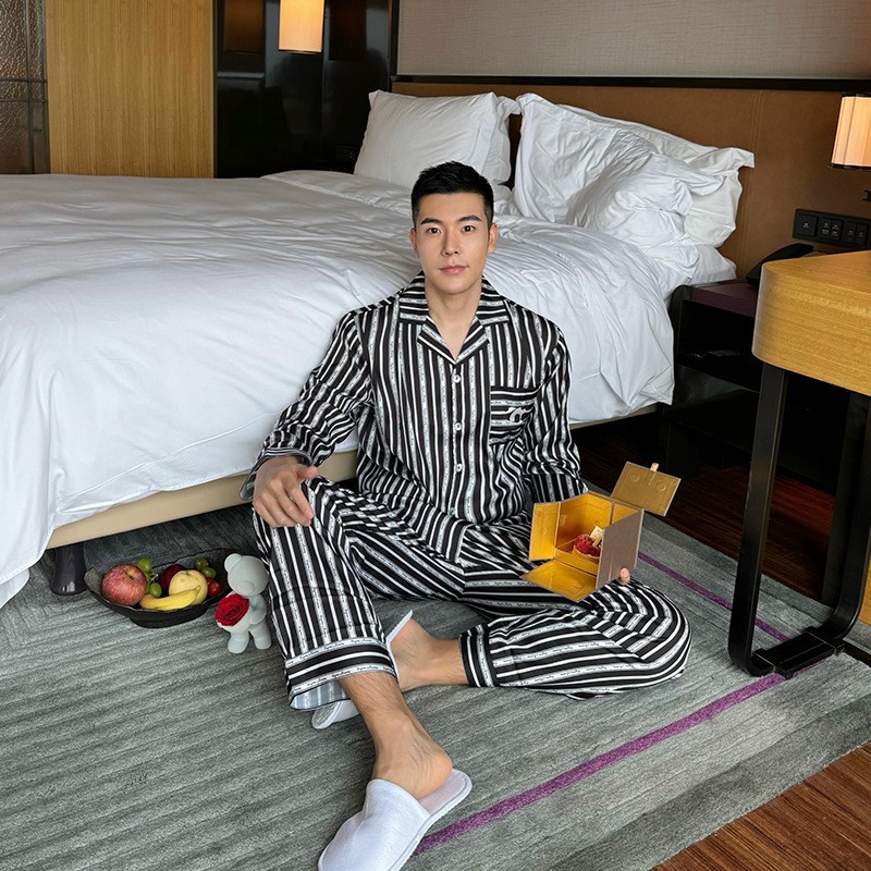 2024 새로운 도착 잠옷 남성용 아이스 실크 팬더 수직 스트라이프 밀크 실크 홈 의류 긴 소매 바지스토어 가기