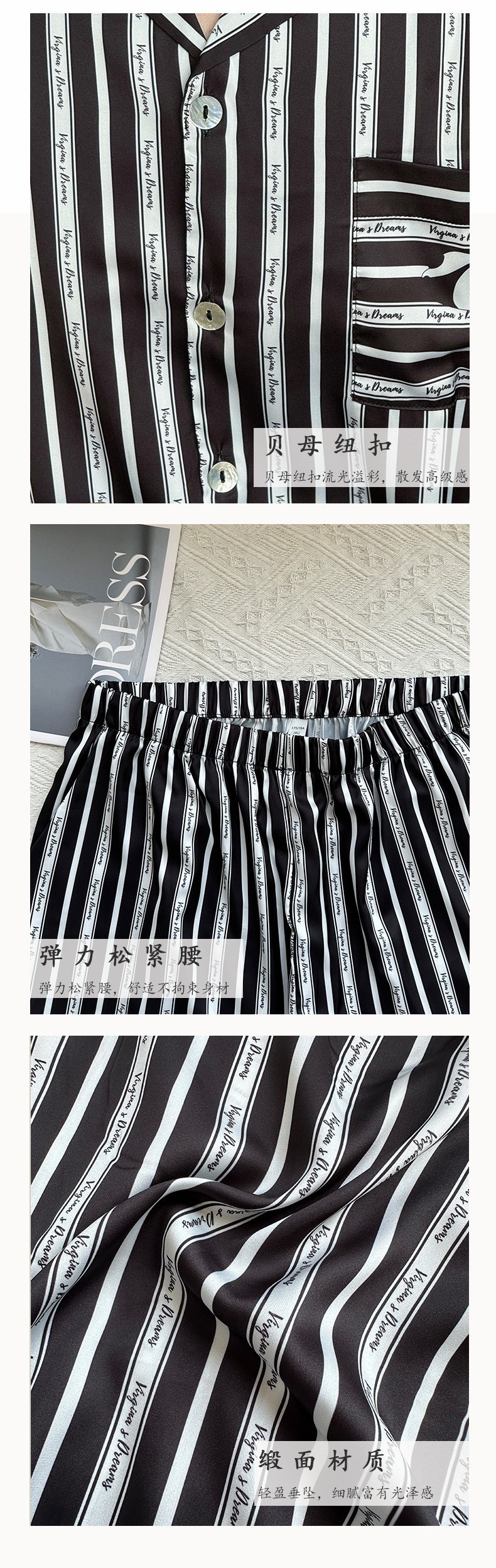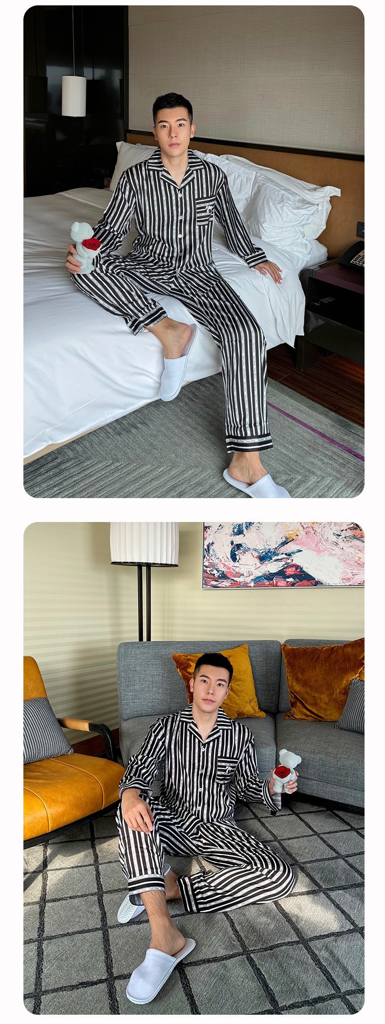2024 새로운 도착 잠옷 남성용 아이스 실크 팬더 수직 스트라이프 밀크 실크 홈 의류 긴 소매 바지