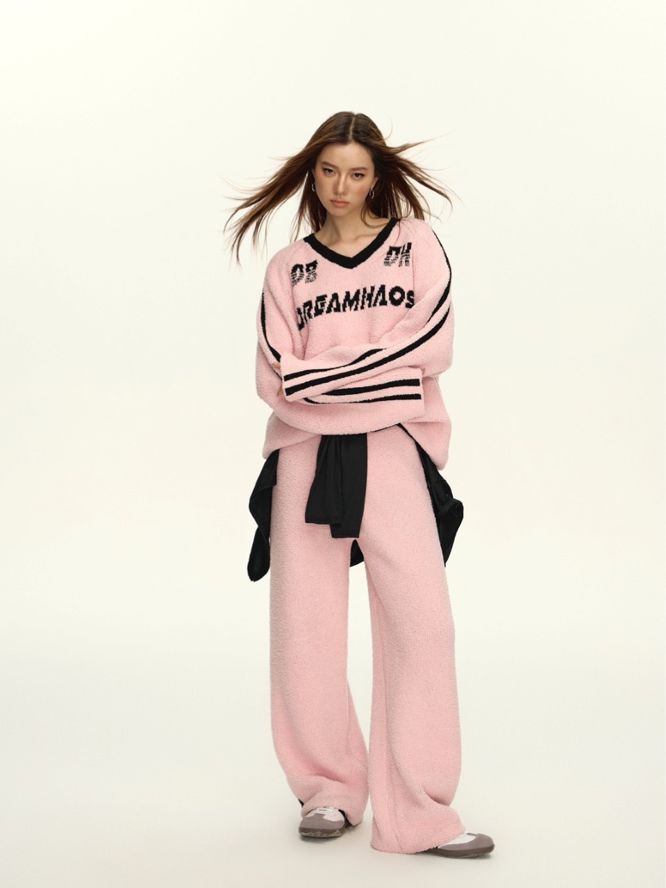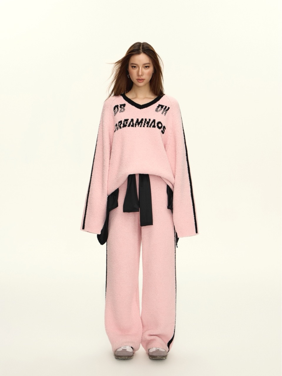 겨울 새로운 하프 벨벳 핑크 V 넥 긴 소매 미국 스타일 뜨거운 소녀 프린트 루즈 탑 파자마 여성 세트