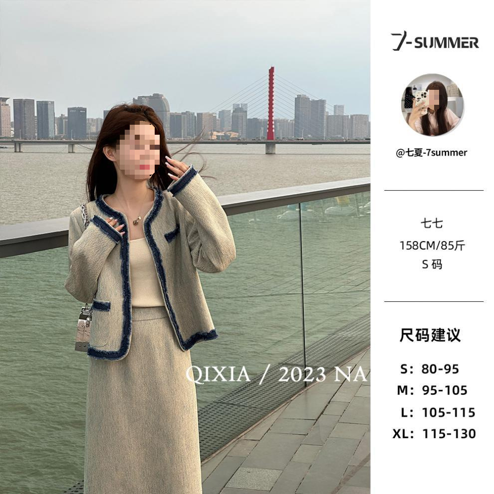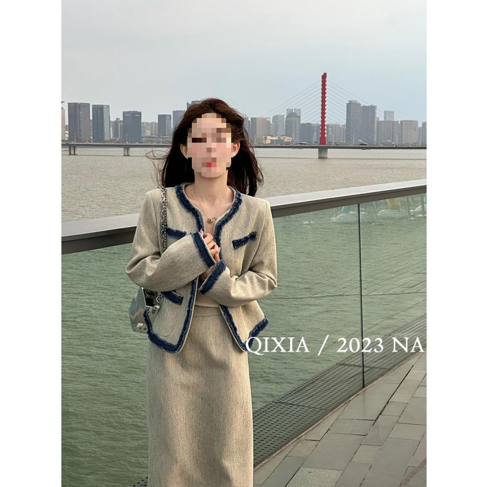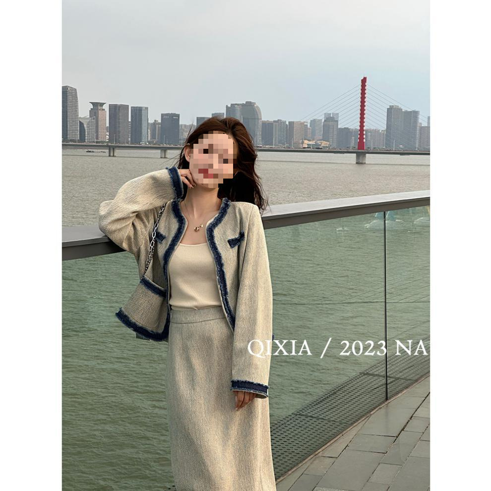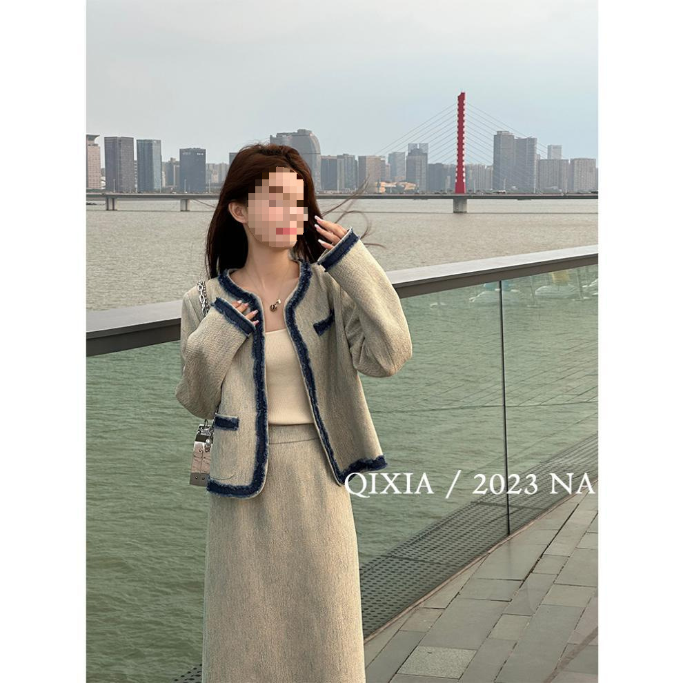 [이 녹색 만] 컬러 스티칭 작은 샤넬 스타일 조커 프렌치 카디건 자켓 딥 스플릿 오버 스커트 세트 가을스토어 가기