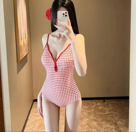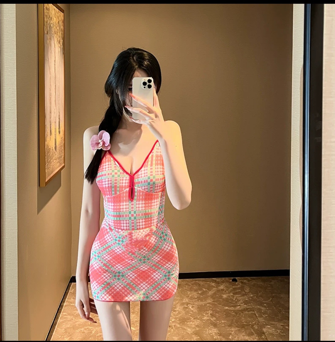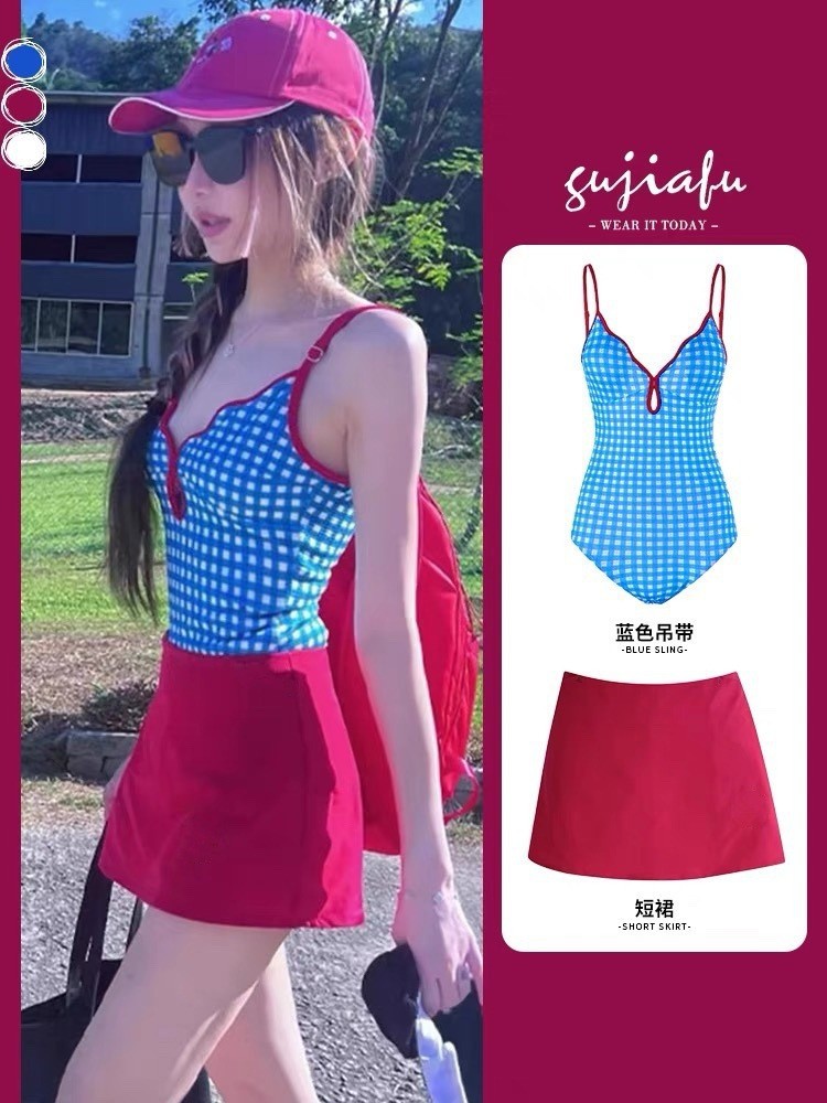 원피스 격자 무늬 수영복 여성 싱글 레드 스커트 배꼽 커버 슬리밍 학생 소녀 스타일 휴가 삼각형 원피스 수영복