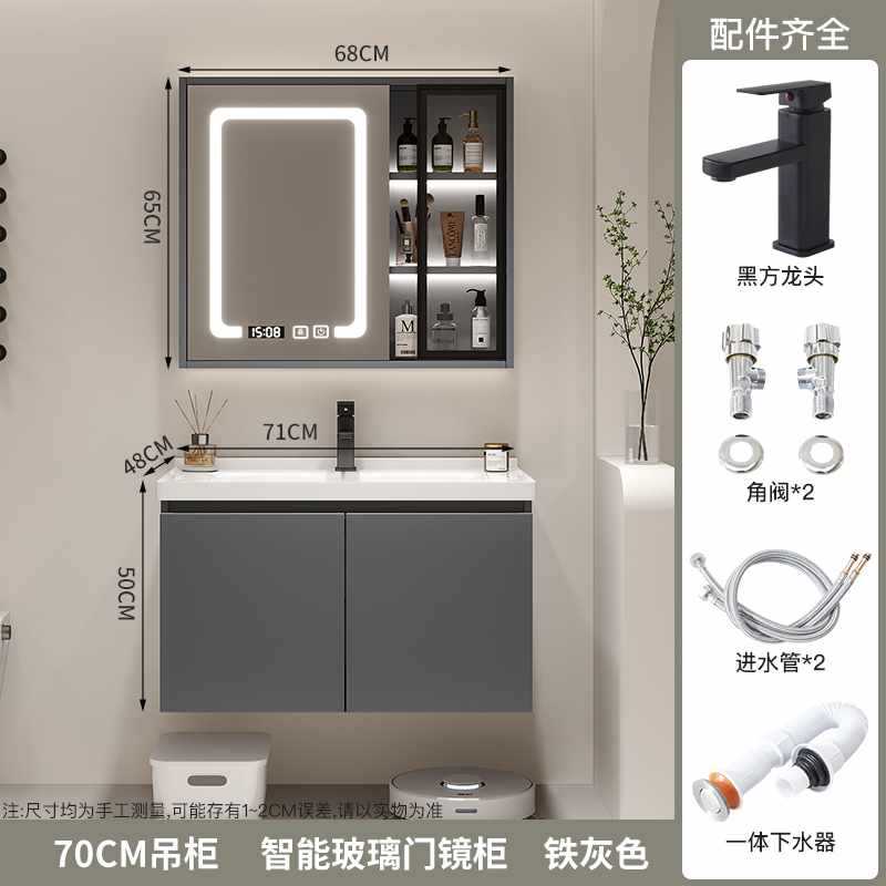 • 7038 라이트 럭셔리 그레이 벽 캐비닛 스마트 거울 캐비닛에는 검정색 사각형 수도꼭지가 함께 제공됩니다.