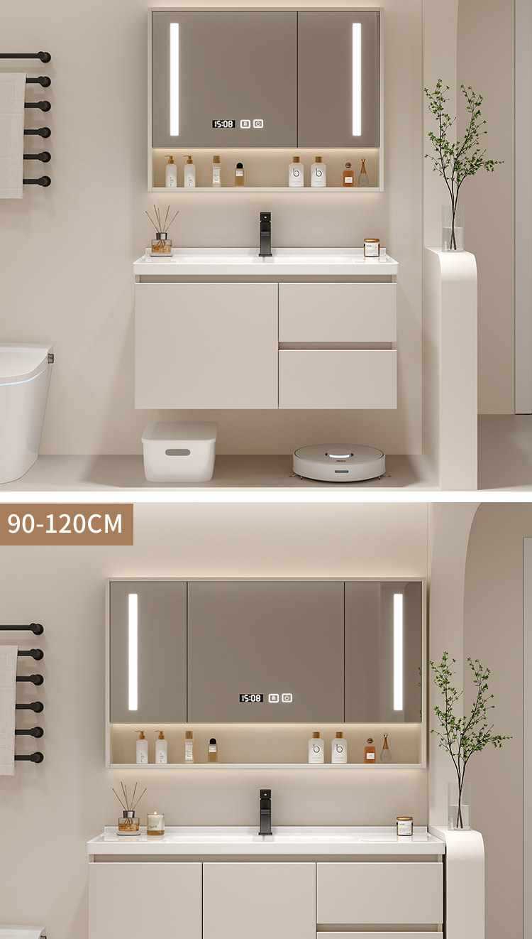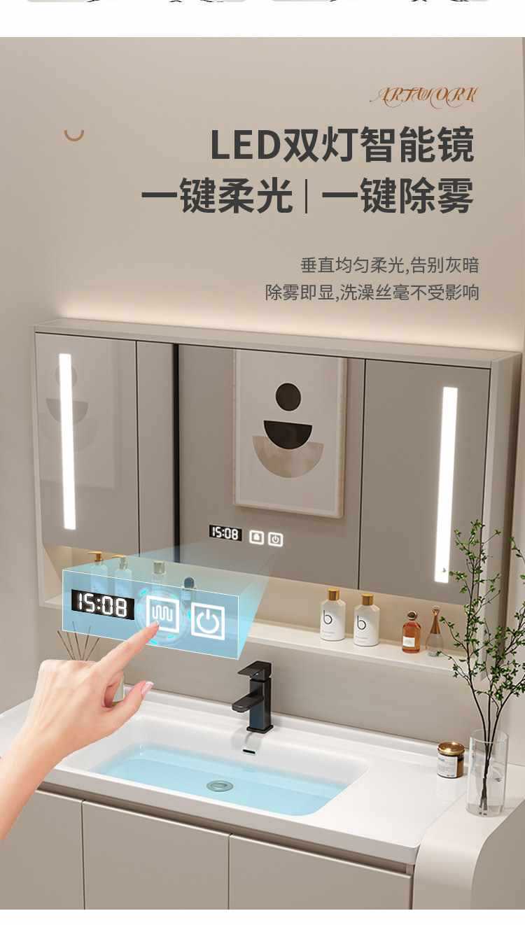 • 12038 라이트 럭셔리 그레이 벽 캐비닛 스마트 거울 캐비닛에는 검정색 사각형 수도꼭지가 함께 제공됩니다.