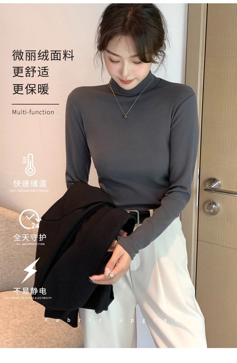 양면 벨벳 샌딩 두꺼운 솔리드 컬러 긴팔 베이스 셔츠 여성의 가을 및 겨울 반 하이 칼라 탑 따뜻한 슬림 핏 티셔츠