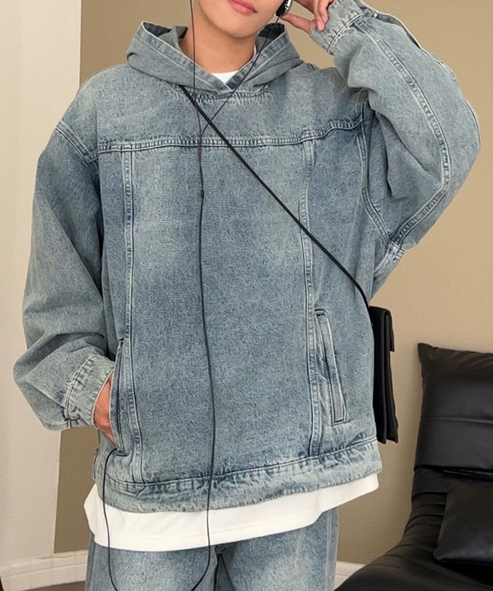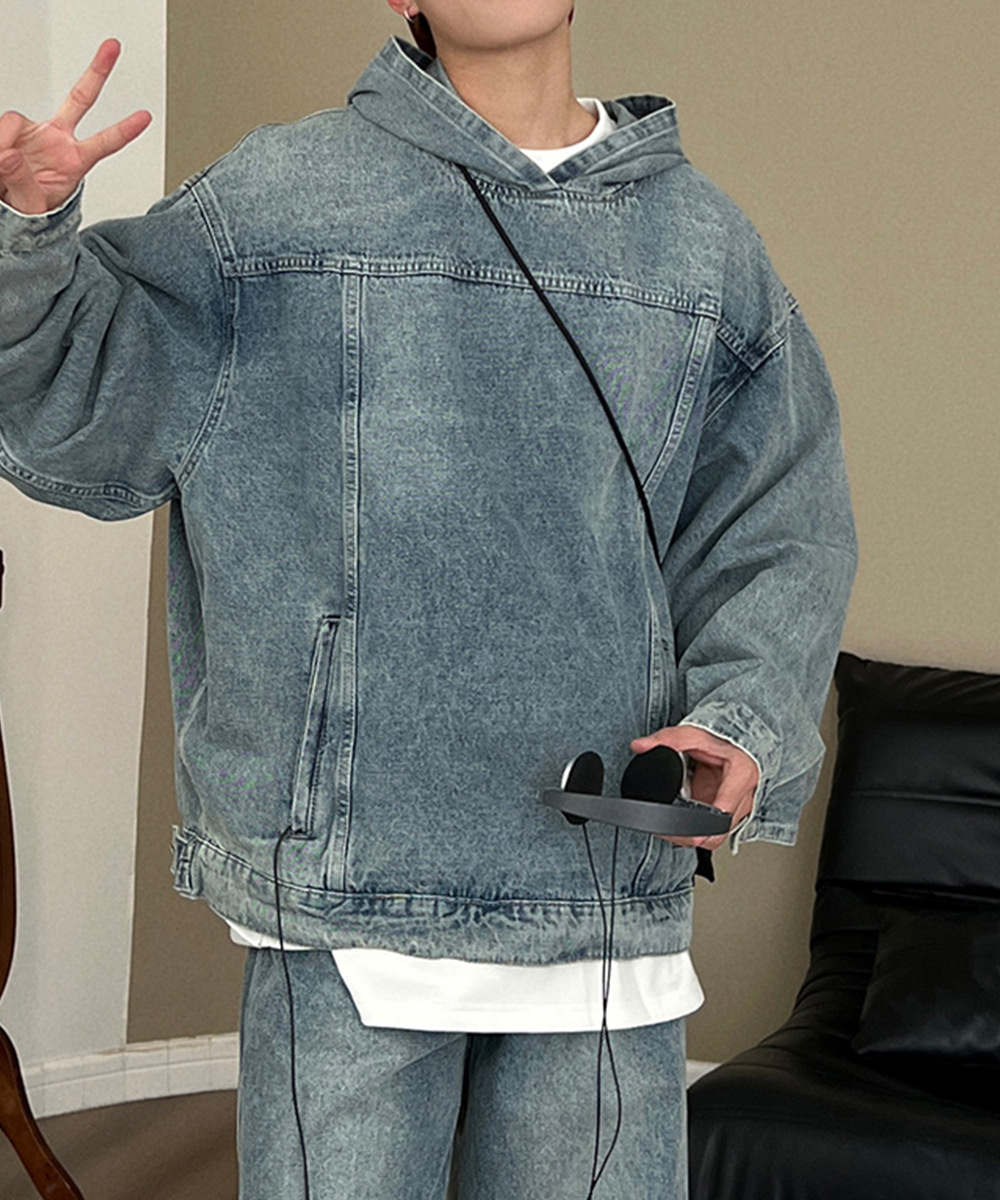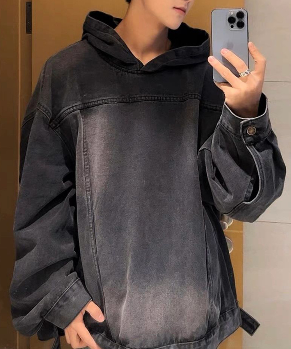 남성과 여성을위한 하이 스트리트 세탁 후드 데님 재킷 미국 스타일 복고풍 디자인 센스 커플 스웨트 셔츠 올드 데님 탑스토어 가기