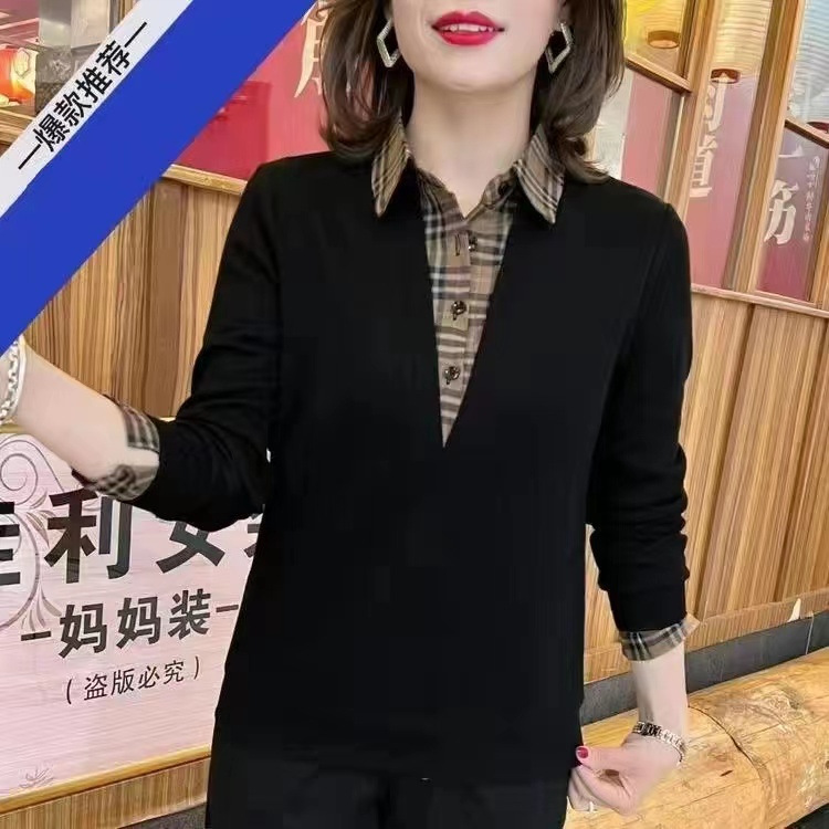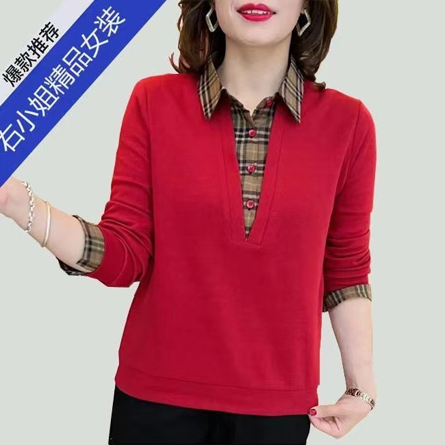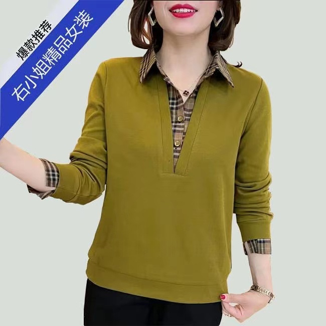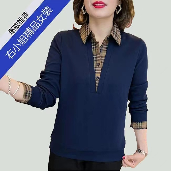 가짜 투피스 스웨터 블라우스 체크 무늬 봄 새로운 배를 덮는 최고 기질 조커베이스 셔츠 가을 의류 도매스토어 가기