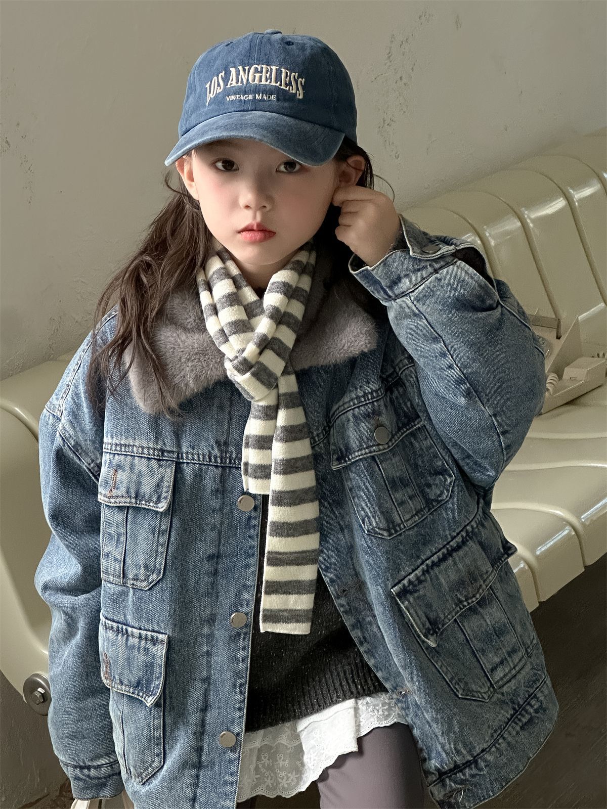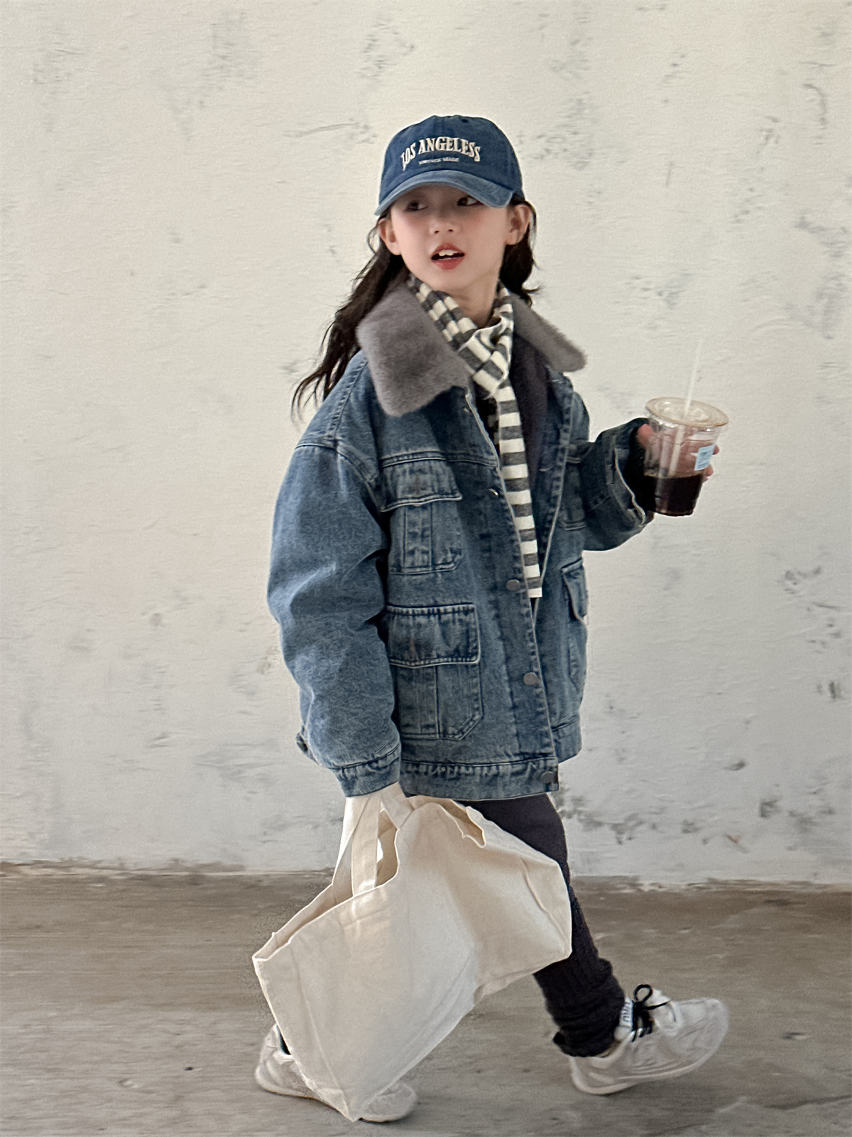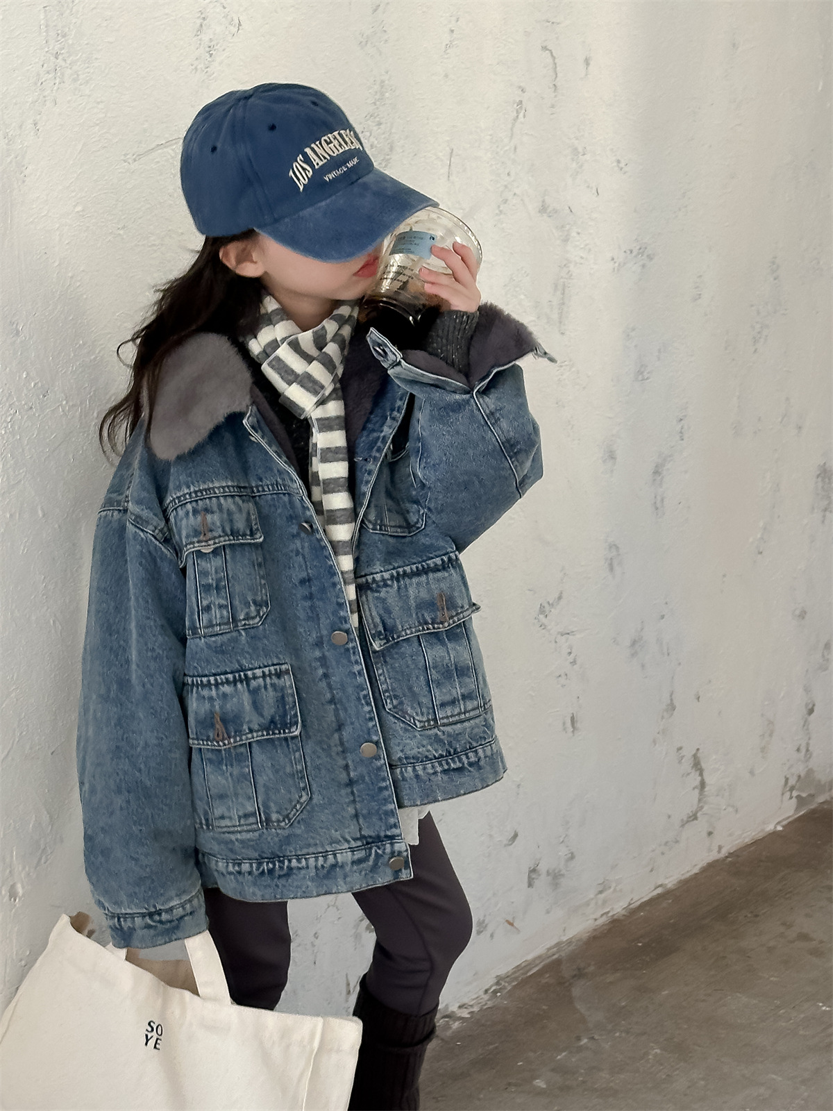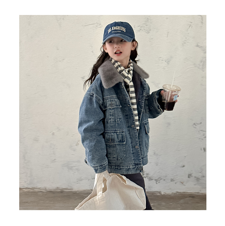 Hua and Xun 한국어 버전 2024 새로운 겨울 소녀 토끼 모피 칼라 데님 재킷 중형 및 대형 아동용 모피 안감 재킷 유행스토어 가기