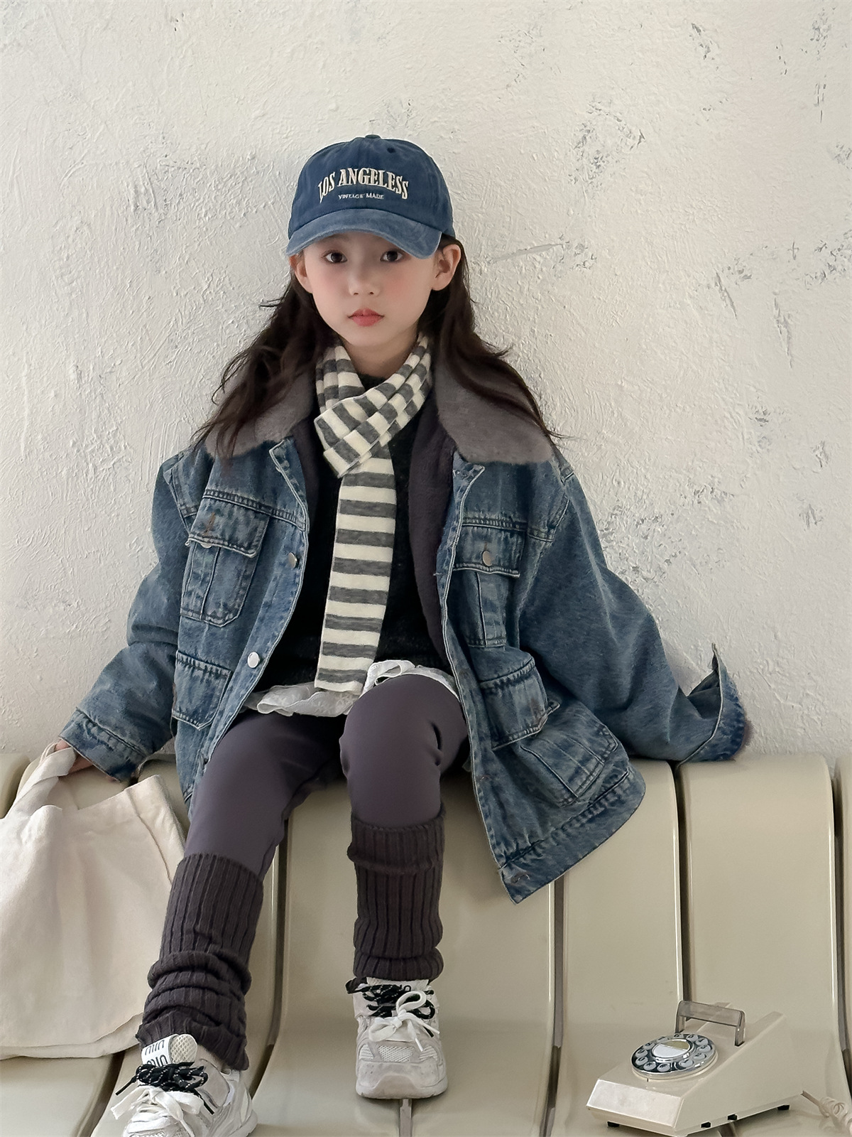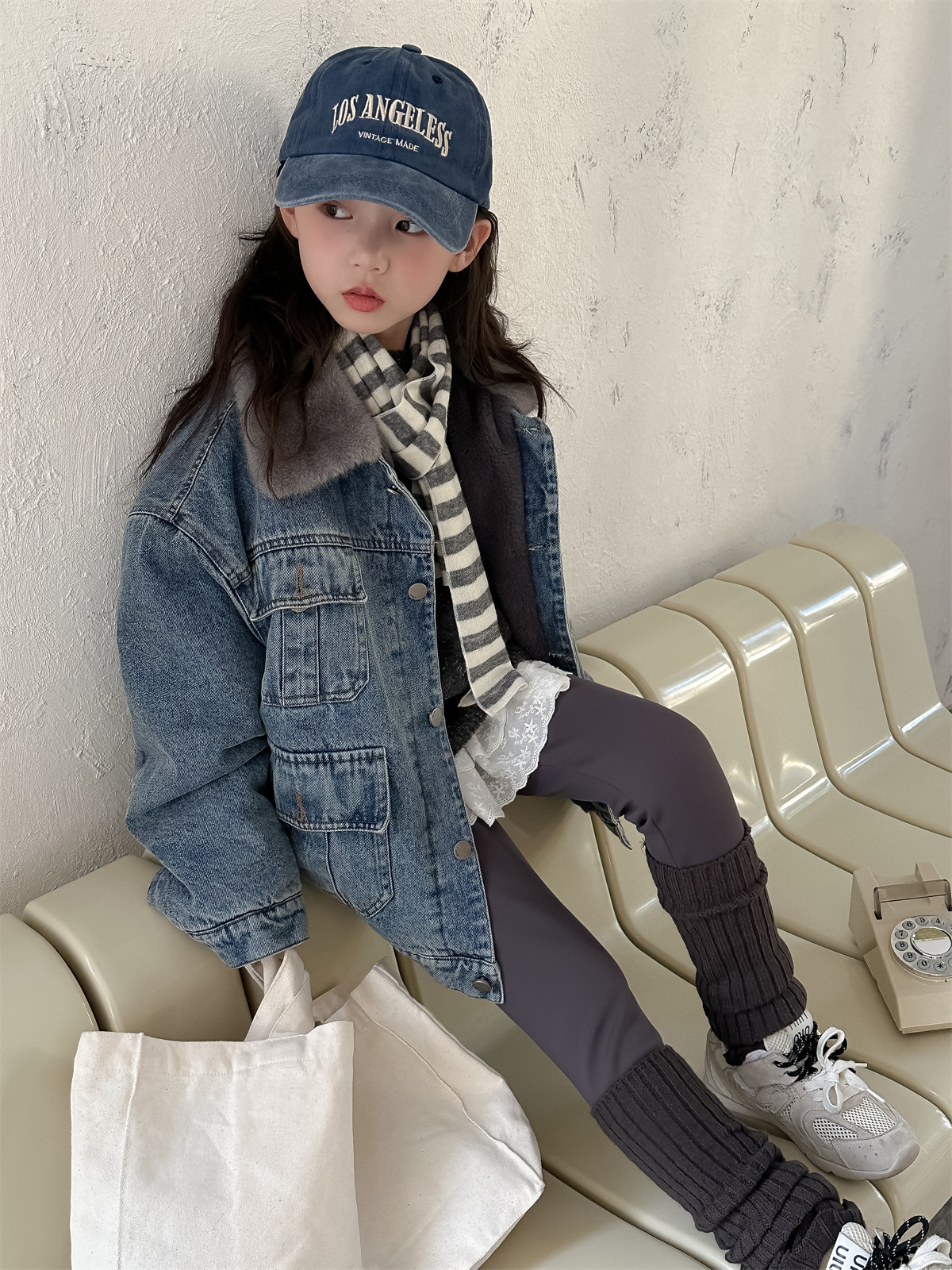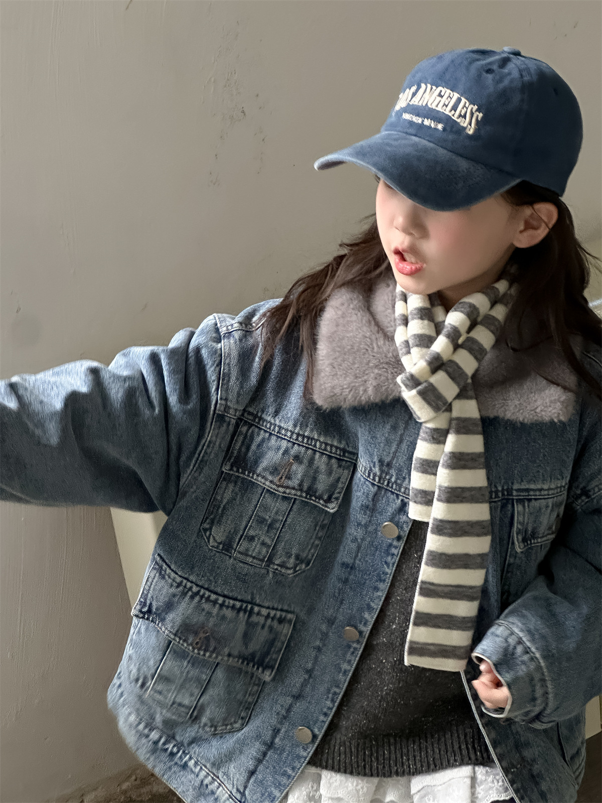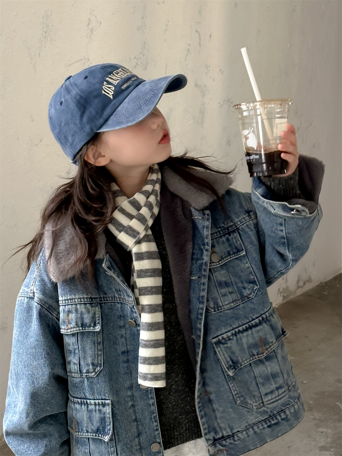 Hua and Xun 한국어 버전 2024 새로운 겨울 소녀 토끼 모피 칼라 데님 재킷 중형 및 대형 아동용 모피 안감 재킷 유행스토어 가기