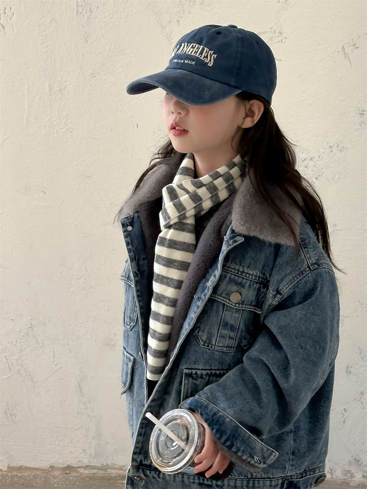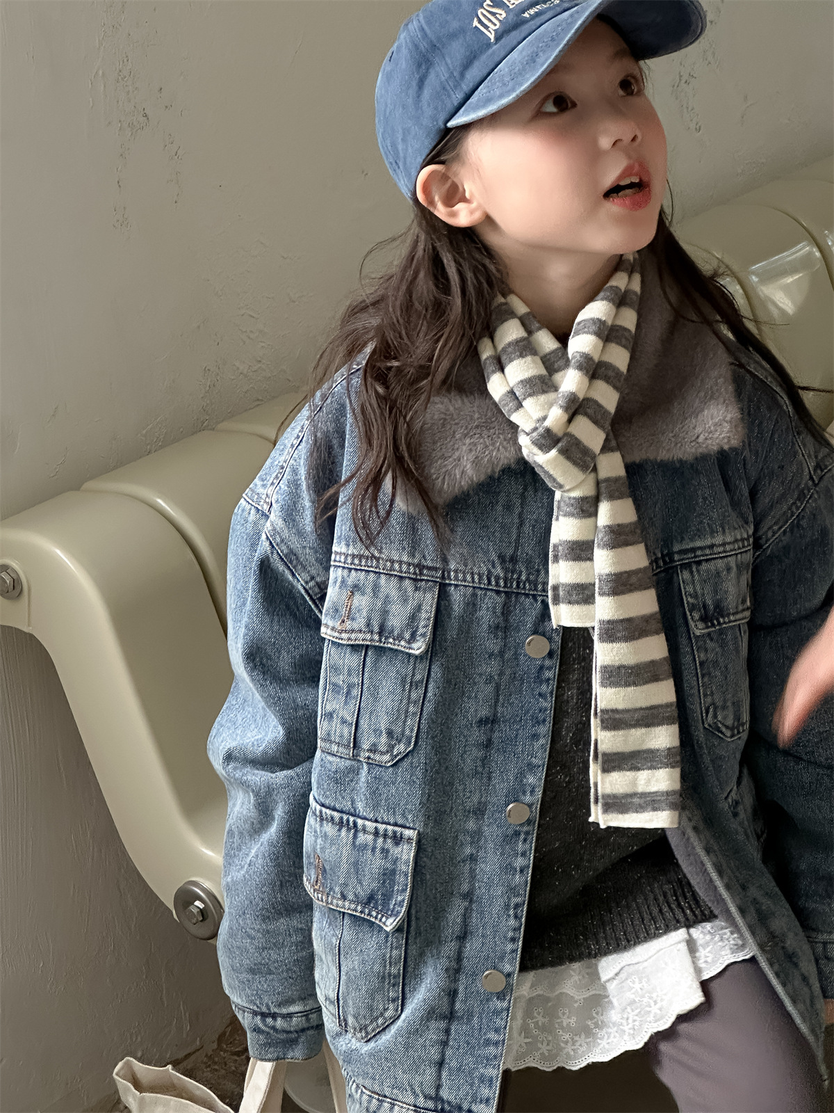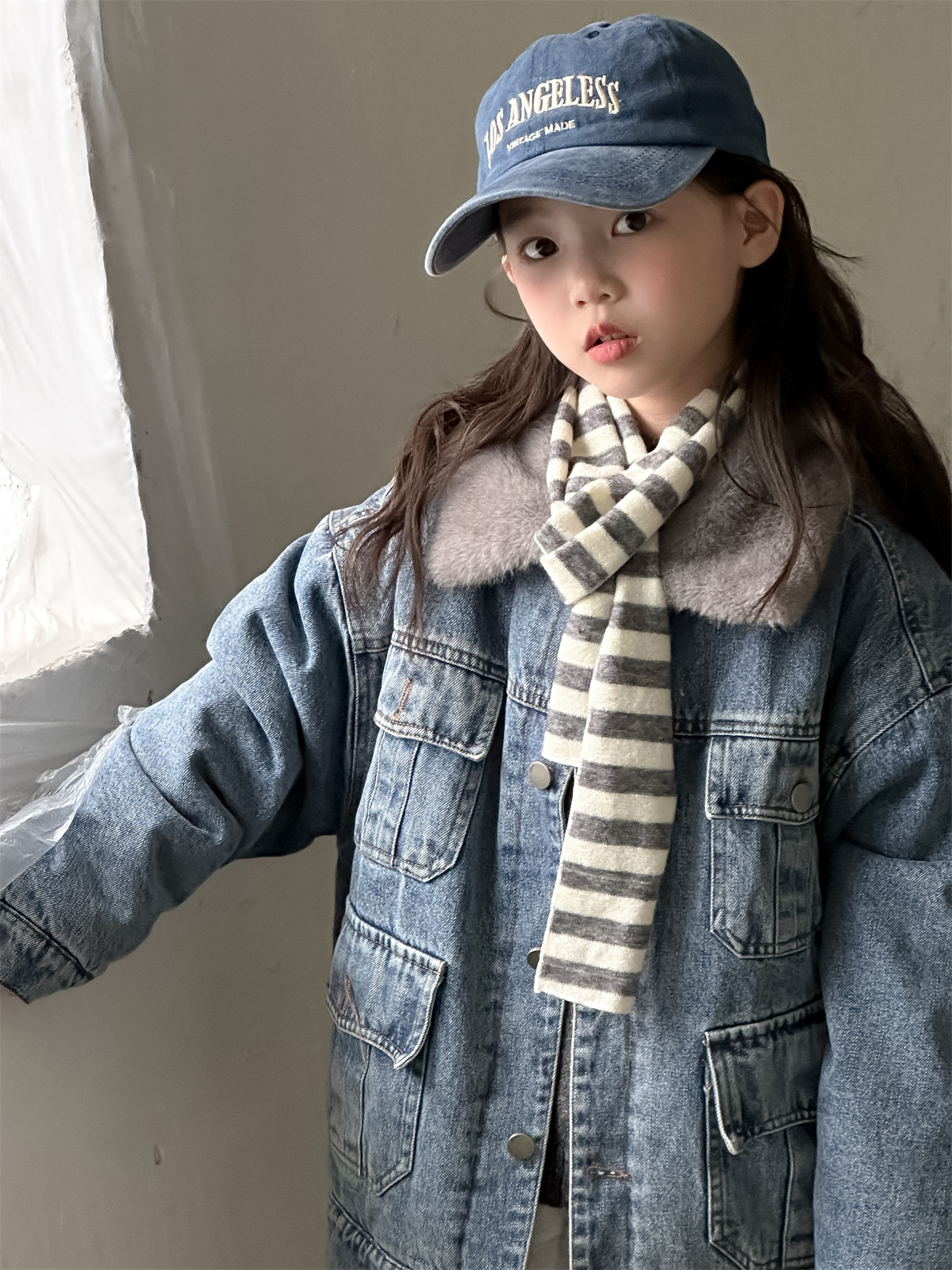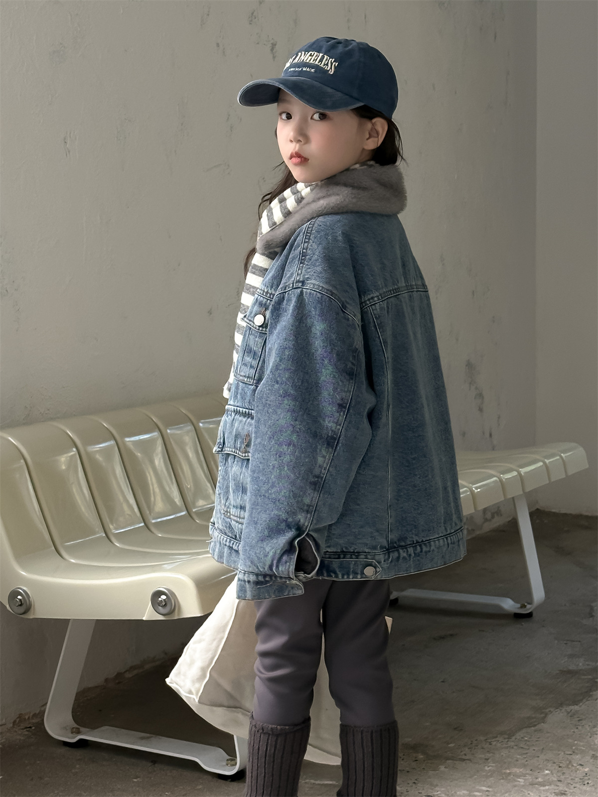 Hua and Xun 한국어 버전 2024 새로운 겨울 소녀 토끼 모피 칼라 데님 재킷 중형 및 대형 아동용 모피 안감 재킷 유행스토어 가기