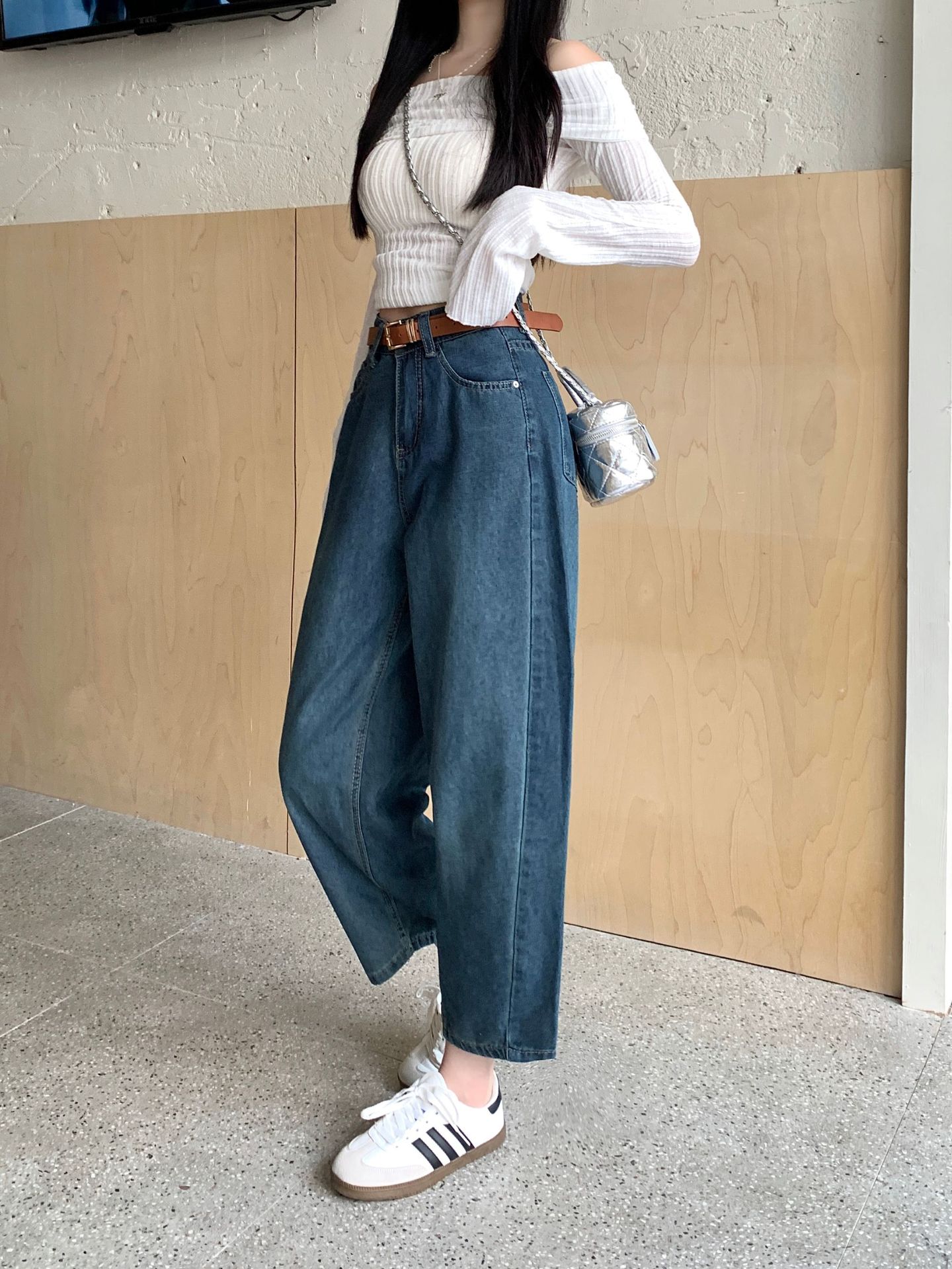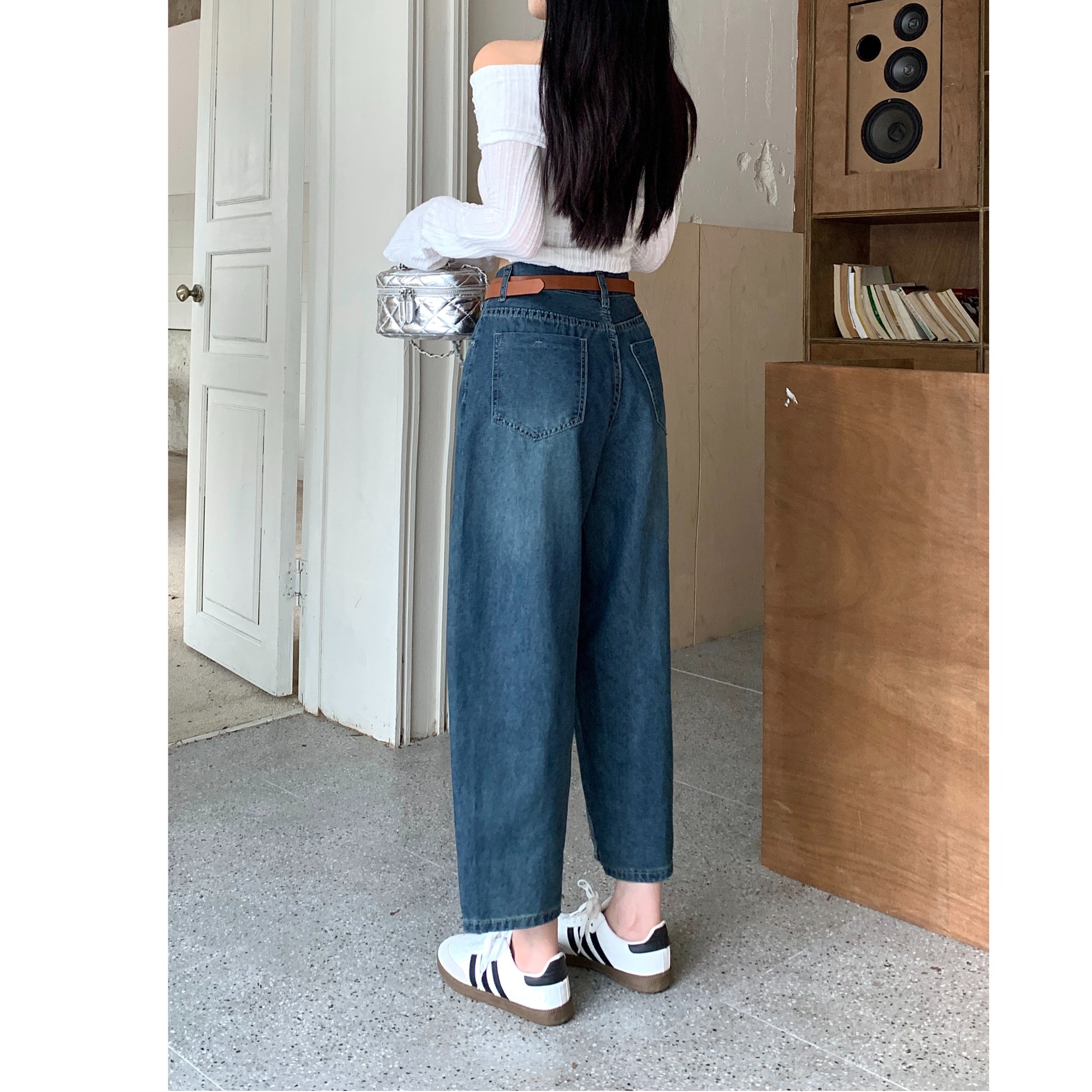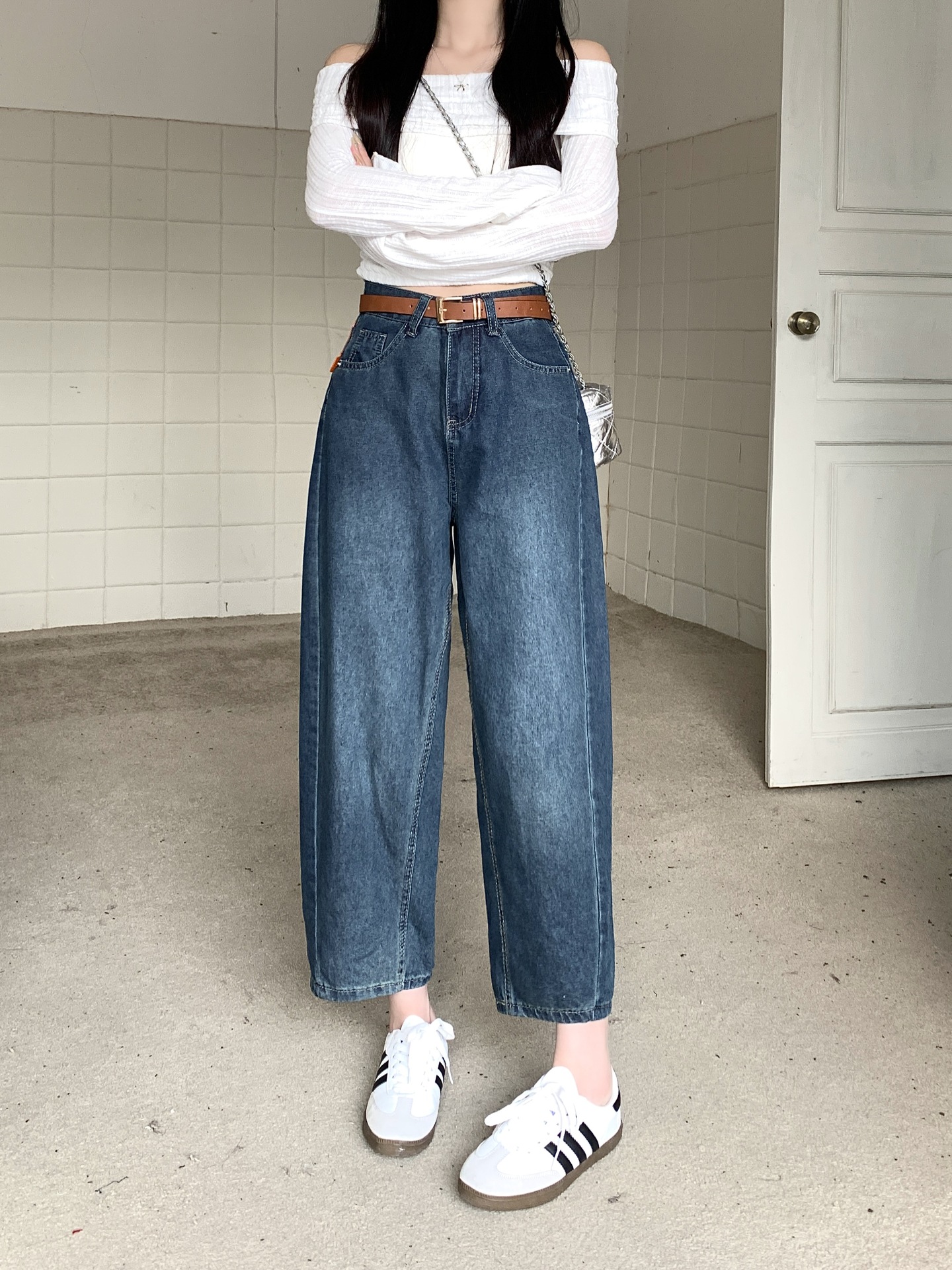 한국식 슬리밍 배 모양의 몸매 약간 뚱뚱한 소녀는 봄과 여름 새로운 넓은 다리 데님 마체 테 바나나 바지 여성을 착용합니다.스토어 가기