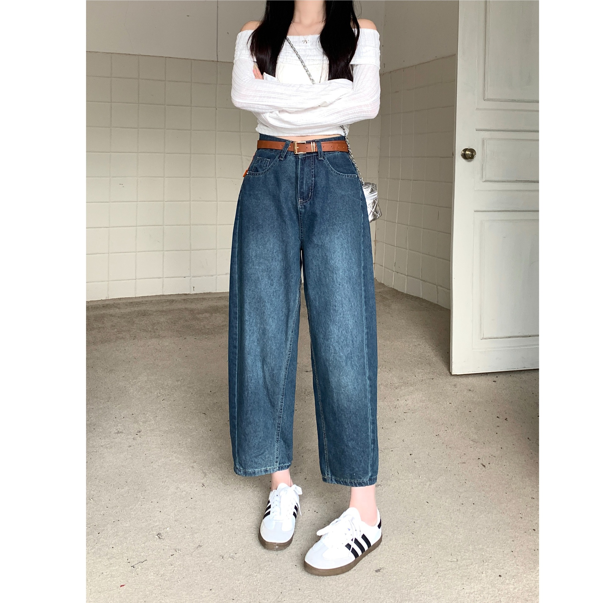 한국식 슬리밍 배 모양의 몸매 약간 뚱뚱한 소녀는 봄과 여름 새로운 넓은 다리 데님 마체 테 바나나 바지 여성을 착용합니다.