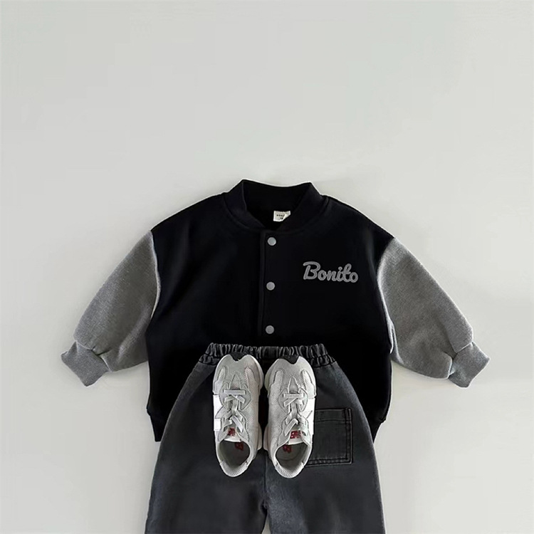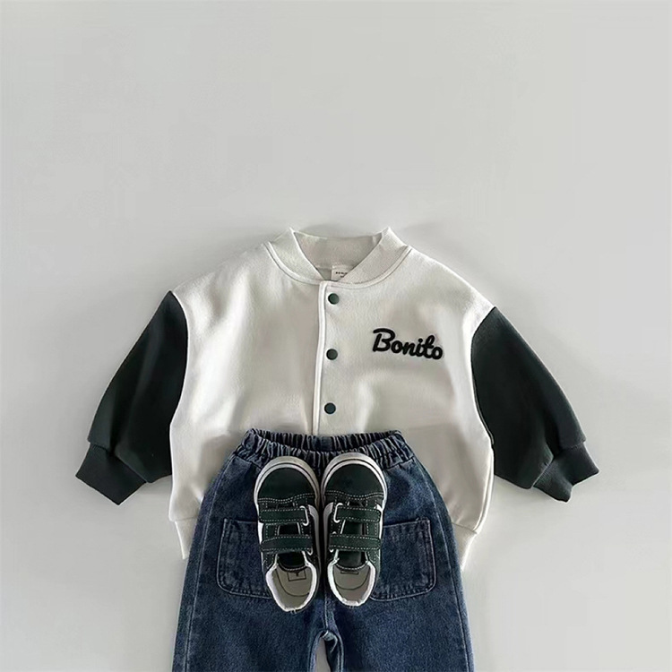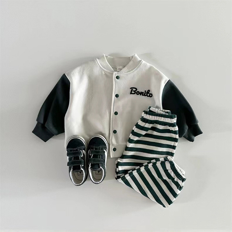 남학생과 여학생을위한 봄과 가을 옷의 한국 버전 아기 어린이 카디건 코트 새로운 긴 소매 컬러 매칭 볼 세트 올 매치 야구 세트스토어 가기
