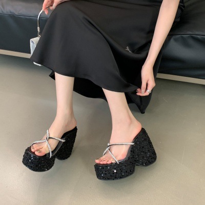 여성 플랫폼 신발 높이 12cm 복고풍 플러스 사이즈 투명 밀짚 패션 샌들 여성 여름 쐐기 슬리퍼
