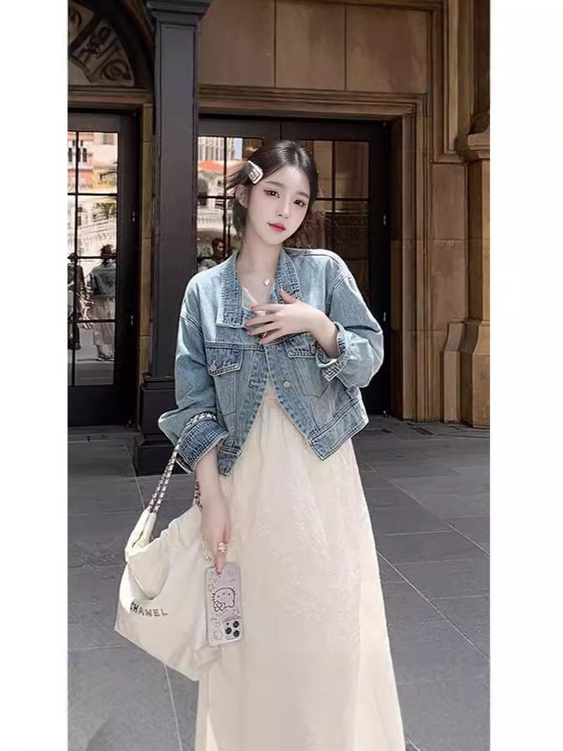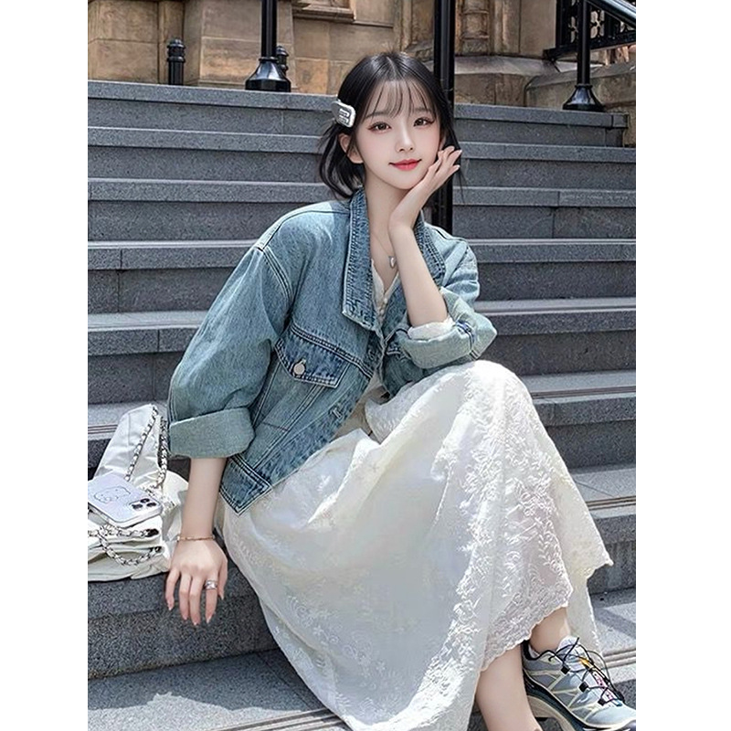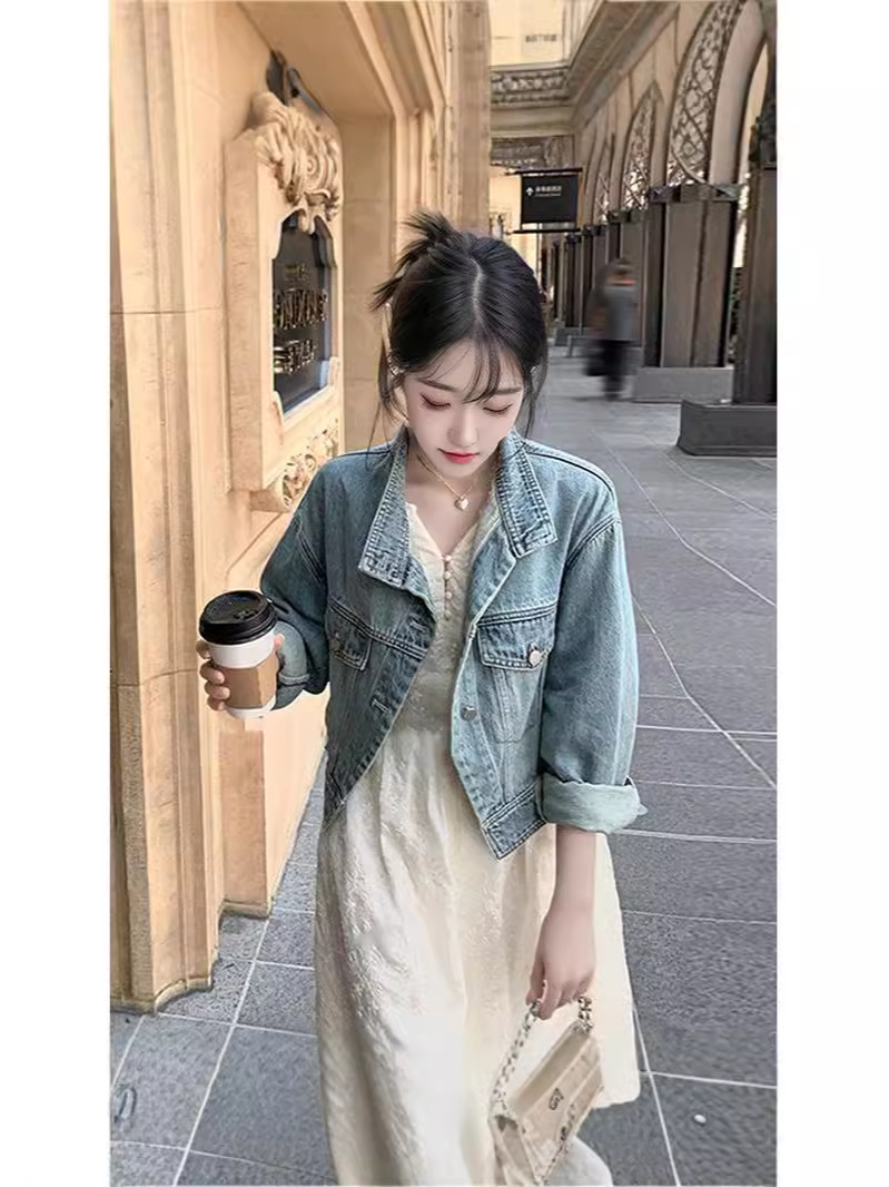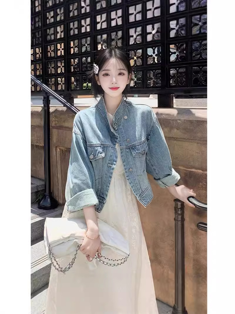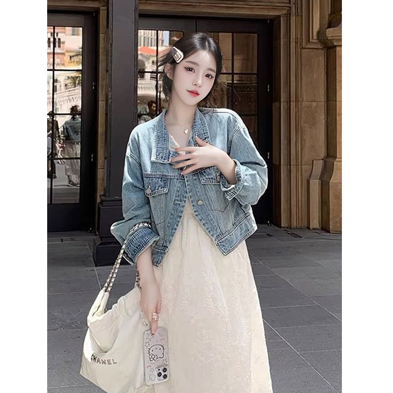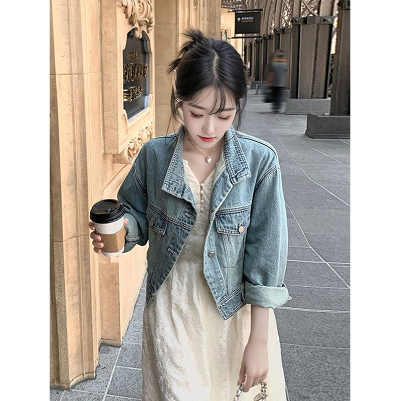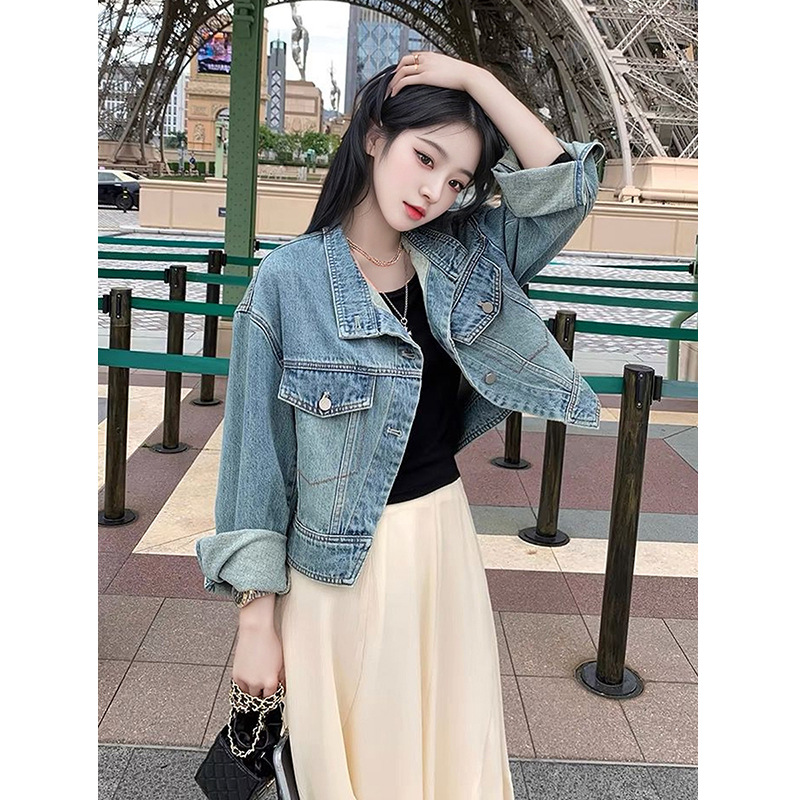 한국 스타일 디자인 센스 틈새 데님 코트 여성 루즈 2024 초가을 새 스타일 슬림 핏 짧은 재킷 탑 세로 칼라스토어 가기