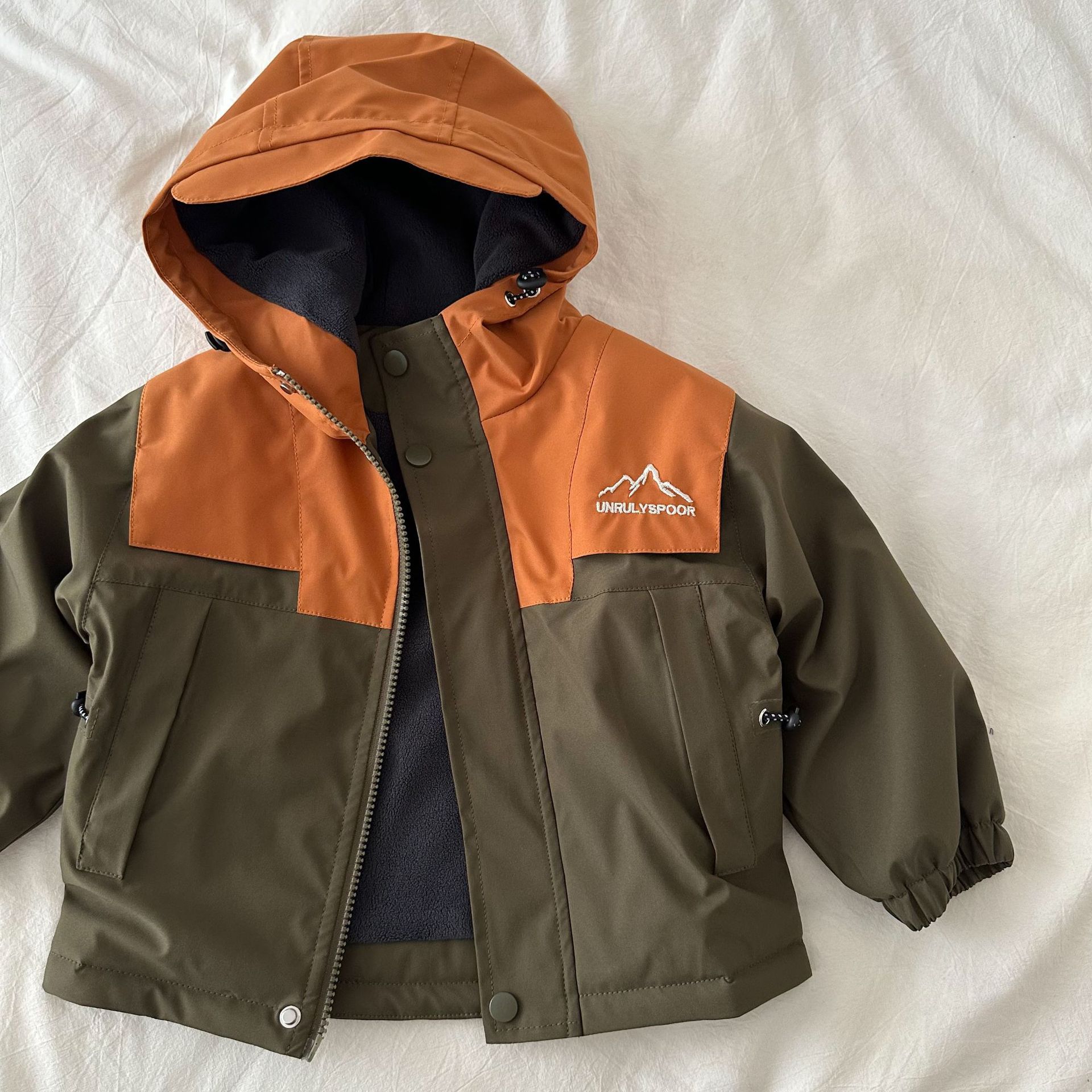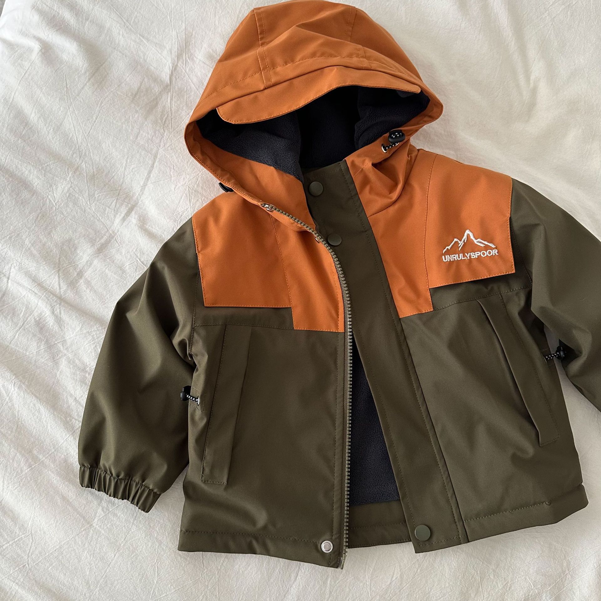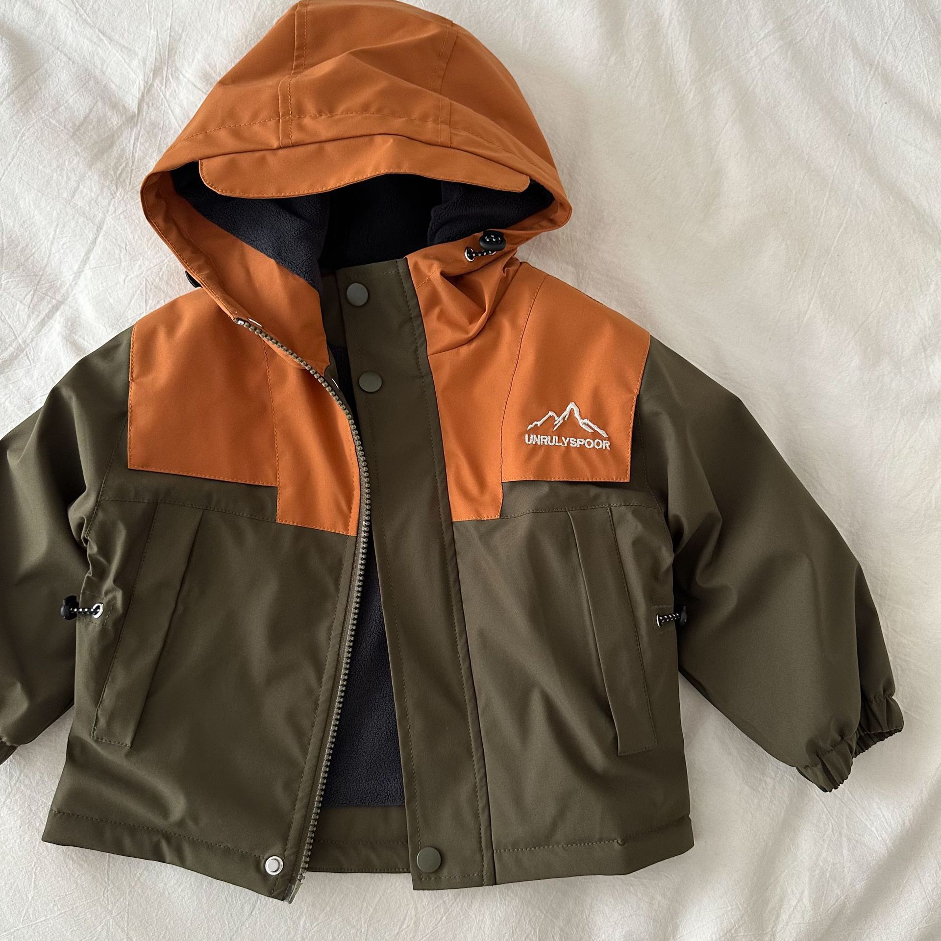 재고 어린이 코트 2024 가을 새로운 남녀 아동복 컬러 매칭 툴링 코트 베이비 후드 패딩 재킷스토어 가기
