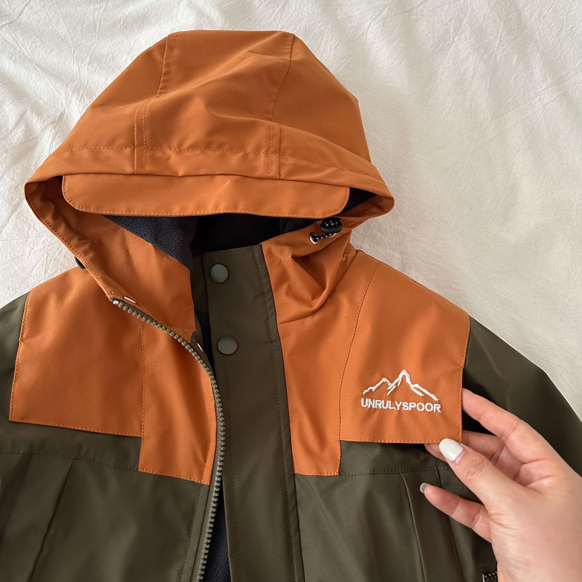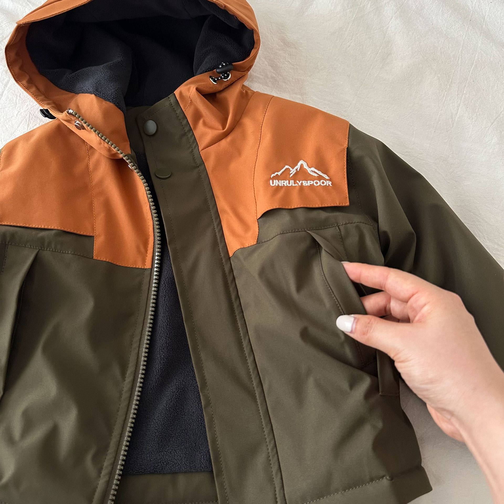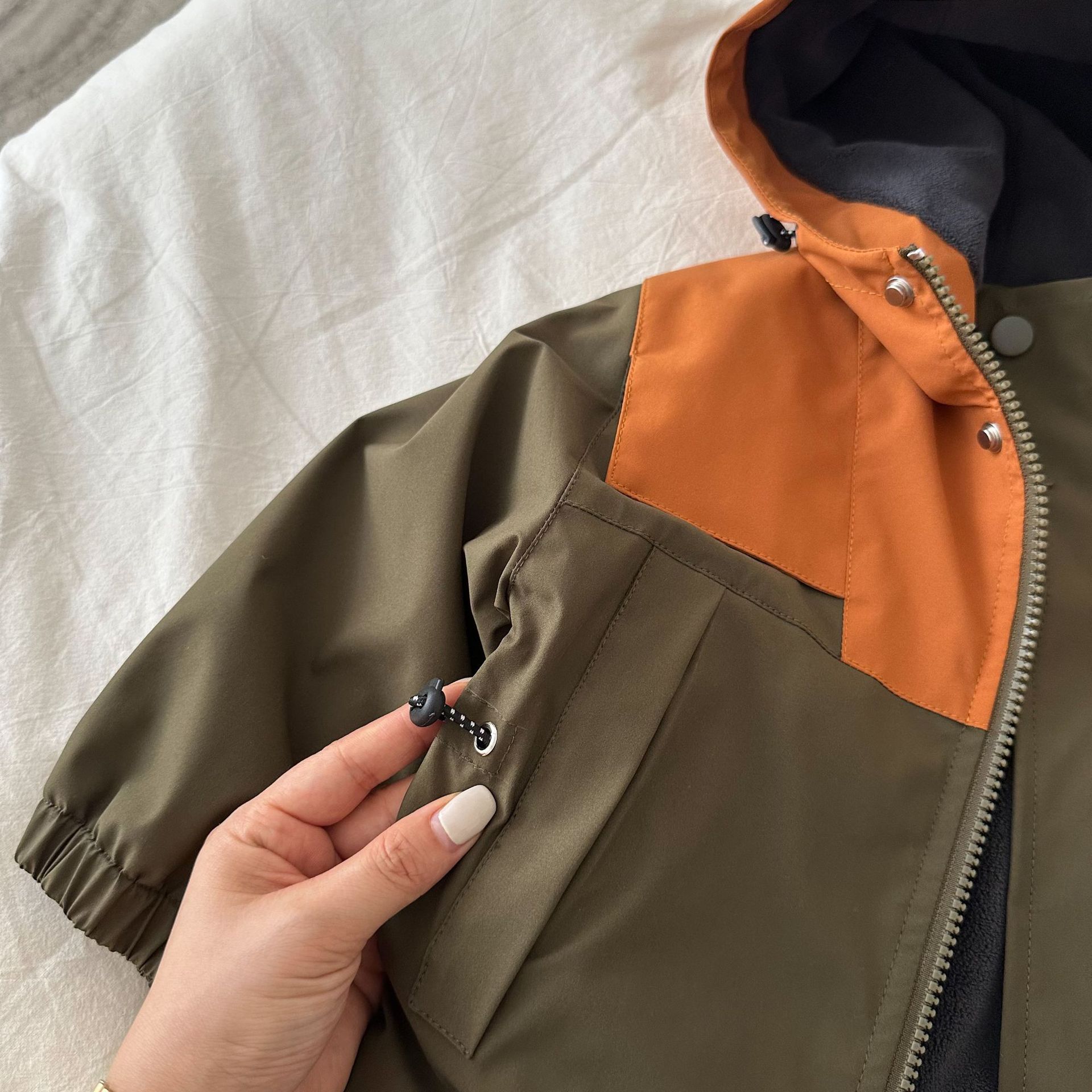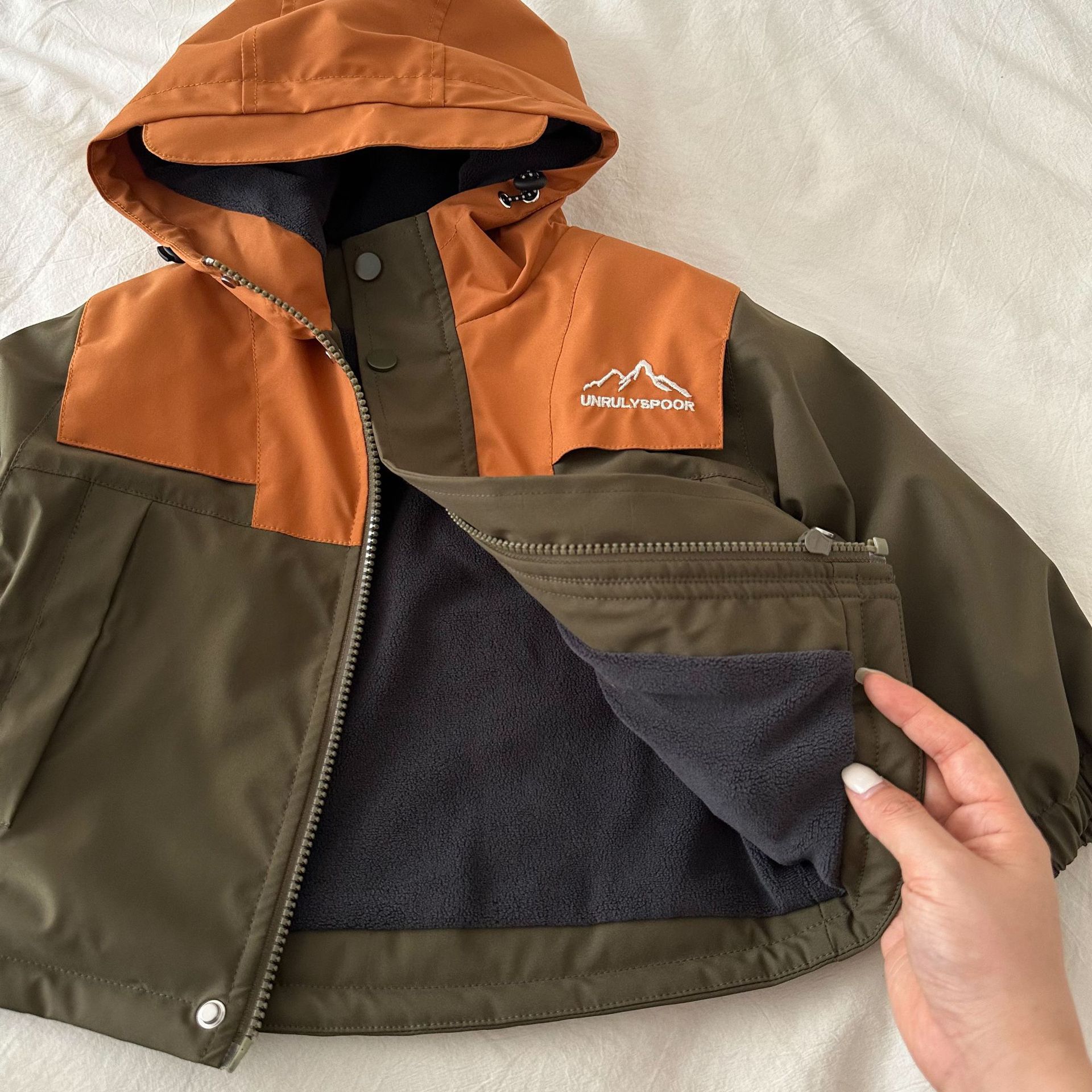 재고 어린이 코트 2024 가을 새로운 남녀 아동복 컬러 매칭 툴링 코트 베이비 후드 패딩 재킷스토어 가기