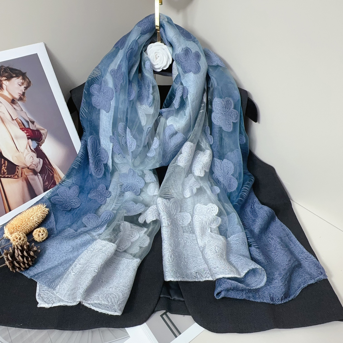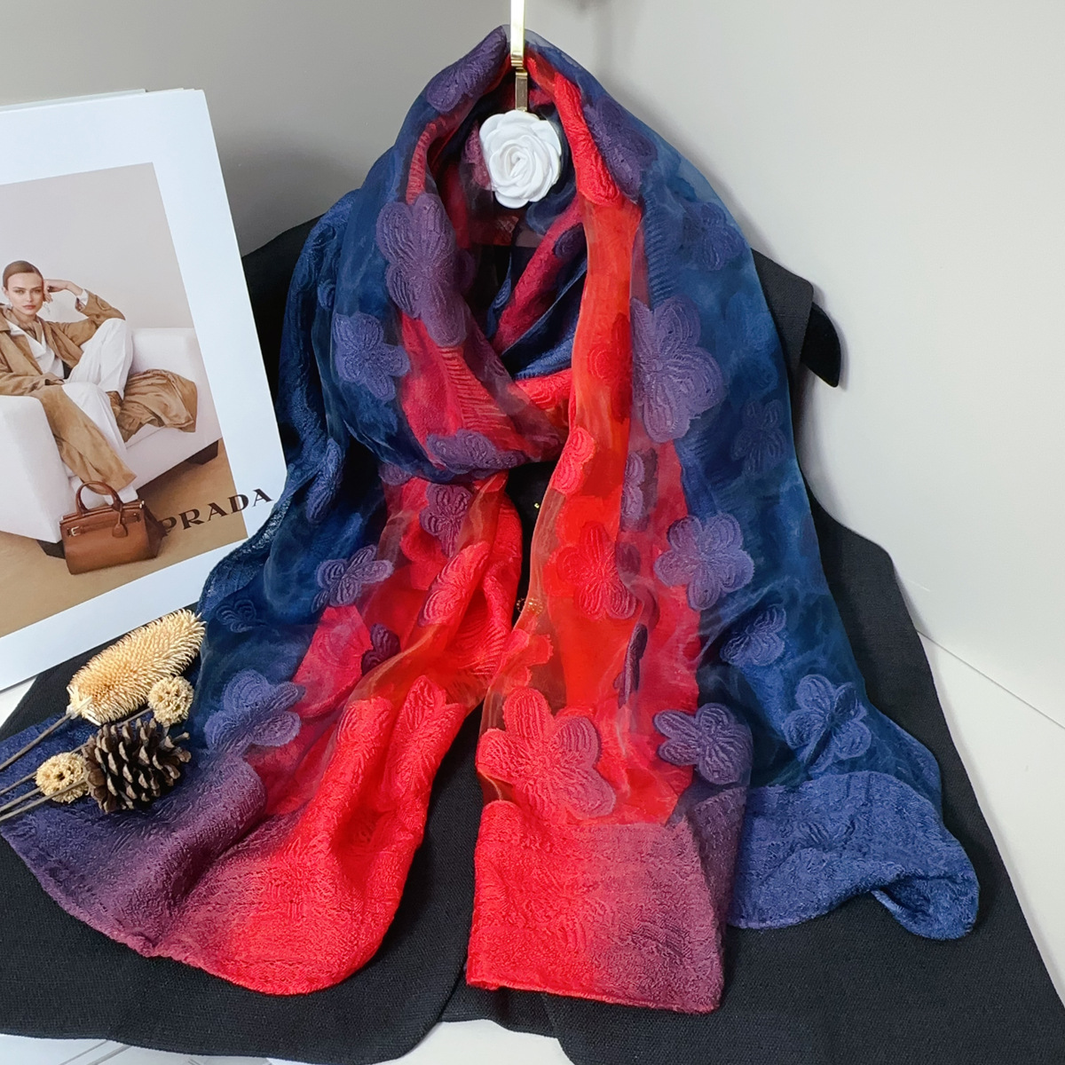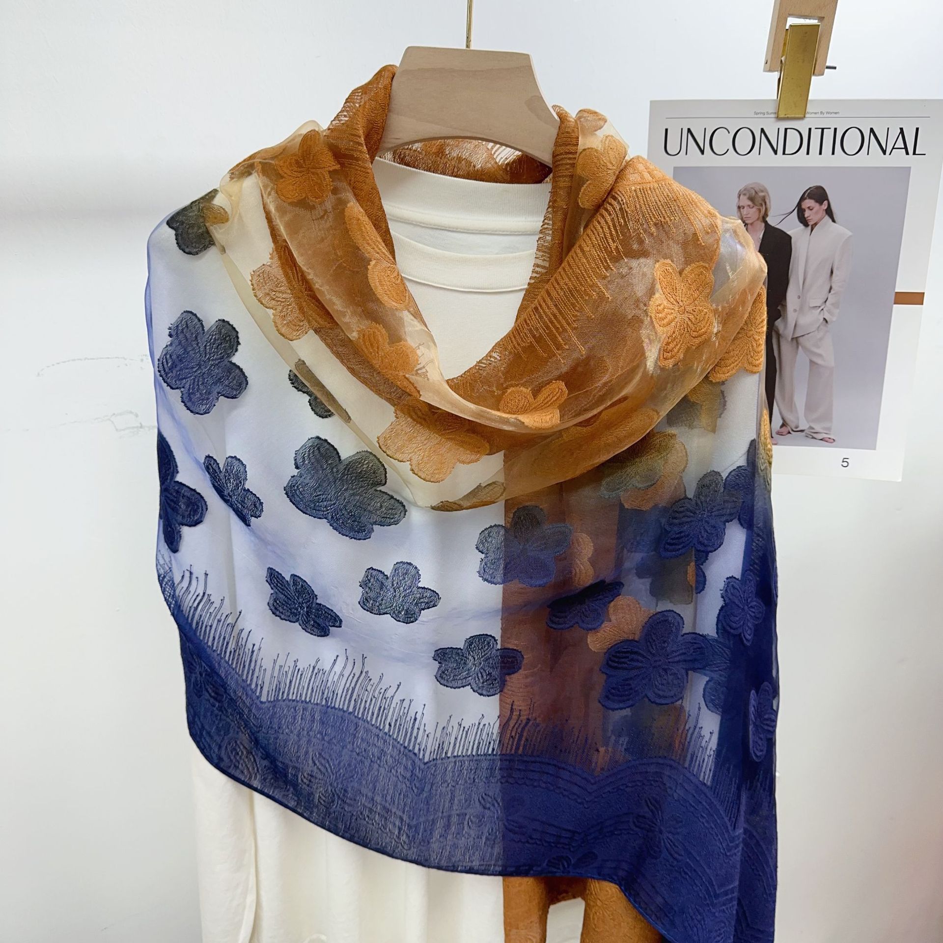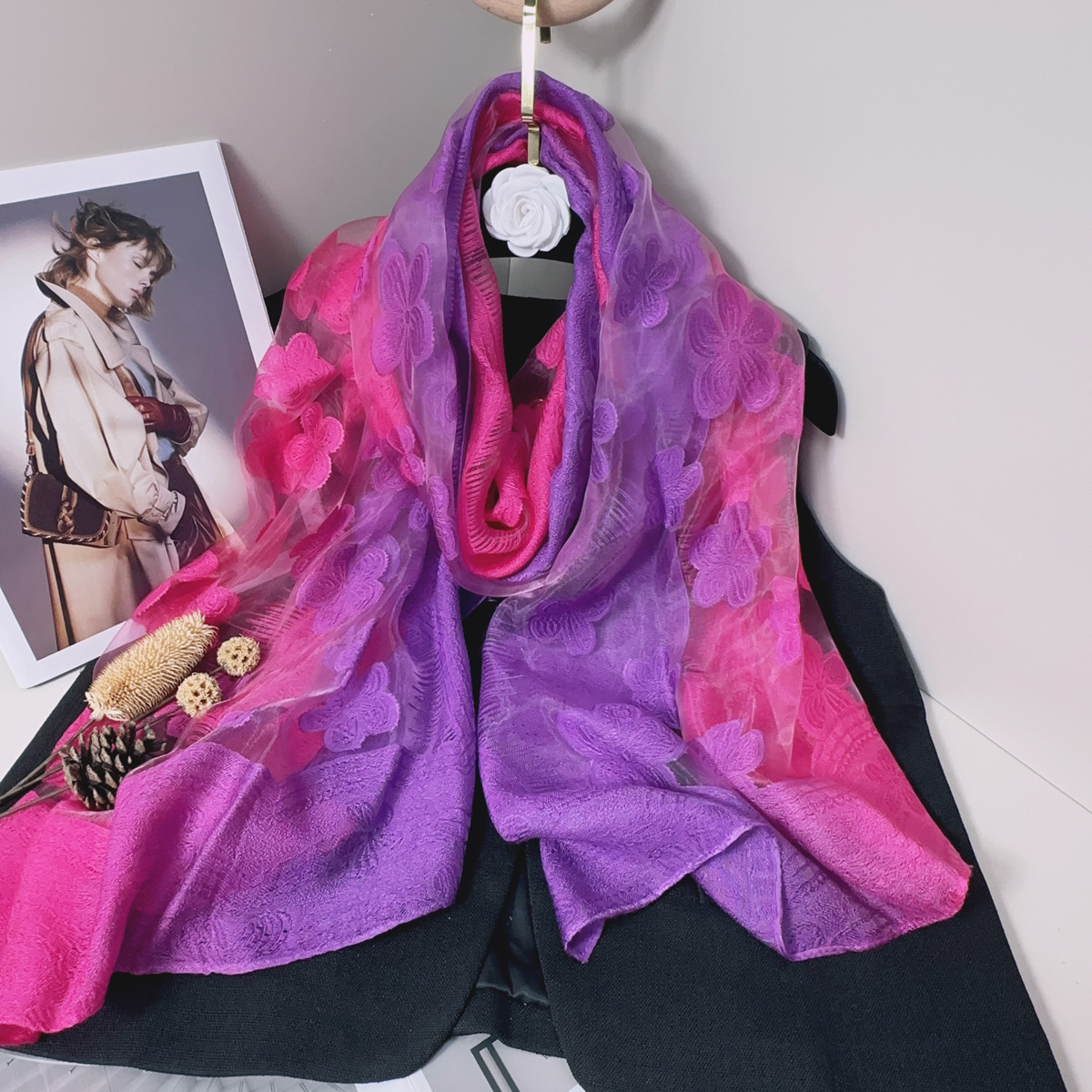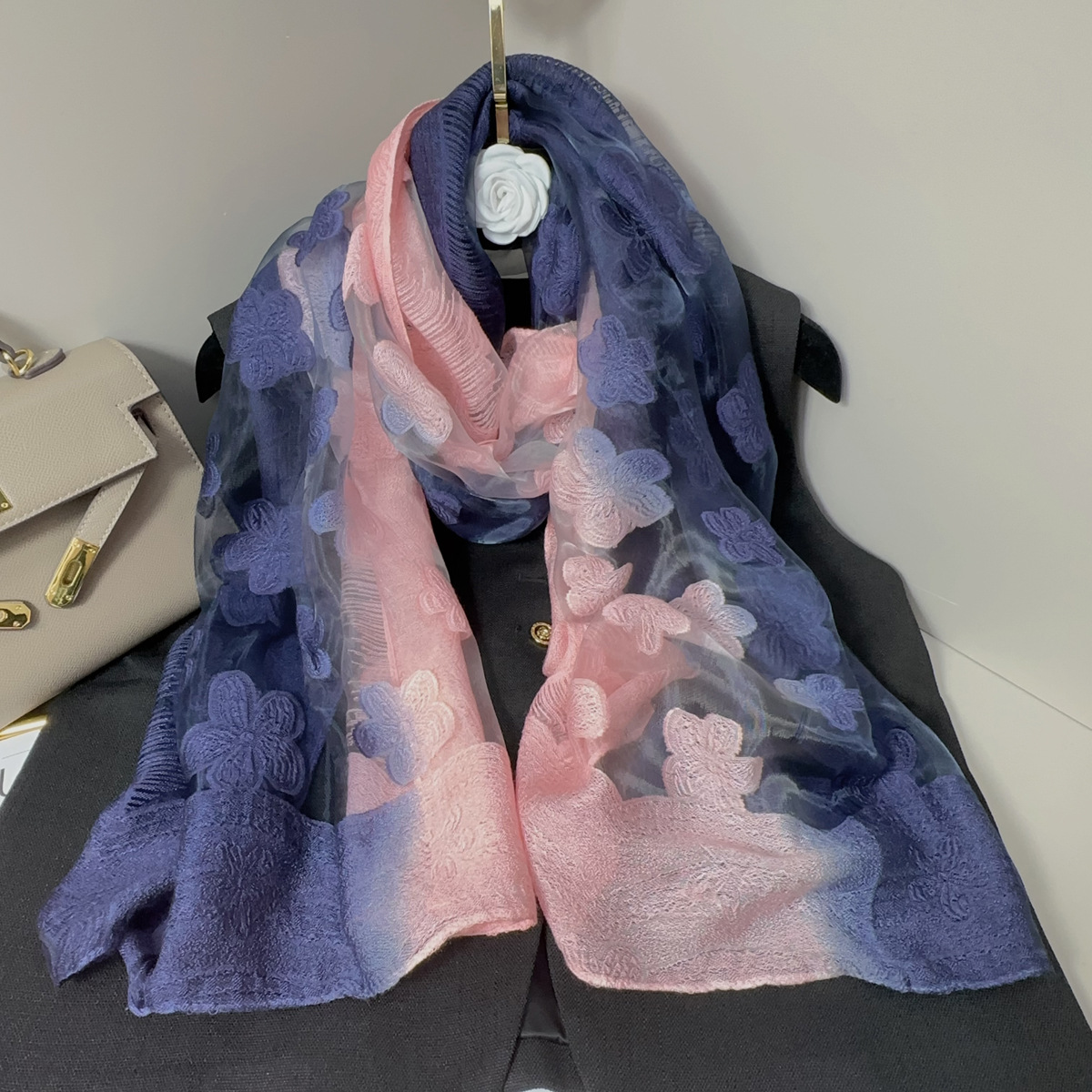 새 스타일 작은 매화 컷 꽃 그라디언트 실크 스카프 긴 하이 엔드 가을 겨울 한국 스타일 올매치 따뜻한 목도리 스카프 여성