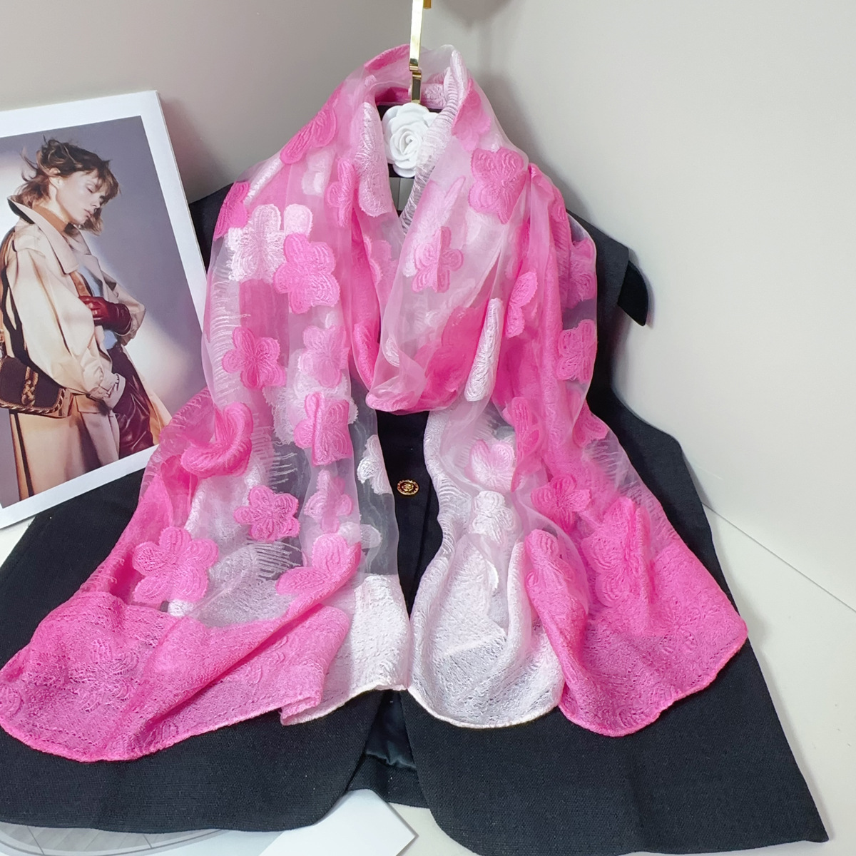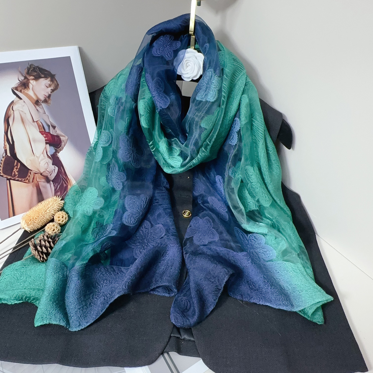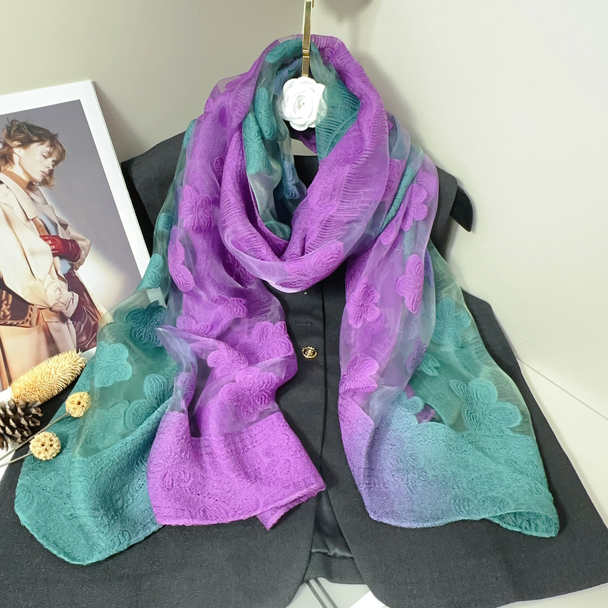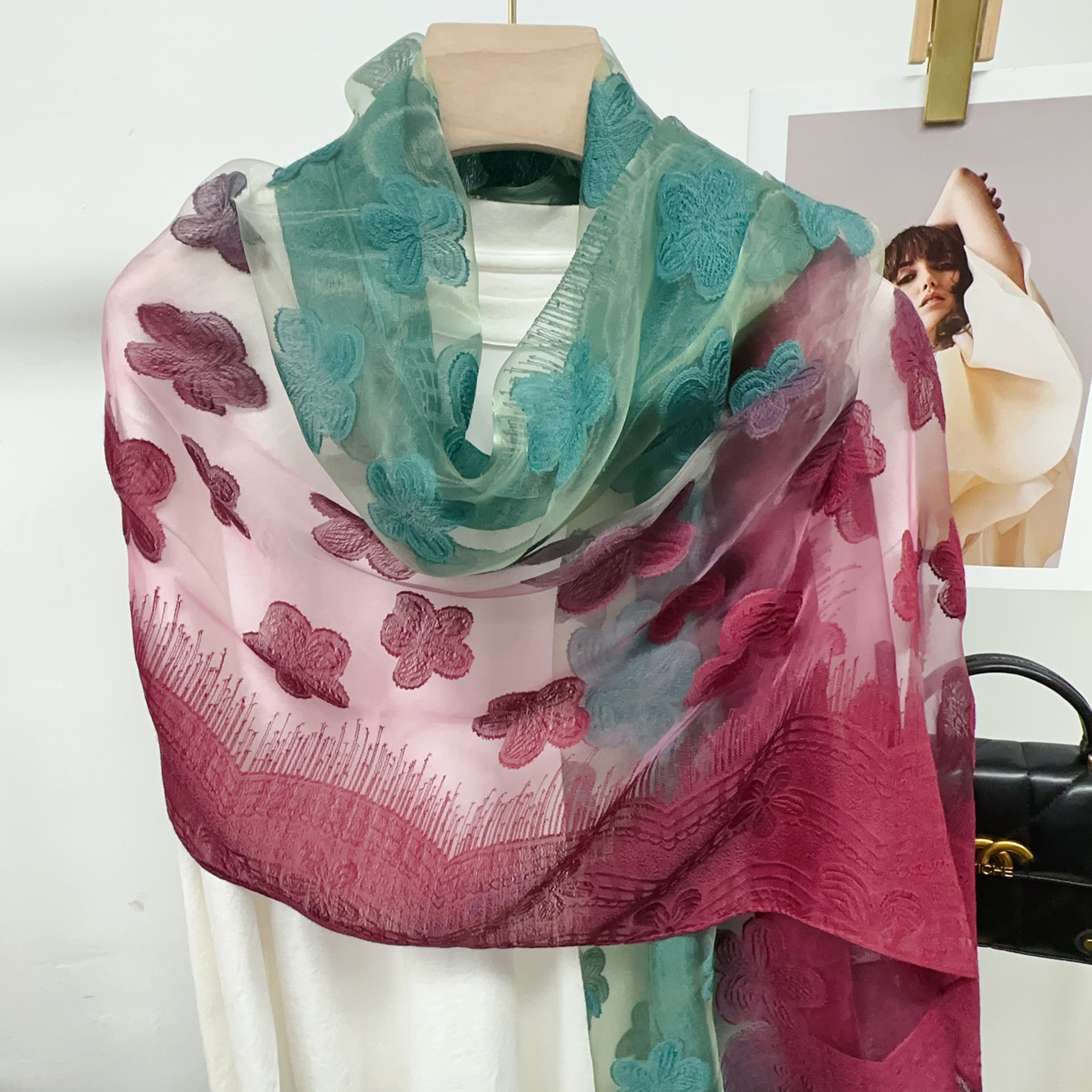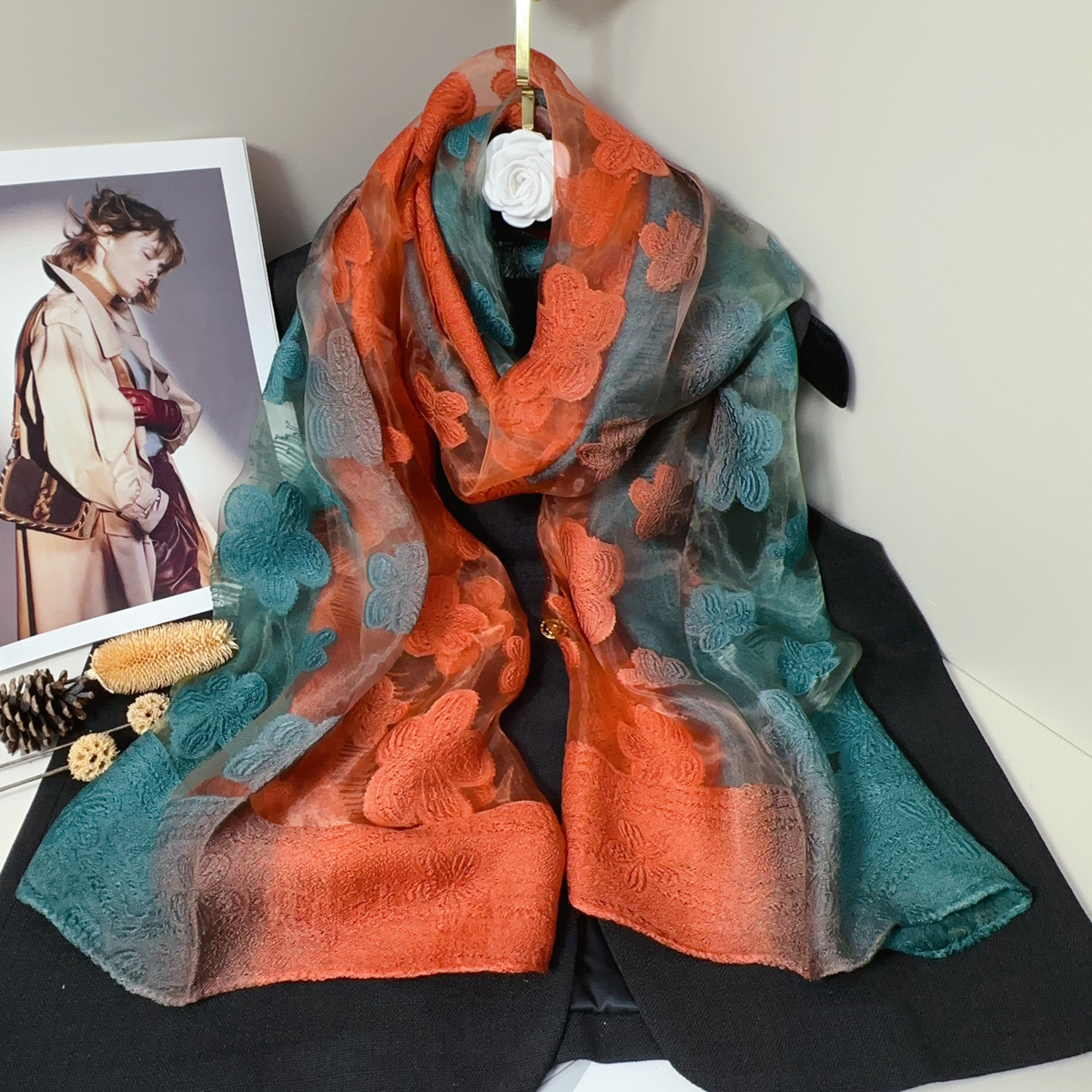 새 스타일 작은 매화 컷 꽃 그라디언트 실크 스카프 긴 하이 엔드 가을 겨울 한국 스타일 올매치 따뜻한 목도리 스카프 여성