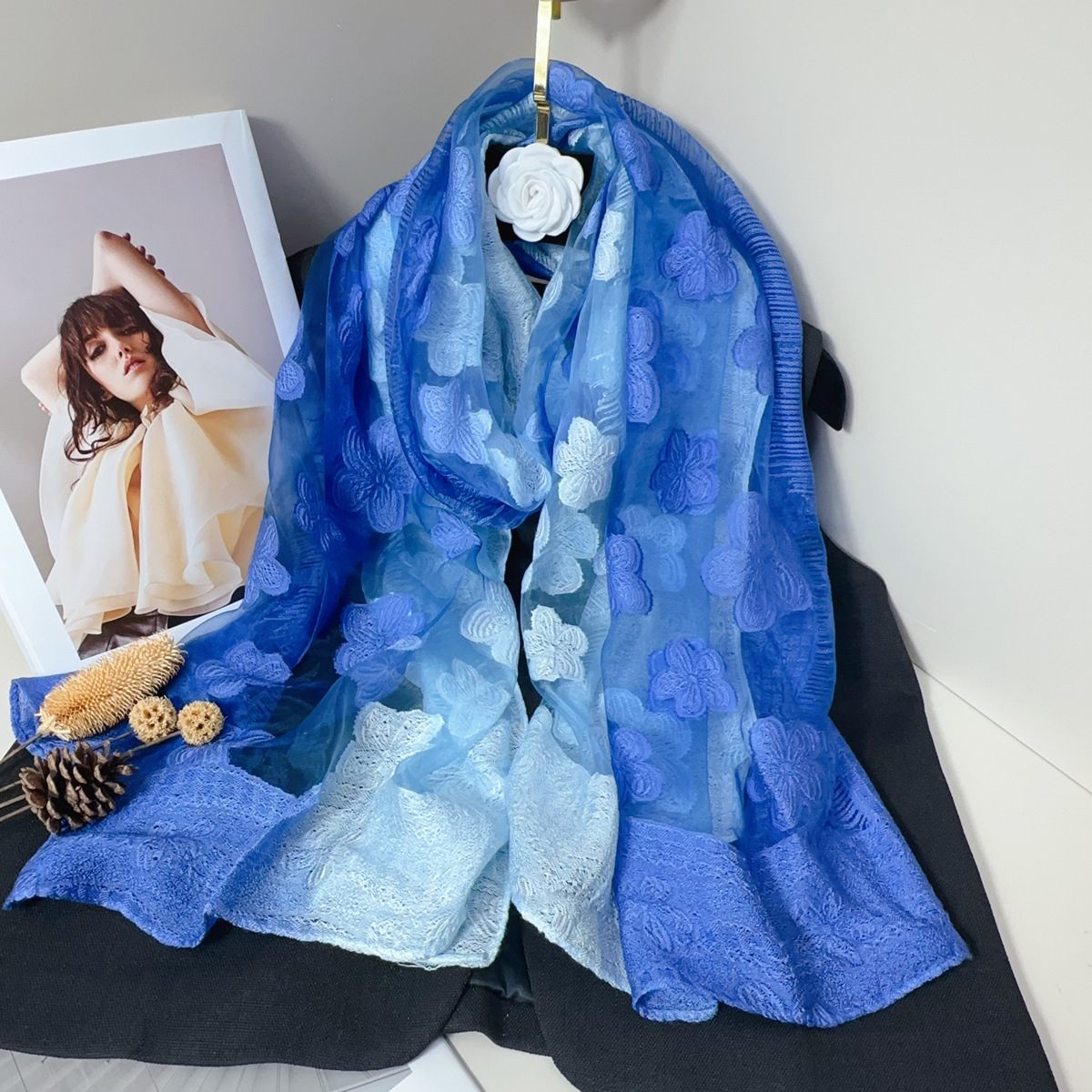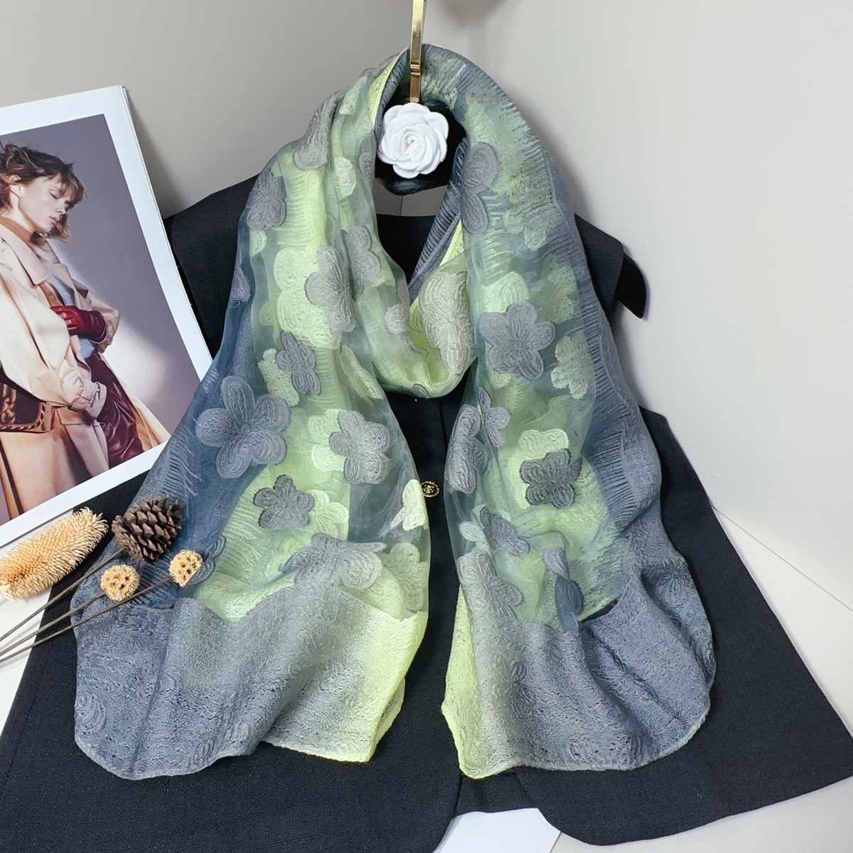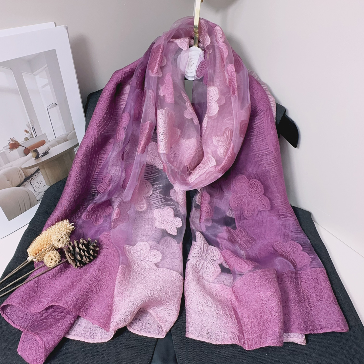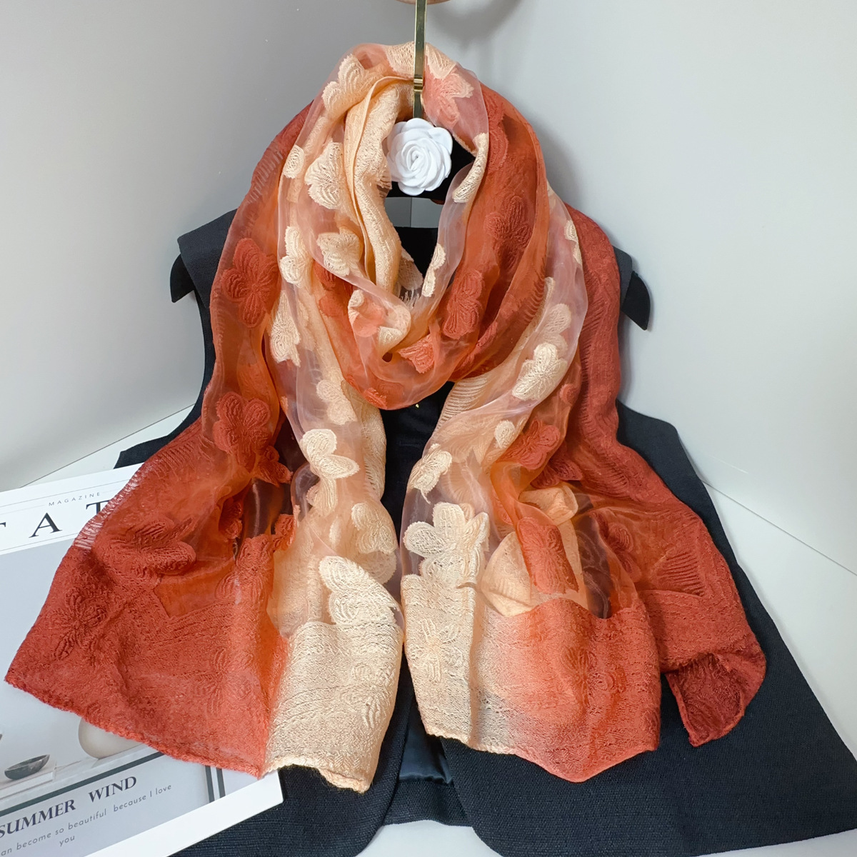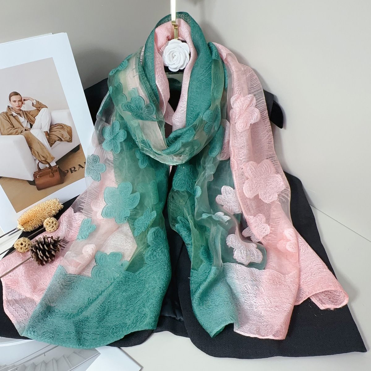새 스타일 작은 매화 컷 꽃 그라디언트 실크 스카프 긴 하이 엔드 가을 겨울 한국 스타일 올매치 따뜻한 목도리 스카프 여성