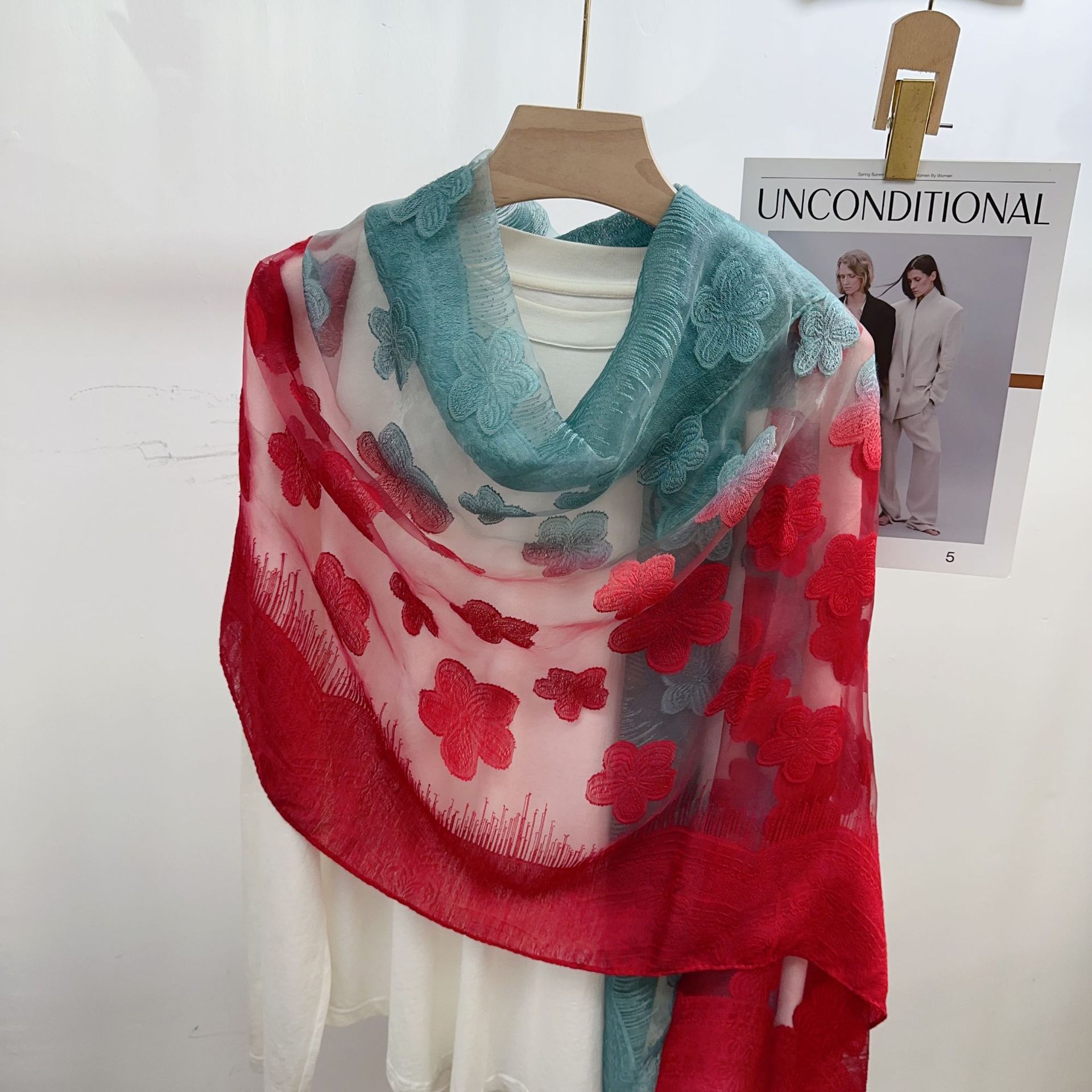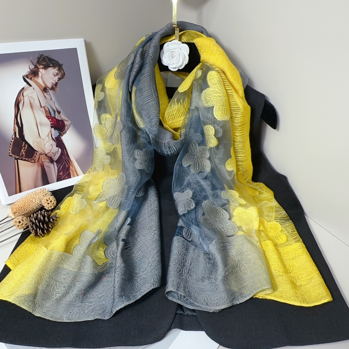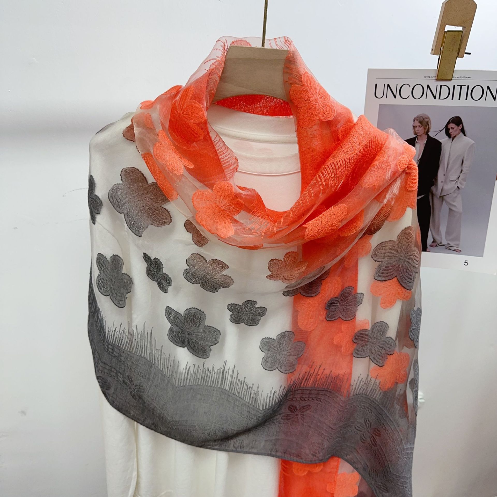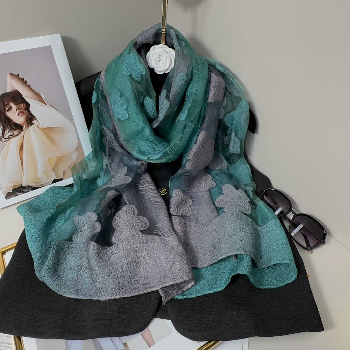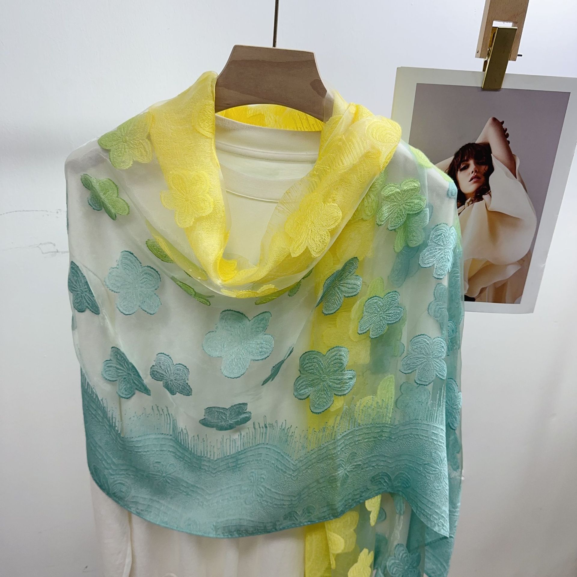 새 스타일 작은 매화 컷 꽃 그라디언트 실크 스카프 긴 하이 엔드 가을 겨울 한국 스타일 올매치 따뜻한 목도리 스카프 여성