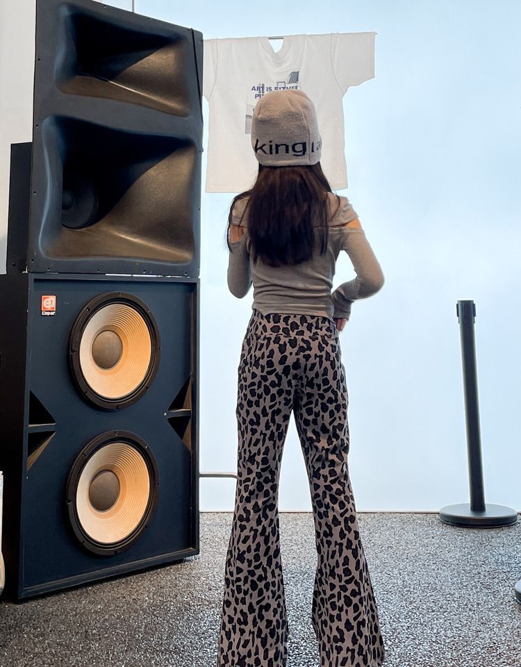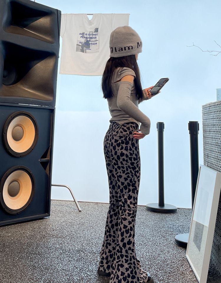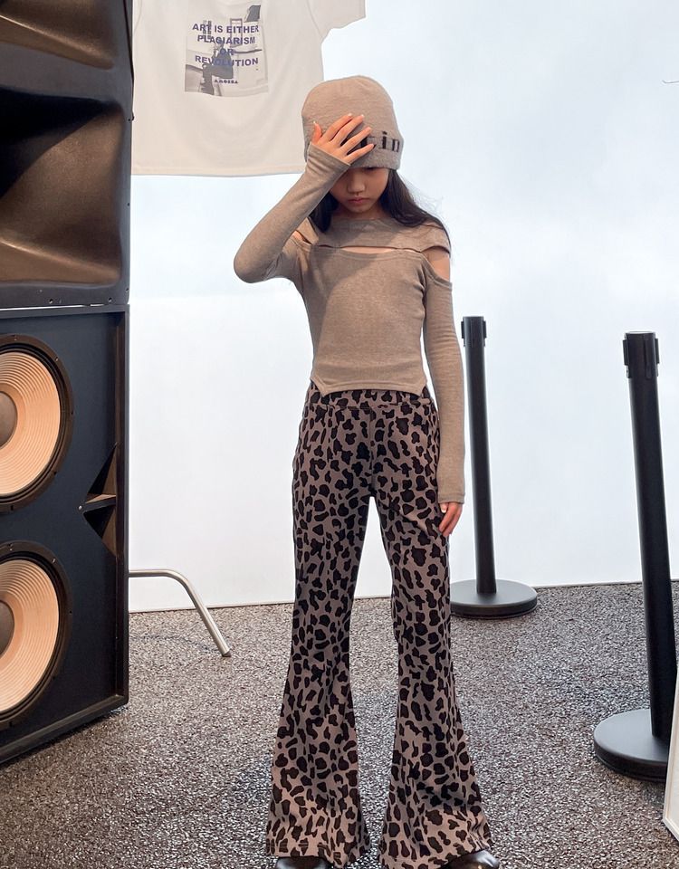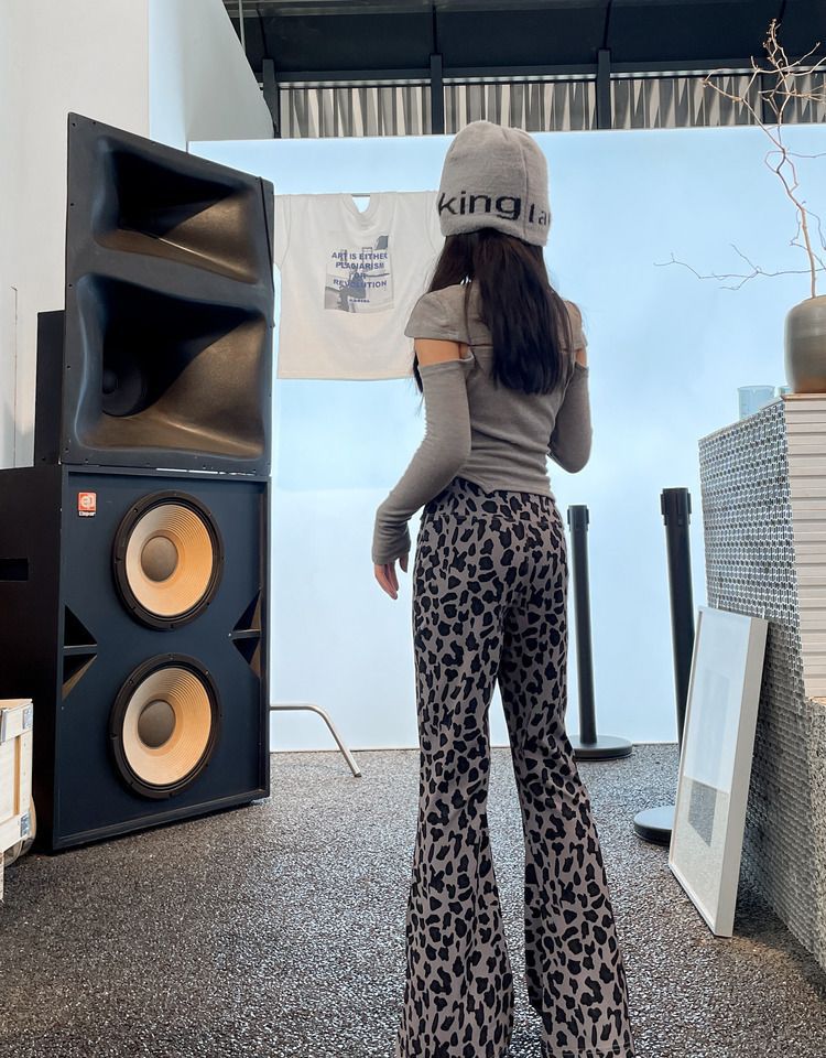 • 그레이 비표준 디자인 롱 T+그레이 레오파드 프린트 플레어 팬츠