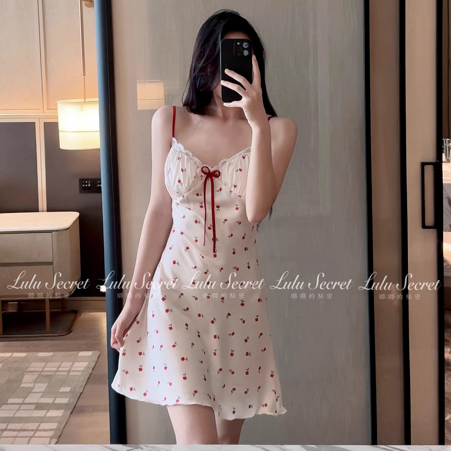 섹시한 잠옷 여성용 아이스 리본 가슴 패드 인쇄 순수한 욕망 실크 얇은 슬링 나이트 가운 홈 의류 크로스 테두리