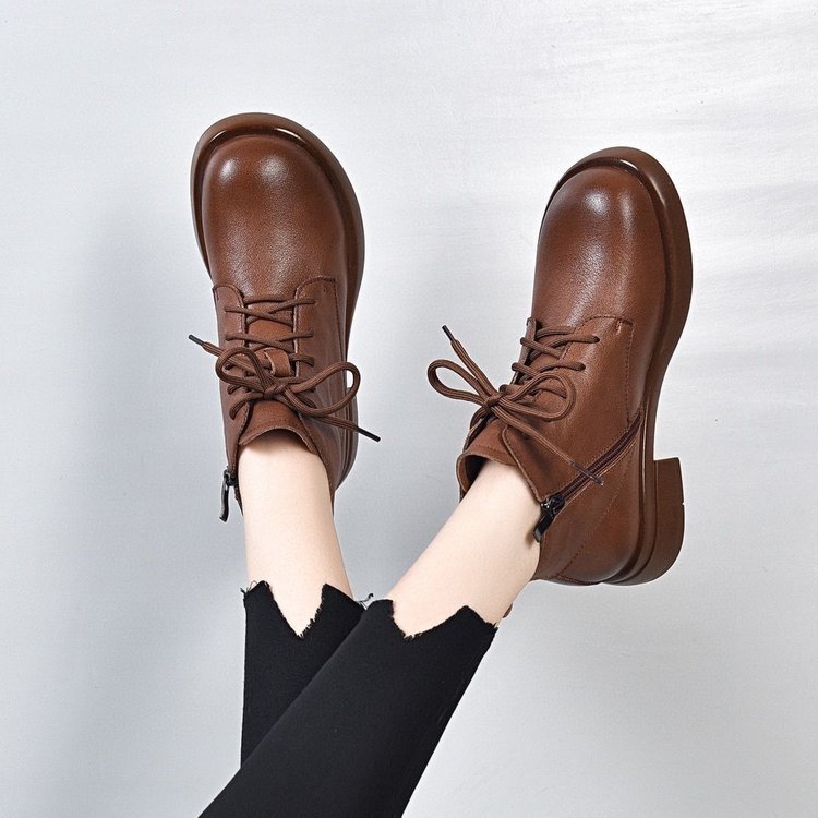 대외 무역 마틴 부츠 여성 부츠 2024 새로운 가을 및 겨울 짧은 부츠 라운드 발가락 로우 힐 소프트 가죽 소프트 하단 짧은 부츠 우아한 코튼 부츠
