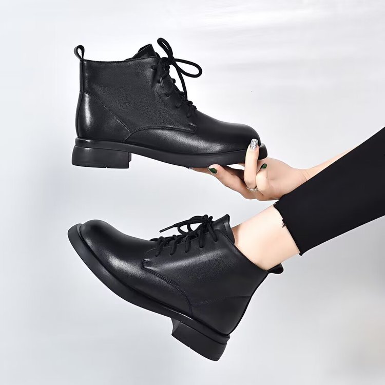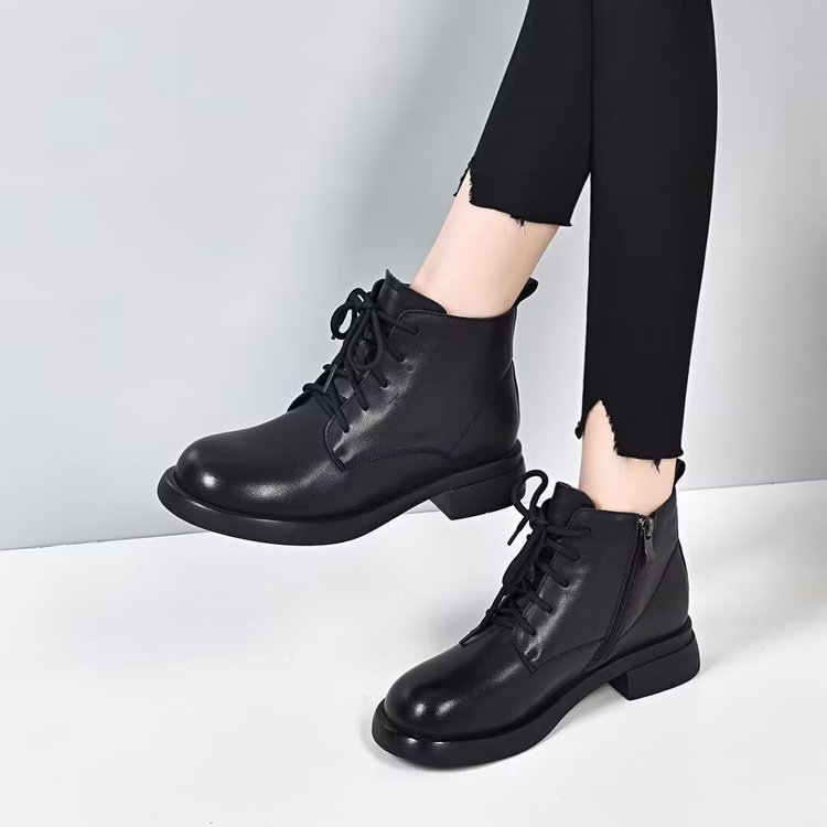 대외 무역 마틴 부츠 여성 부츠 2024 새로운 가을 및 겨울 짧은 부츠 라운드 발가락 로우 힐 소프트 가죽 소프트 하단 짧은 부츠 우아한 코튼 부츠스토어 가기