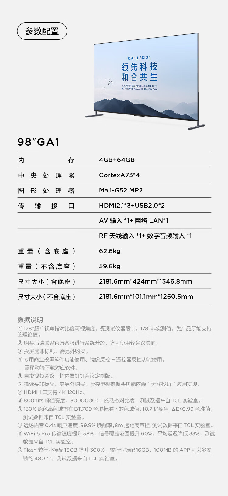 TCL 98 인치 지능형 네트워크 TV 거대한 스크린 사무실 멀티 스크린 대화 형 회의 98GA1