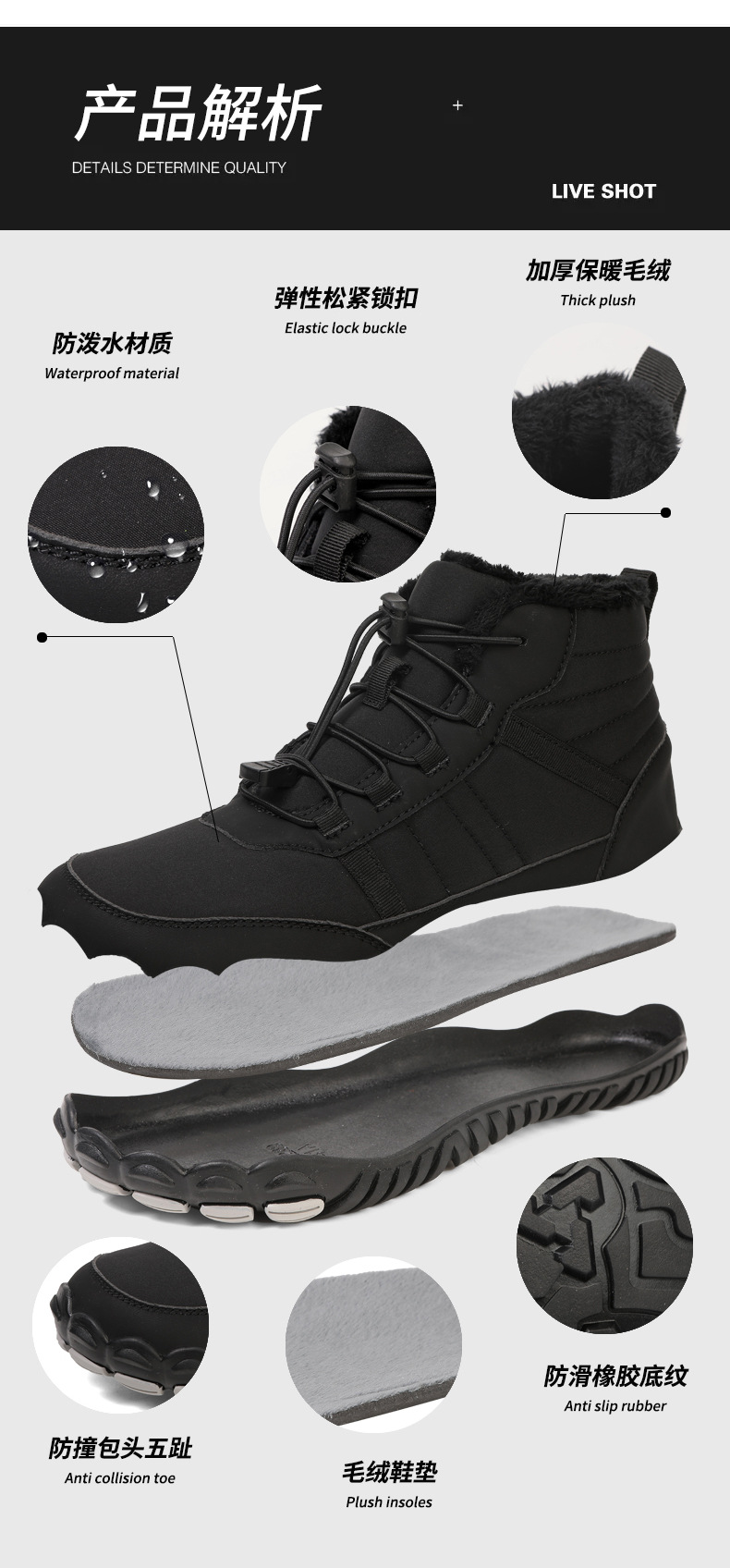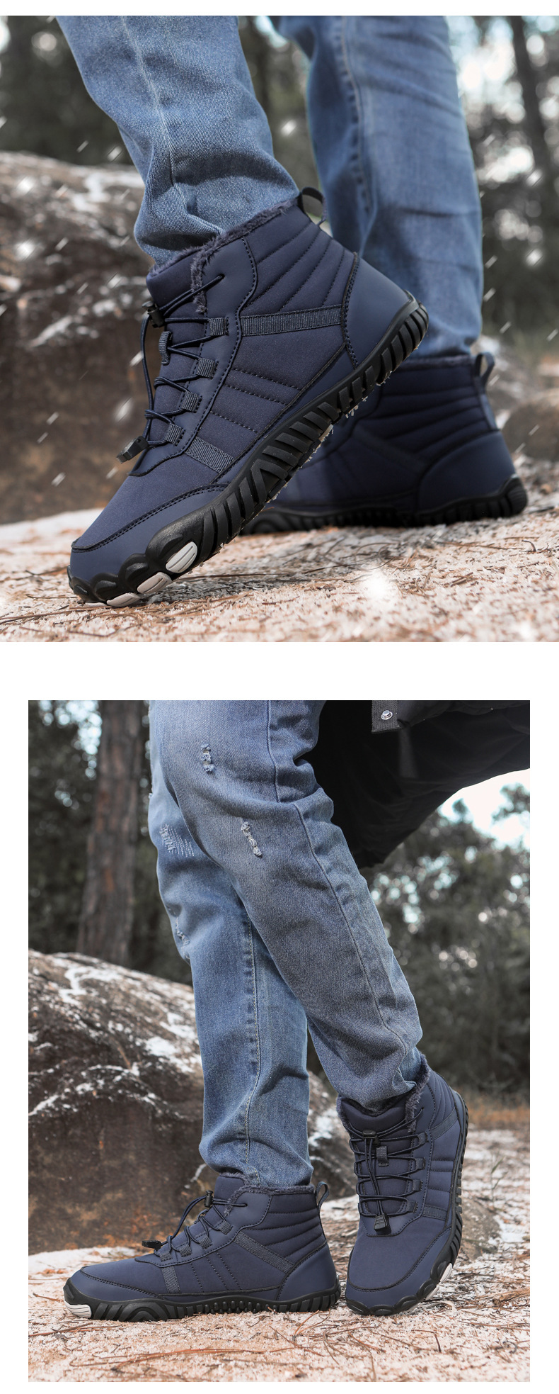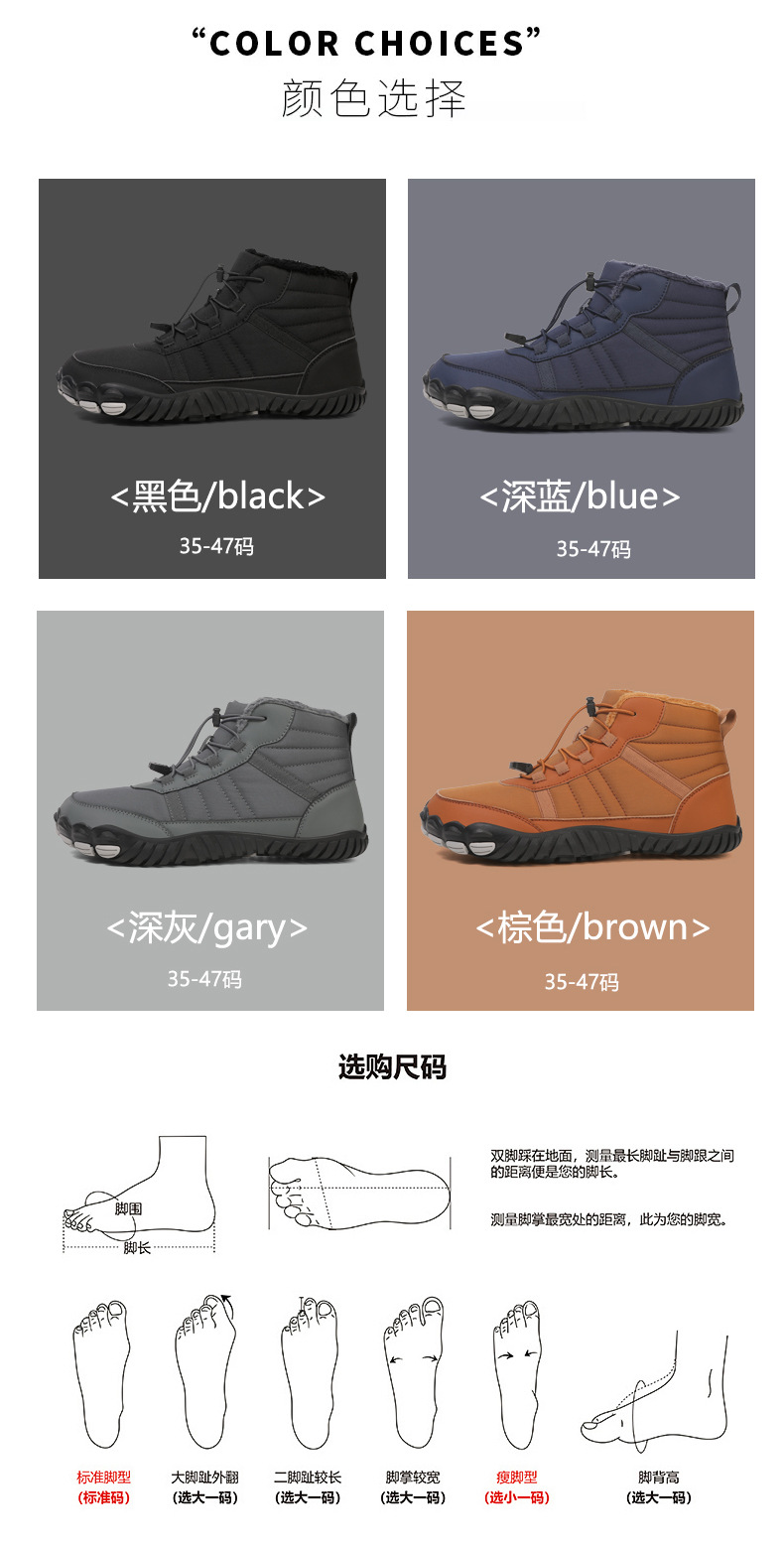 국경 간 야외 스노우 부츠 남성용 미끄럼 방지 방수 기모 따뜻한 다섯 손가락 신발면 패딩 신발 여성의 두꺼운 밑창 맨발 겨울 부츠