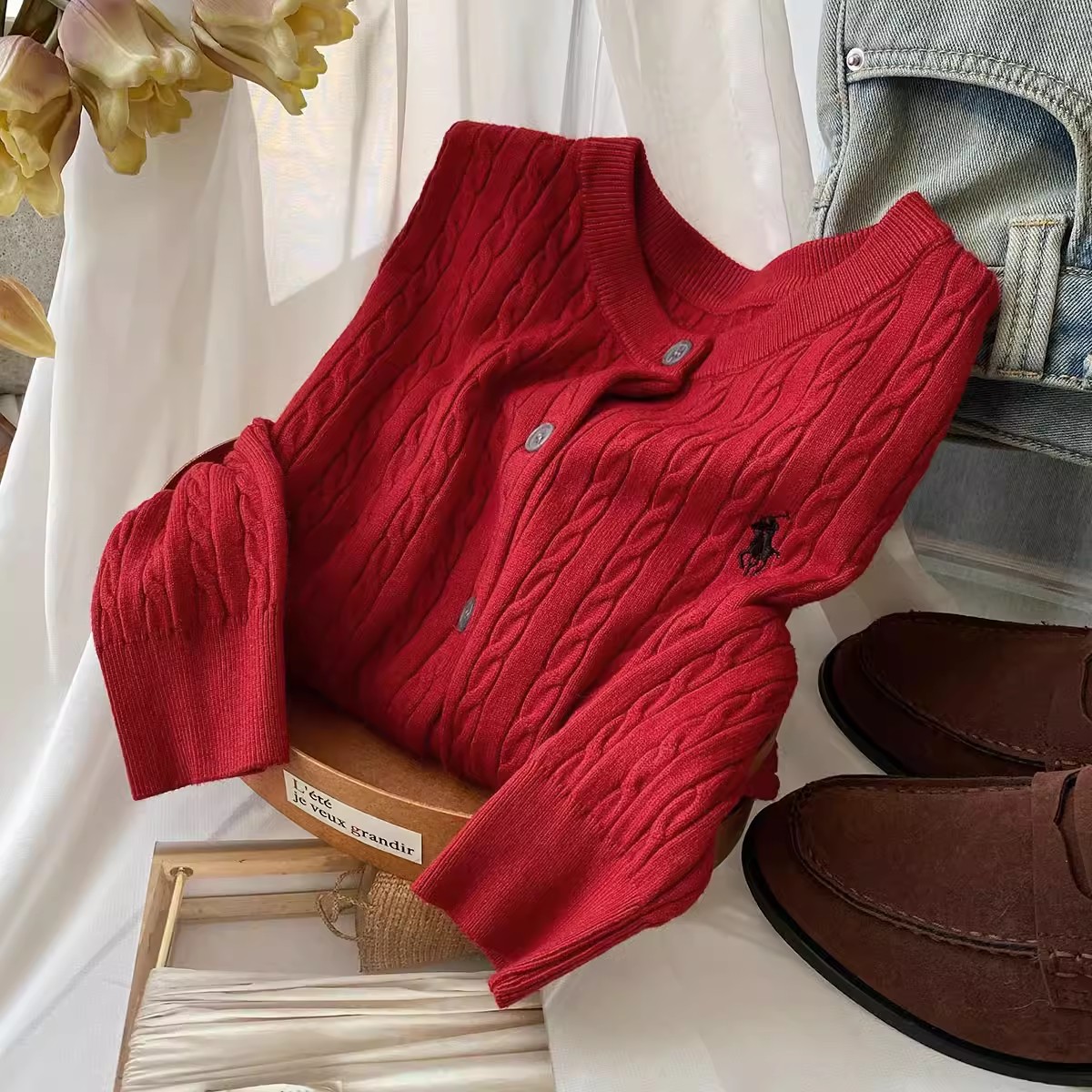 두꺼운 오래된 Qian Feng Pony 자수 트위스트 니트 카디건 여성 가을 및 겨울 초가을 빈티지 라운드 넥 레드 스웨터 재킷