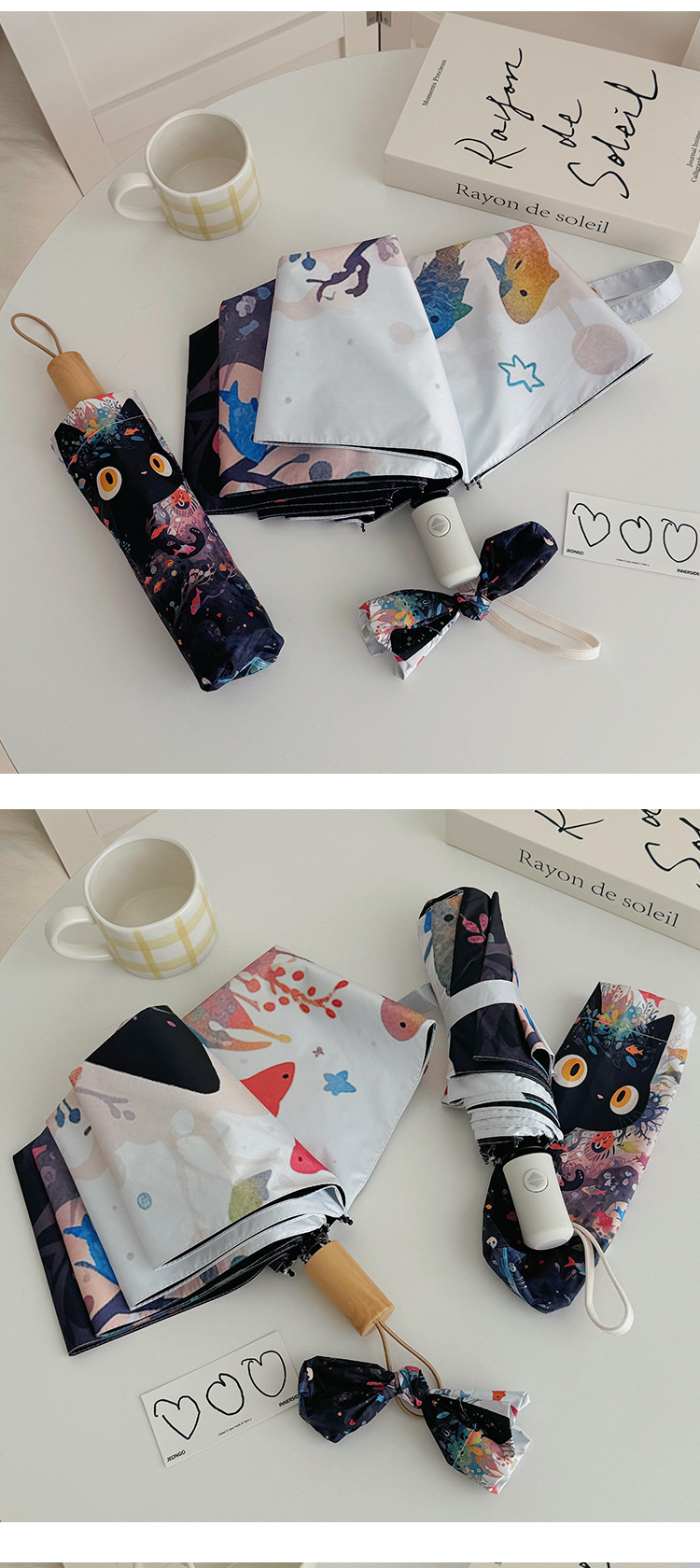 귀여운 만화 고양이 접히는 우산 태양 보호 UV 보호 검은 우산 맑고 비 이중 목적 자동 양산 우산