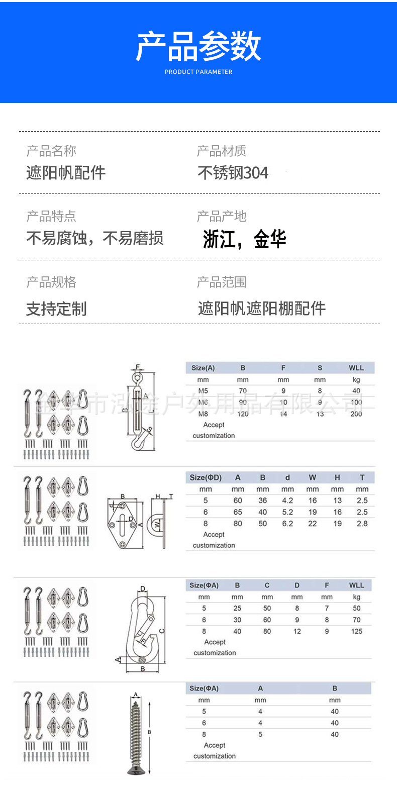 不锈钢遮阳帆配件:金属部分为不锈钢304材质
