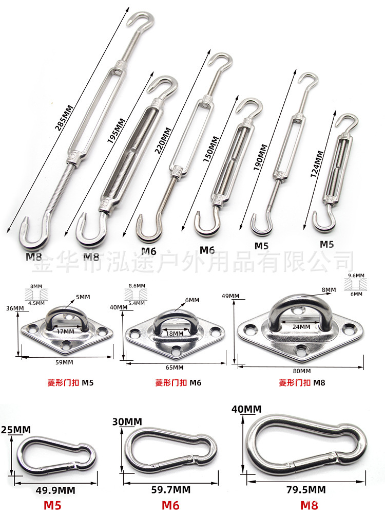 标准配置为:弹簧钩2只,菱形扣4只,拉紧器2只,螺钉16只,膨胀套16只